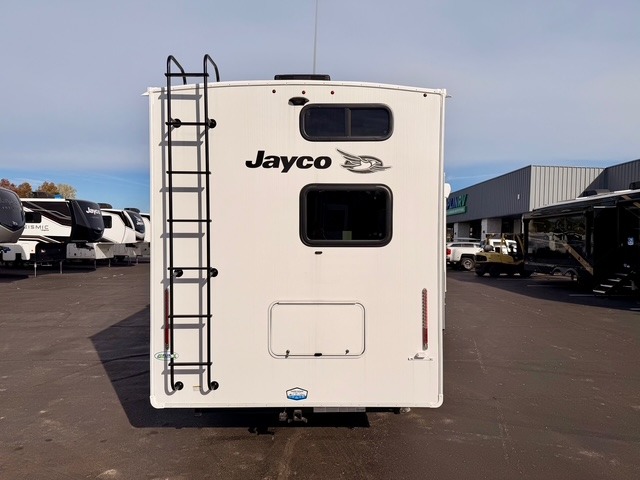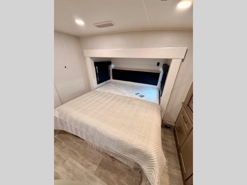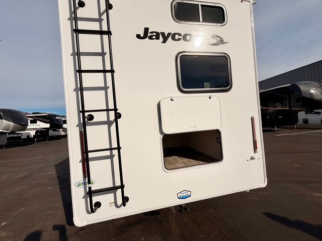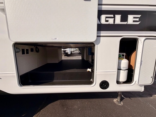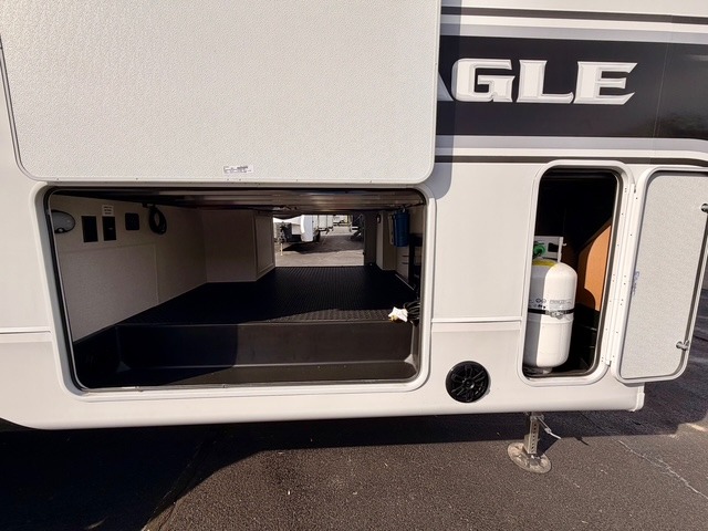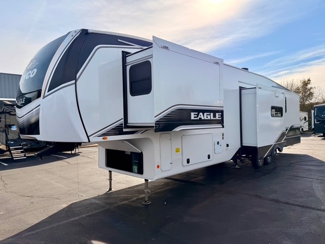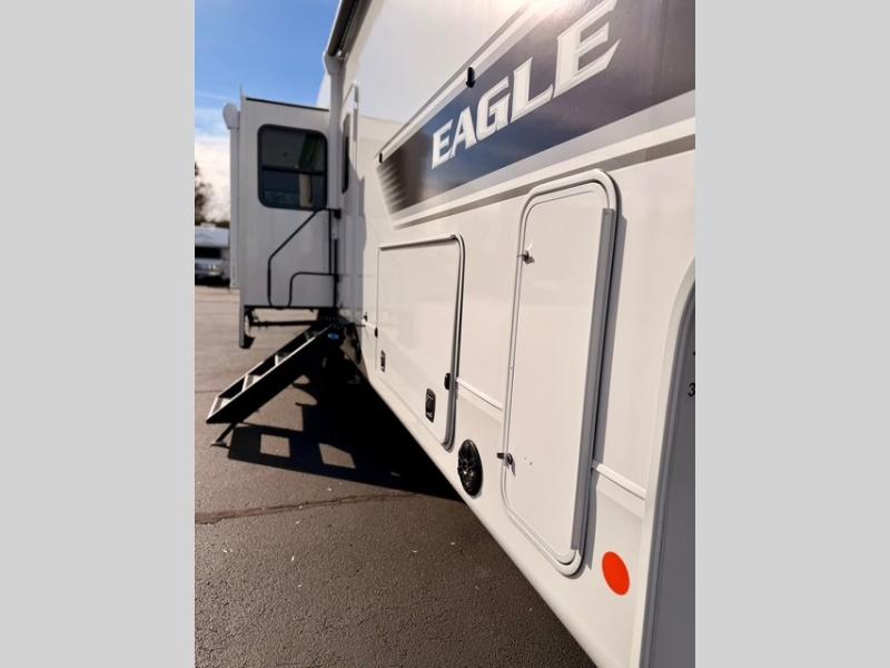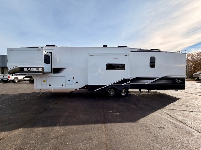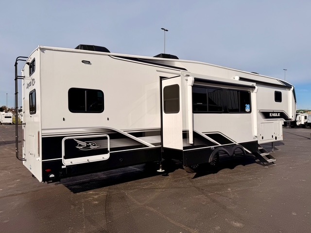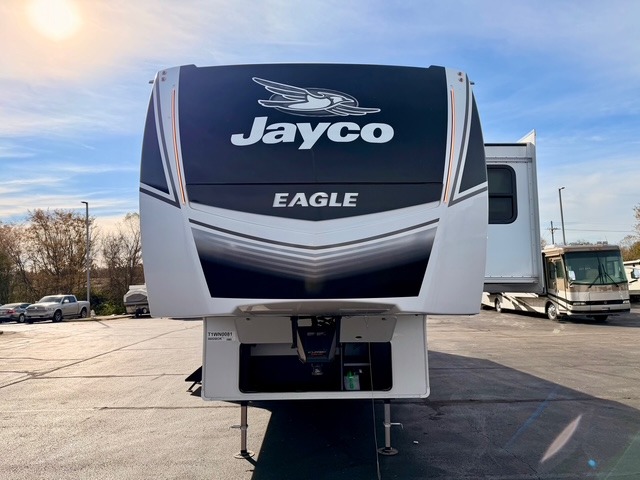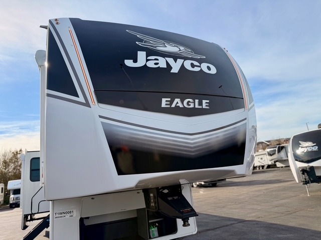 Jayco Eagle fifth wheels are built for durability and luxury. Stronghold VBL™ laminated walls and the Magnum Truss™ roof ensure strength without adding excessive weight, while the 5 Star Handling Package delivers smooth towing and stability. Climate Shield zero-degree tested weather protection and the industry-exclusive HELIX cooling system with dual 15,000 BTU Whisper Quiet A/C units keep you comfortable in any season. Additional conveniences include pass-through storage with slam-latch baggage doors, an automotive-style front cap with MaxTurn radius, solid hardwood slide fascia, residential vinyl flooring throughout, 100% no floor vents, and blackout roller shades with reflective sides for privacy and insulation, making this fifth wheel ideal for extended trips or full-time living.