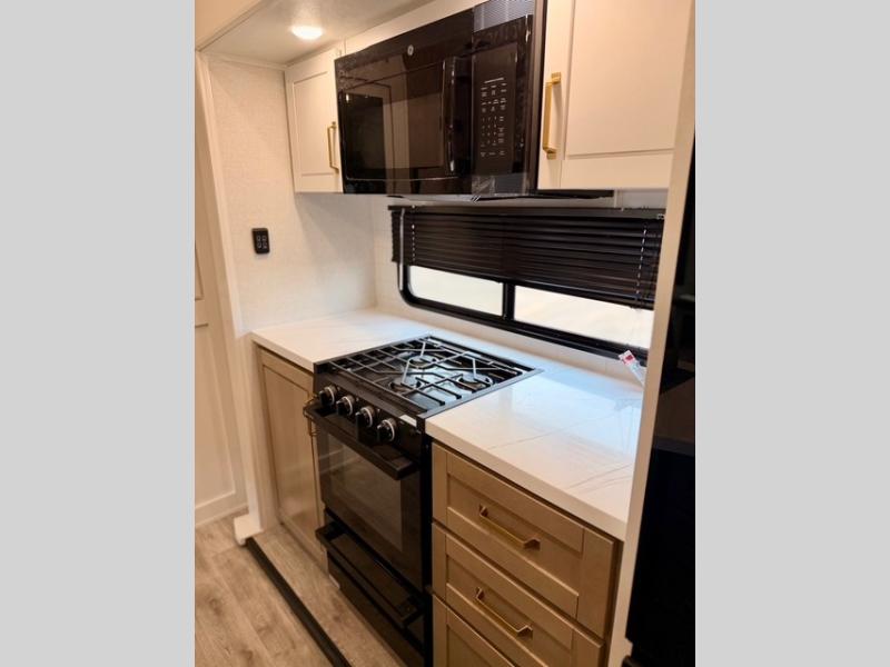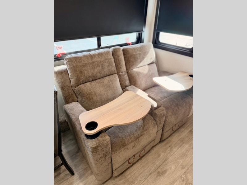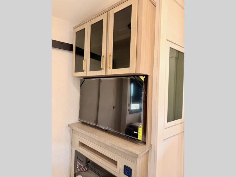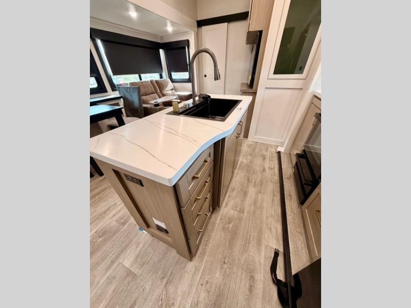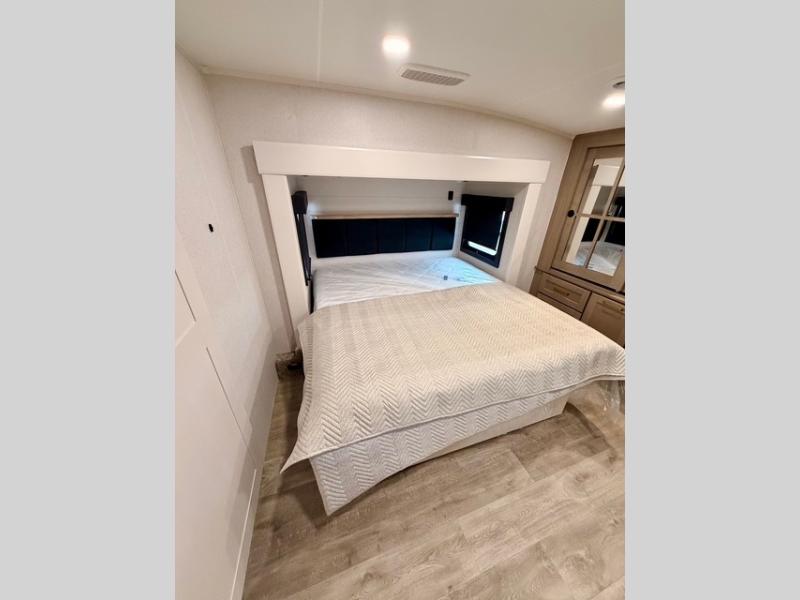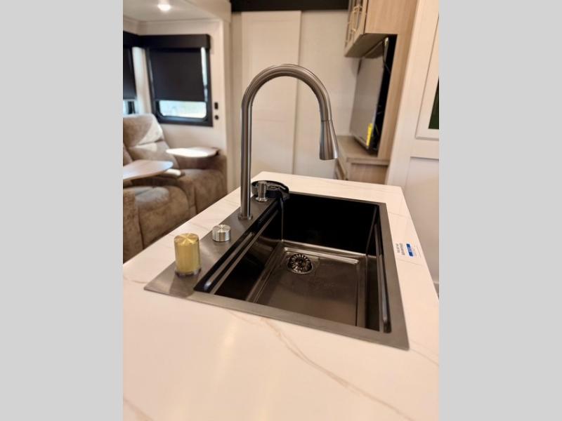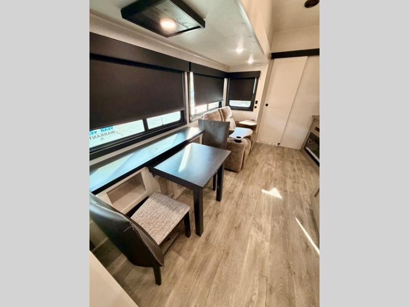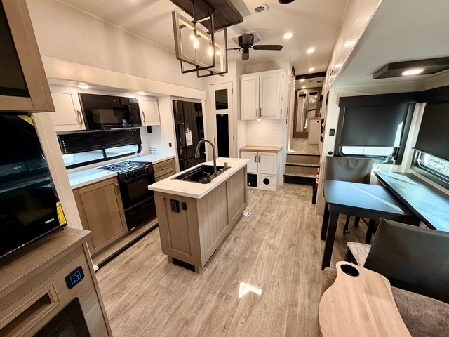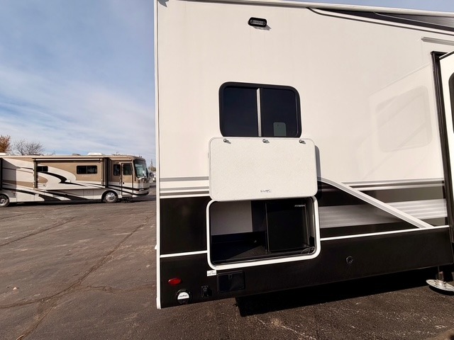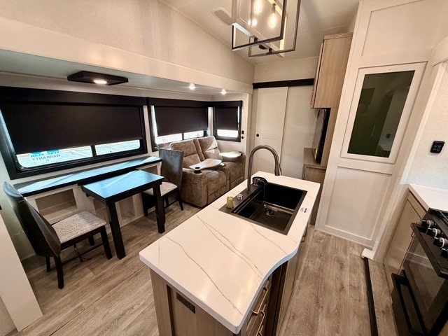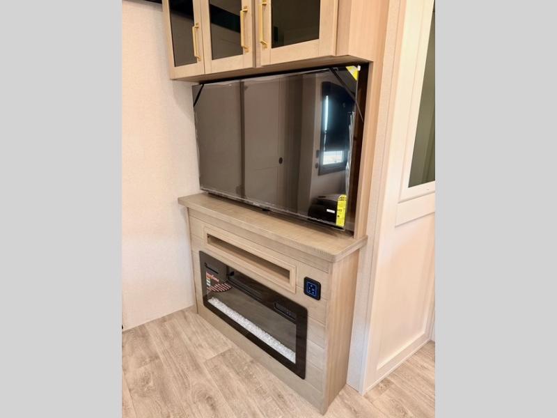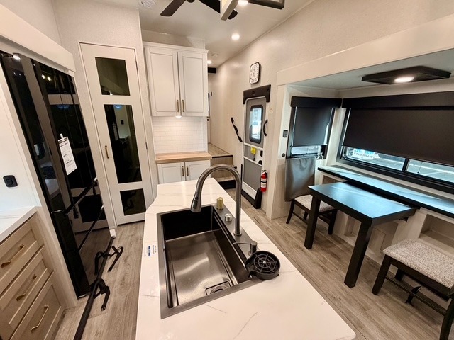This fifth wheel is loaded with features designed for comfort and convenience on every trip! The dual opposing slides in the main living area create a spacious open floorplan, making it easy to move around while entertaining or relaxing. The kitchen island with a multi-functional sink and pull-out cutting board adds prep space, while the chef will also enjoy a large residential refrigerator, pantry, and overhead cabinets for ample storage. In the living area, theater seats face the entertainment center and fireplace, complemented by a bench and table with chairs for extra seating, all under a 12V ceiling fan that keeps air circulating. The exterior includes a convenient outdoor kitchen with a refrigerator, plus a Jayport with LP quick connect for your grill or other appliances.