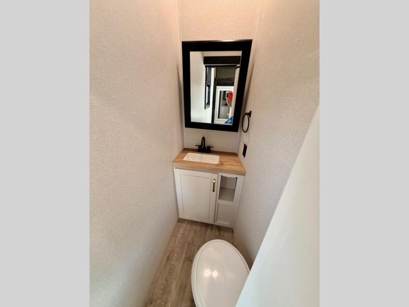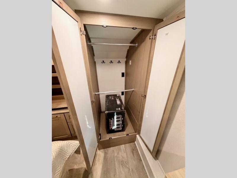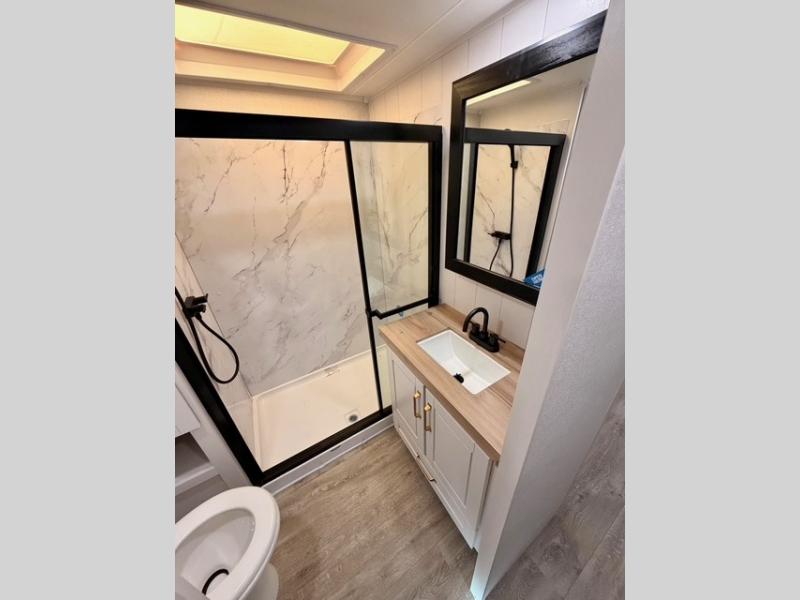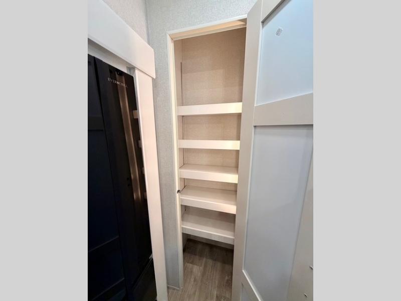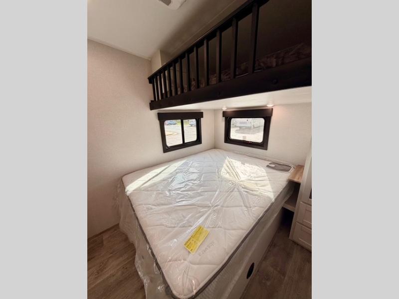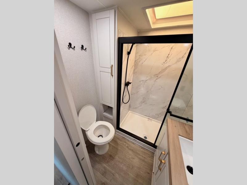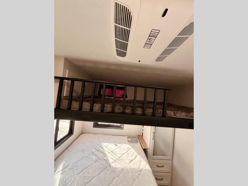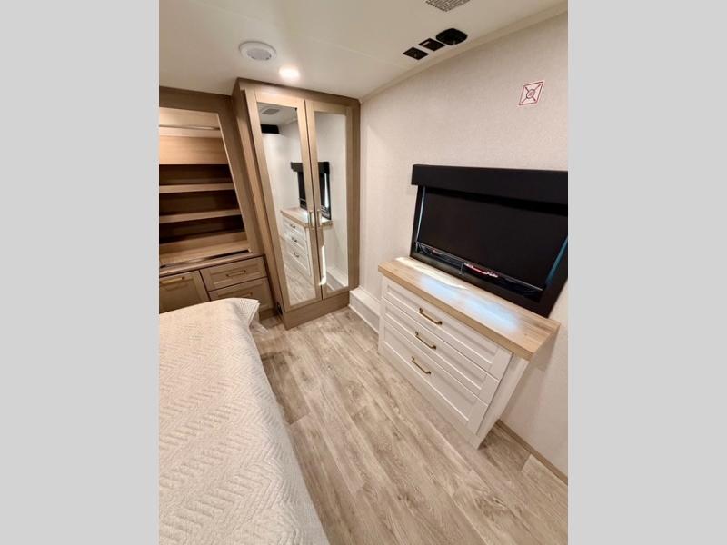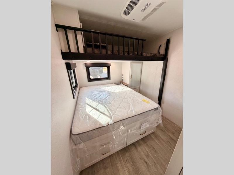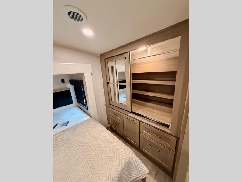 The front private bedroom features a king bed slide out, chest, and a spacious closet with washer and dryer prep, giving you all the comforts of home. In the rear private bunkhouse, the 54" x 74" upper loft bed sits above a 66" x 80" Olympic bed, complete with wardrobe storage drawers and its own half bathroom—perfect for family or guest privacy. The full main bathroom includes a walk-in shower, linen storage, and elegant residential-style fixtures for convenience.