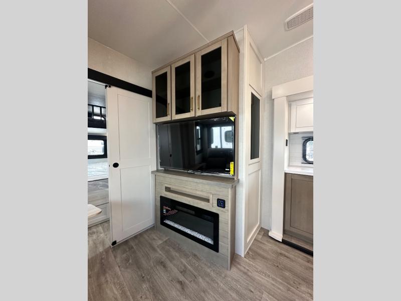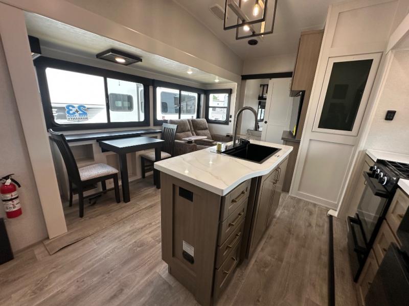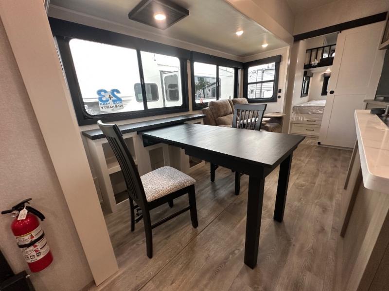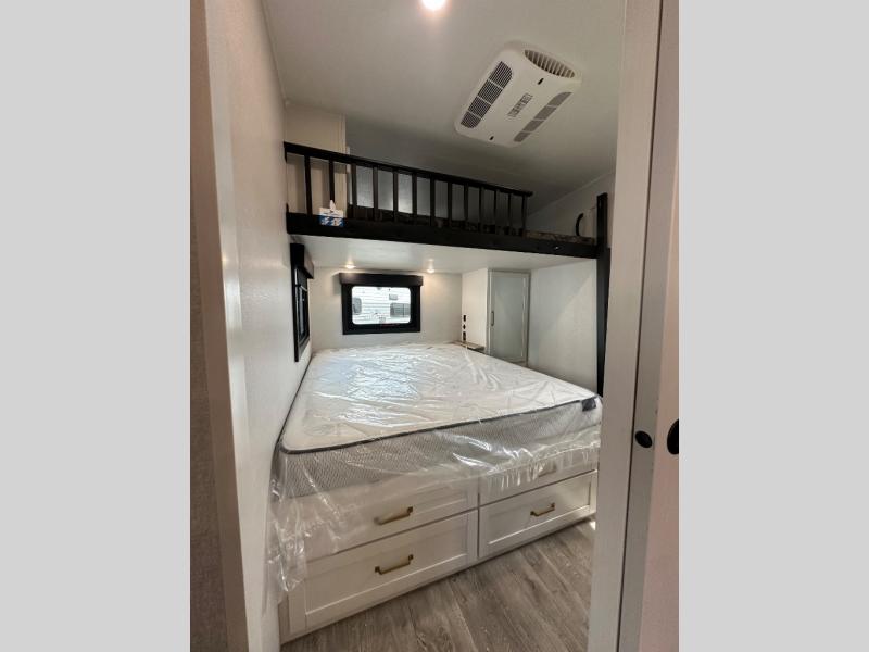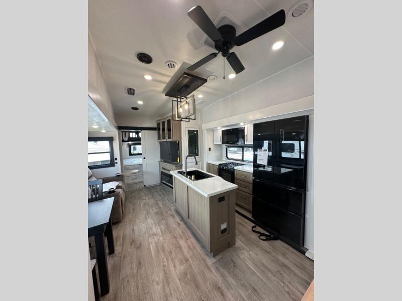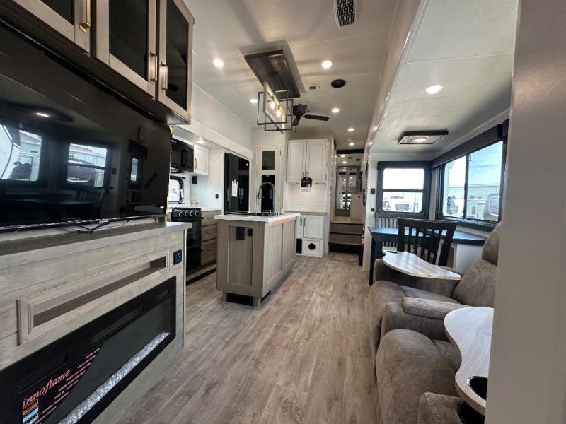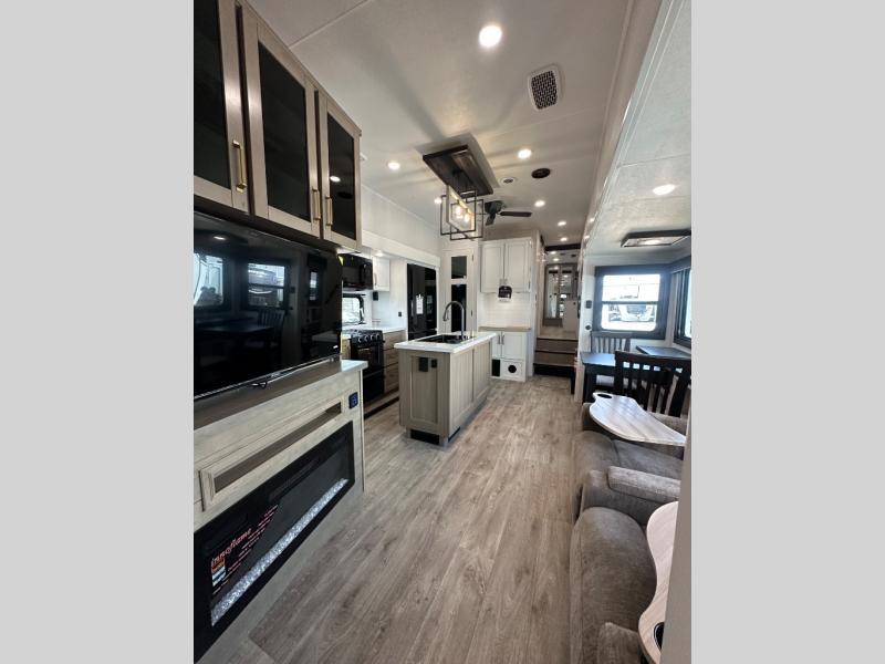 This fifth wheel is decked out in features you will love! The dual slides in the main living area create an open floorplan, and then there is a kitchen island that will make meal prepping easier. The theater seats plus table with chairs and a bench have a great view of the entertainment center and fireplace, and there is a ceiling fan here to keep the air moving. And did we mention there is an outside kitchen, complete with an outdoor refrigerator? This model also features a front private bedroom with a king bed slide out, a chest, and a front closet with convenient washer and dryer prep. There is also a rear private bunkhouse that has a 54" x 74" upper loft bed above a 66" x 80" Olympic bed with wardrobe storage drawers, as well as its very own half bathroom!
