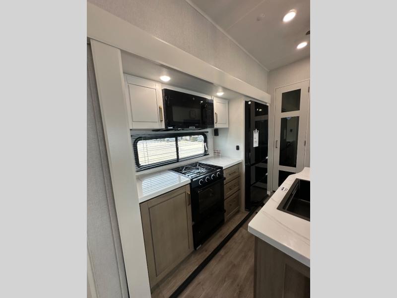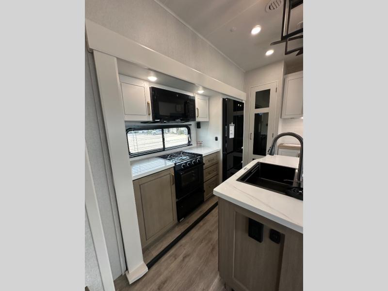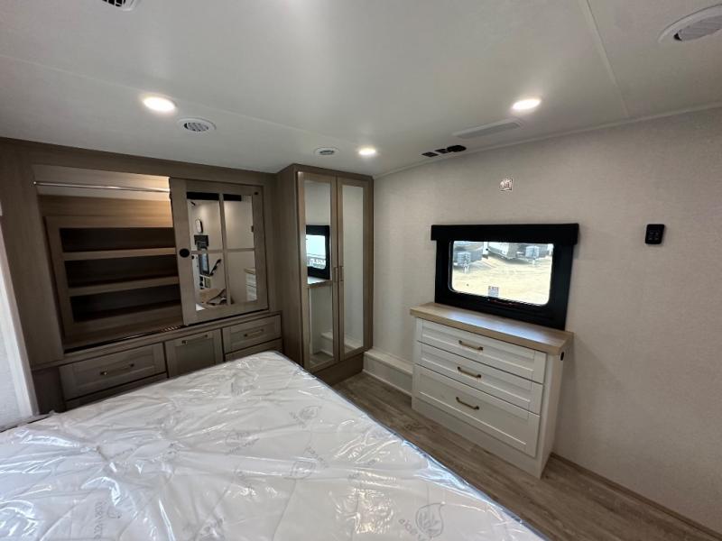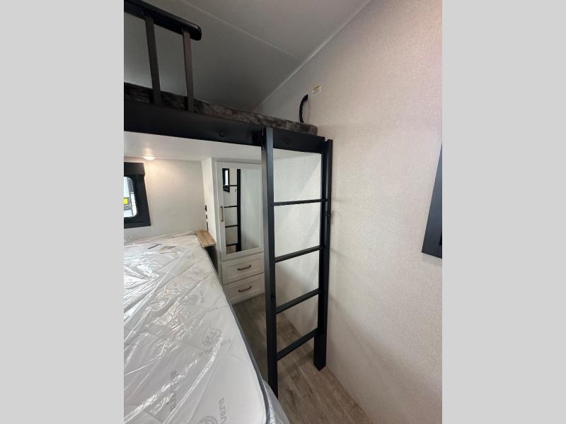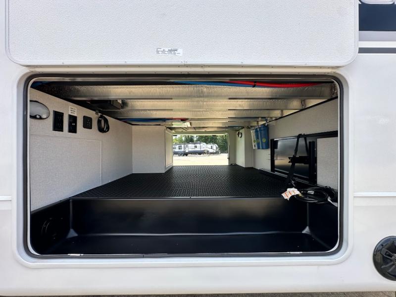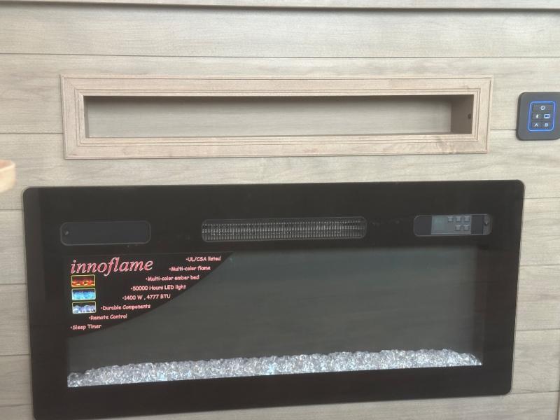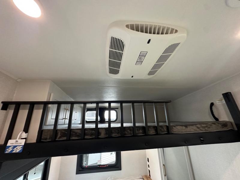 This fifth wheel is decked out in features you will love! The dual slides in the main living area create an open floorplan, and then there is a kitchen island that will make meal prepping easier. The theater seats plus table with chairs and a bench have a great view of the entertainment center and fireplace, and there is a ceiling fan here to keep the air moving. And did we mention there is an outside kitchen, complete with an outdoor refrigerator? This model also features a front private bedroom with a king bed slide out, a chest, and a front closet with convenient washer and dryer prep. There is also a rear private bunkhouse that has a 54" x 74" upper loft bed above a 66" x 80" Olympic bed with wardrobe storage drawers, as well as its very own half bathroom!