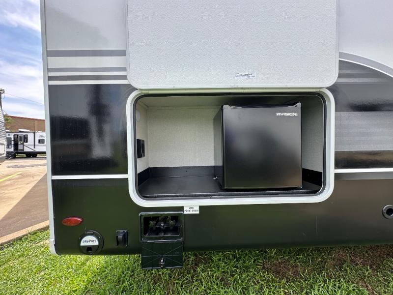 With any Eagle fifth wheel by Jayco you will appreciate durable construction materials, like the Magnum Truss Roof and the Stronghold VBL laminated walls. The JAYCOMMAND Smart RV system puts you in control of your RV's functions, and the 5 Star Handling Package will provide smooth towing from home to camp. Each model features Climate Shield zero-degree tested weather protection and the industry-exclusive HELIX cooling system that features two 15,000 BTU Whisper Quiet A/C's to keep you comfortable year around. Some of the exterior conveniences you are sure to love are the pass-through storage with Slam-Latch baggage doors and an automotive style front cap with max turn radius. The Eagle fifth wheels are designed to make you feel at home with solid hardwood slide fascia, residential vinyl flooring throughout, 100% no floor vents, and blackout roller shades with reflective side throughout for added privacy and insulation.