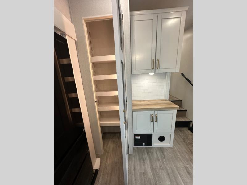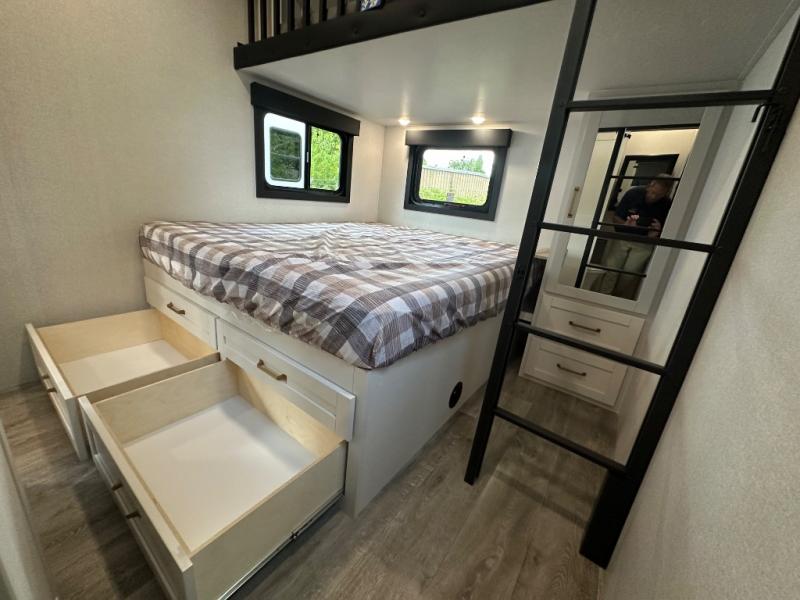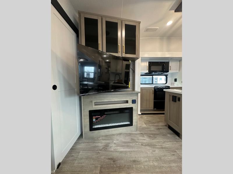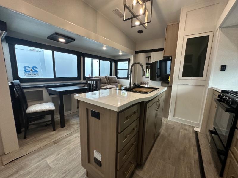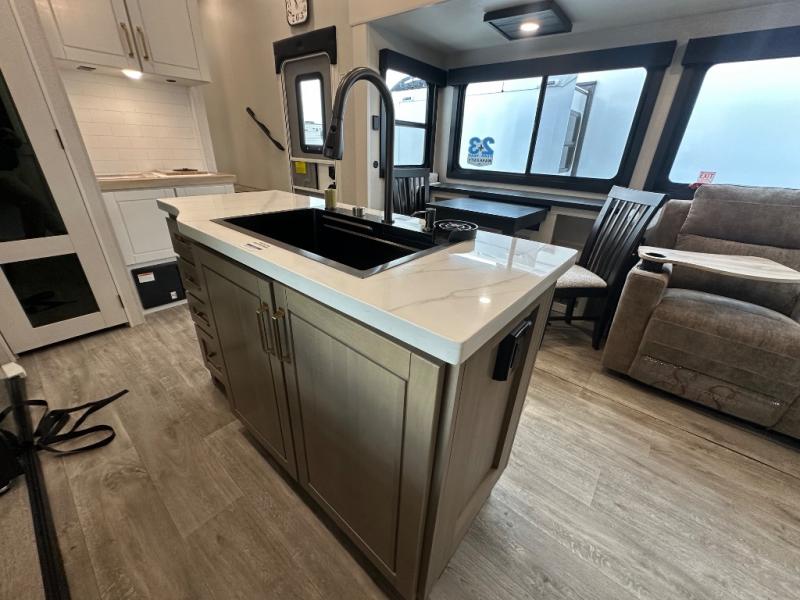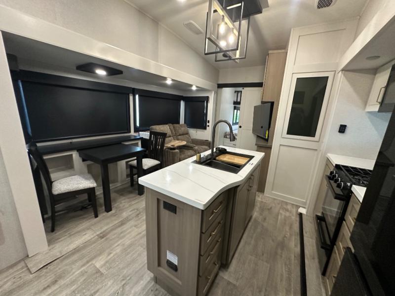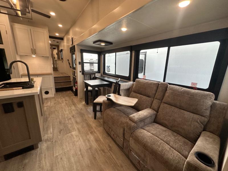 This fifth wheel is decked out in features you will love! The dual slides in the main living area create an open floorplan, and then there is a kitchen island that will make meal prepping easier. The theater seats plus table with chairs and a bench have a great view of the entertainment center and fireplace, and there is a ceiling fan here to keep the air moving. And did we mention there is an outside kitchen, complete with an outdoor refrigerator? This model also features a front private bedroom with a king bed slide out, a chest, and a front closet with convenient washer and dryer prep. There is also a rear private bunkhouse that has a 54" x 74" upper loft bed above a 66" x 80" Olympic bed with wardrobe storage drawers, as well as its very own half bathroom!