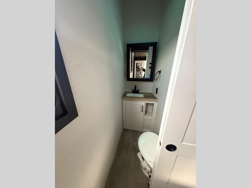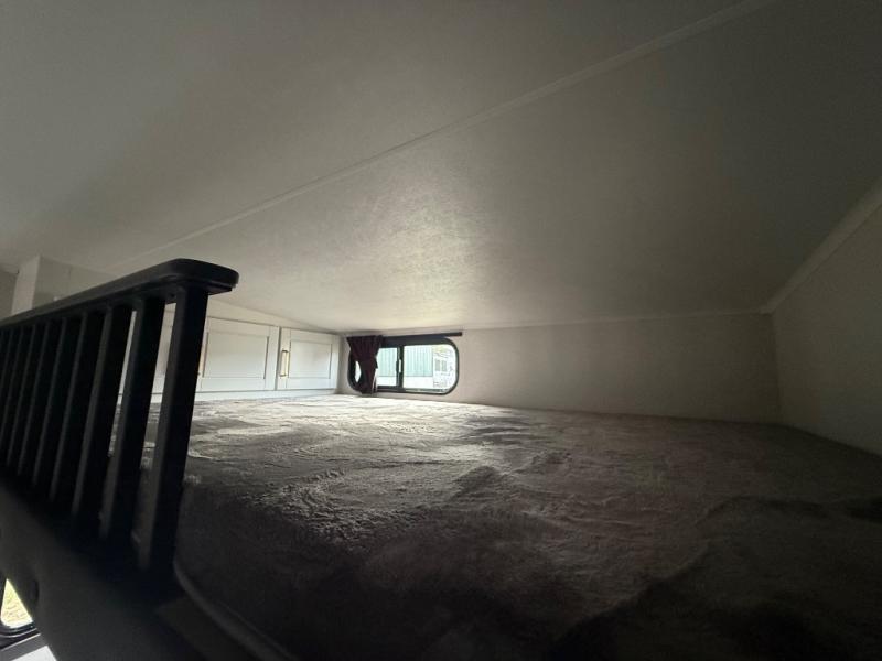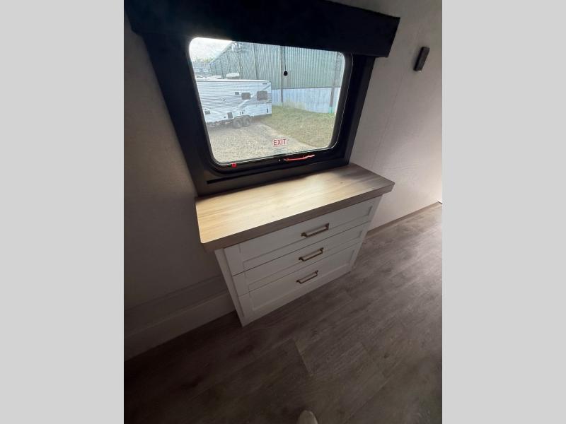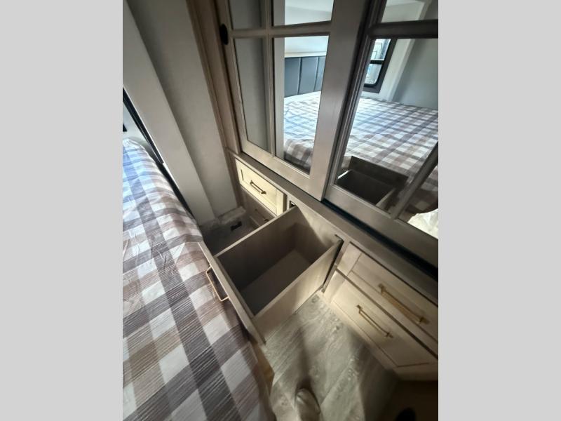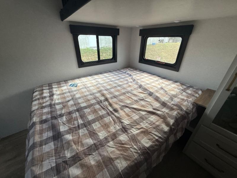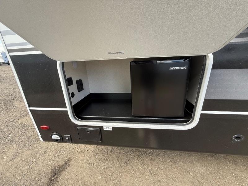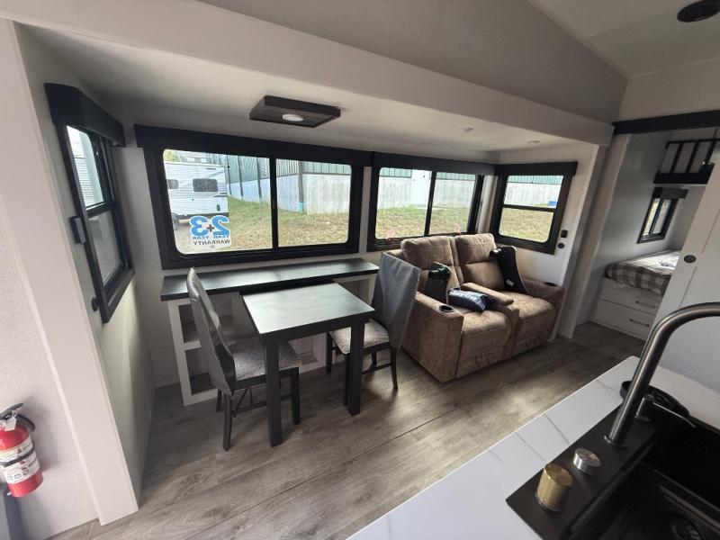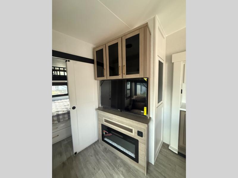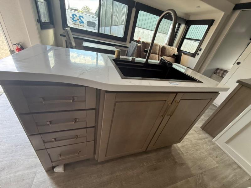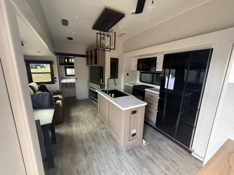This fifth wheel is decked out in features you will love! The dual slides in the main living area create an open floorplan, and then there is a kitchen island that will make meal prepping easier. The theater seats plus table with chairs and a bench have a great view of the entertainment center and fireplace, and there is a ceiling fan here to keep the air moving. And did we mention there is an outside kitchen, complete with an outdoor refrigerator? This model also features a front private bedroom with a king bed slide out, a chest, and a front closet with convenient washer and dryer prep. There is also a rear private bunkhouse that has a 54" x 74" upper loft bed above a 66" x 80" Olympic bed with wardrobe storage drawers, as well as its very own half bathroom!