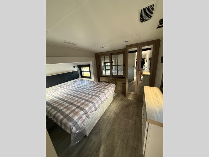 With any Eagle fifth wheel by Jayco you will appreciate durable construction materials, like the Magnum Truss Roof and the Stronghold VBL laminated walls. The JAYCOMMAND Smart RV system puts you in control of your RV's functions, and the 5 Star Handling Package will provide smooth towing from home to camp. Each model features Climate Shield zero-degree tested weather protection and the industry-exclusive HELIX cooling system that features two 15,000 BTU Whisper Quiet A/C's to keep you comfortable year around. Some of the exterior conveniences you are sure to love are the pass-through storage with Slam-Latch baggage doors and an automotive style front cap with max turn radius. The Eagle fifth wheels are designed to make you feel at home with solid hardwood slide fascia, residential vinyl flooring throughout, 100% no floor vents, and blackout roller shades with reflective side throughout for added privacy and insulation.