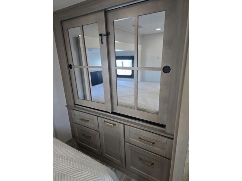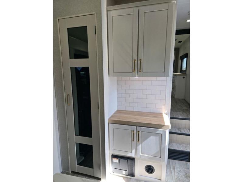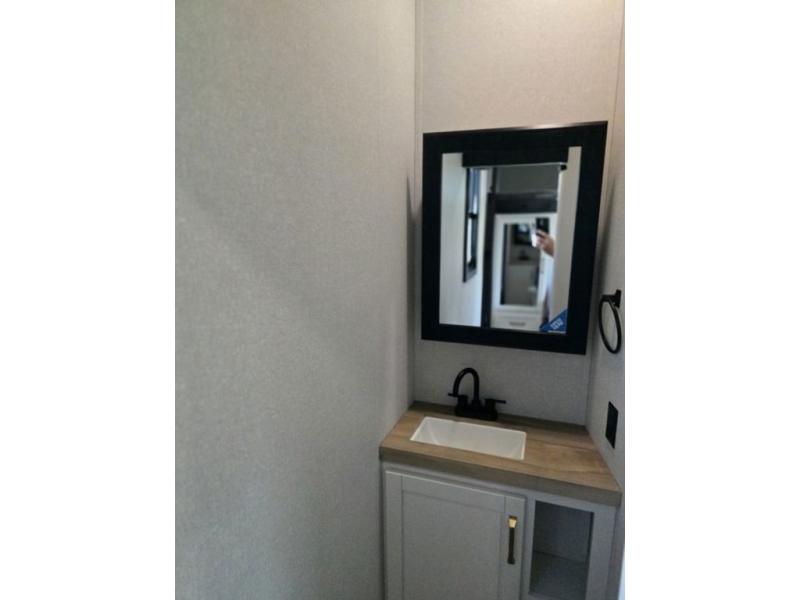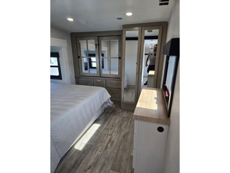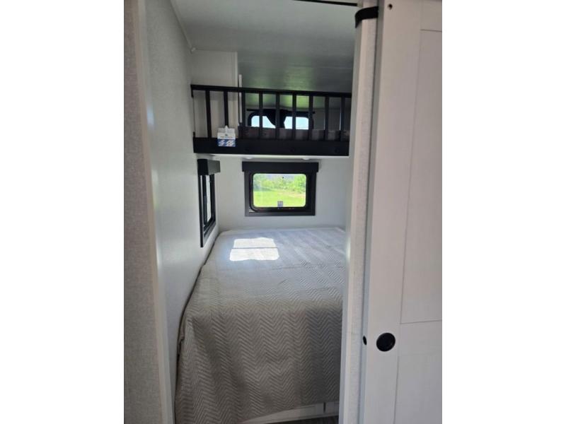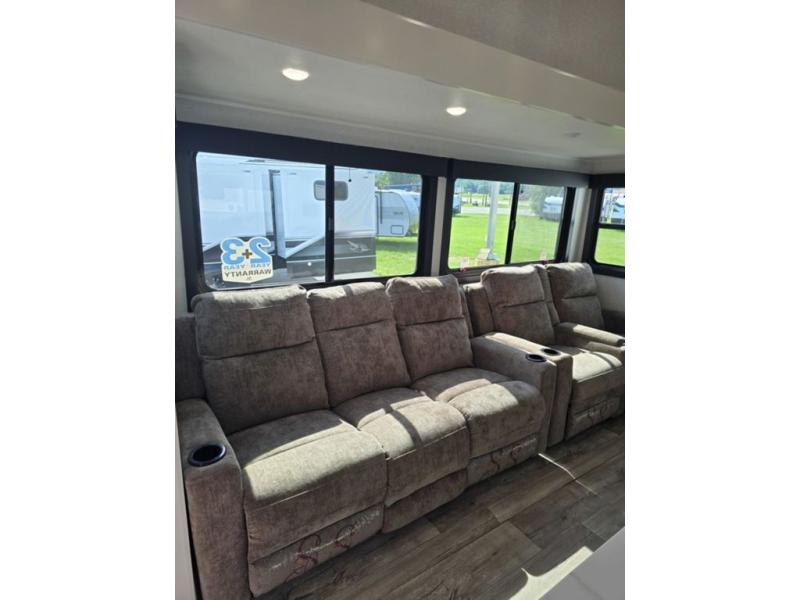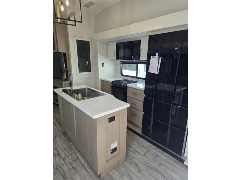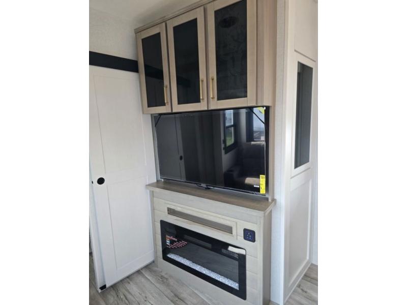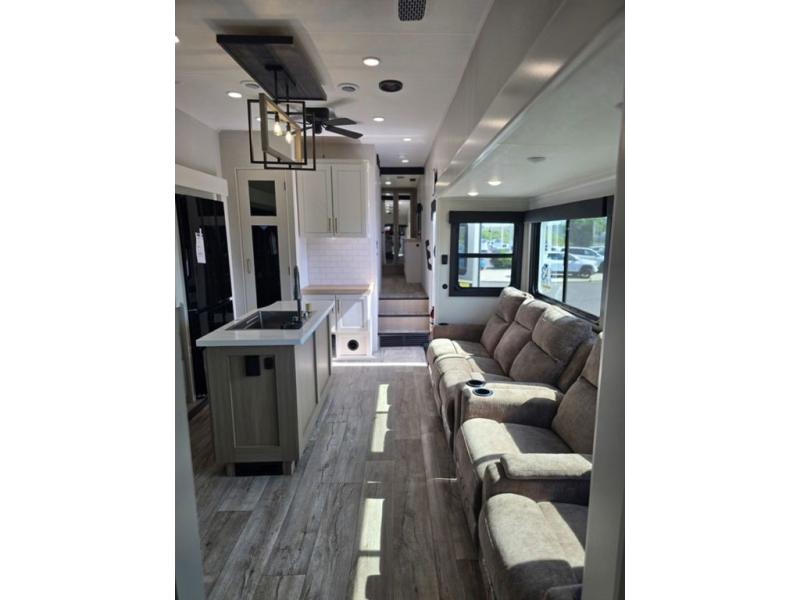 This fifth wheel is decked out in features you will love! The dual slides in the main living area create an open floorplan, and then there is a kitchen island that will make meal prepping easier. The theater seats plus table with chairs and a bench have a great view of the entertainment center and fireplace, and there is a ceiling fan here to keep the air moving. And did we mention there is an outside kitchen, complete with an outdoor refrigerator? This model also features a front private bedroom with a king bed slide out, a chest, and a front closet with convenient washer and dryer prep. There is also a rear private bunkhouse that has a 54" x 74" upper loft bed above a 66" x 80" Olympic bed with wardrobe storage drawers, as well as its very own half bathroom!