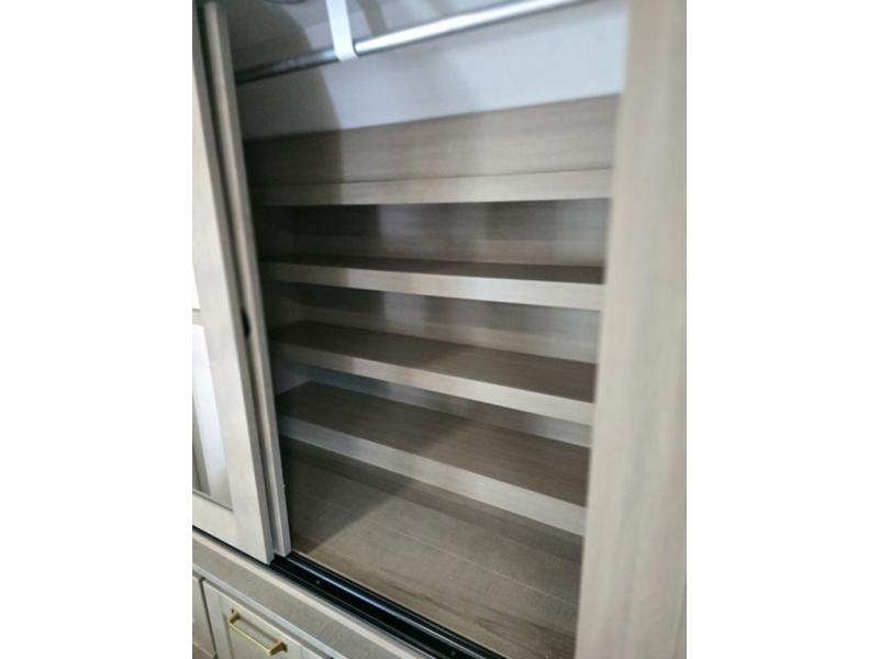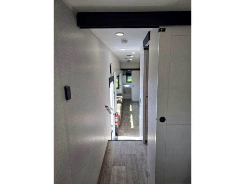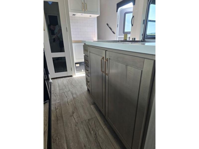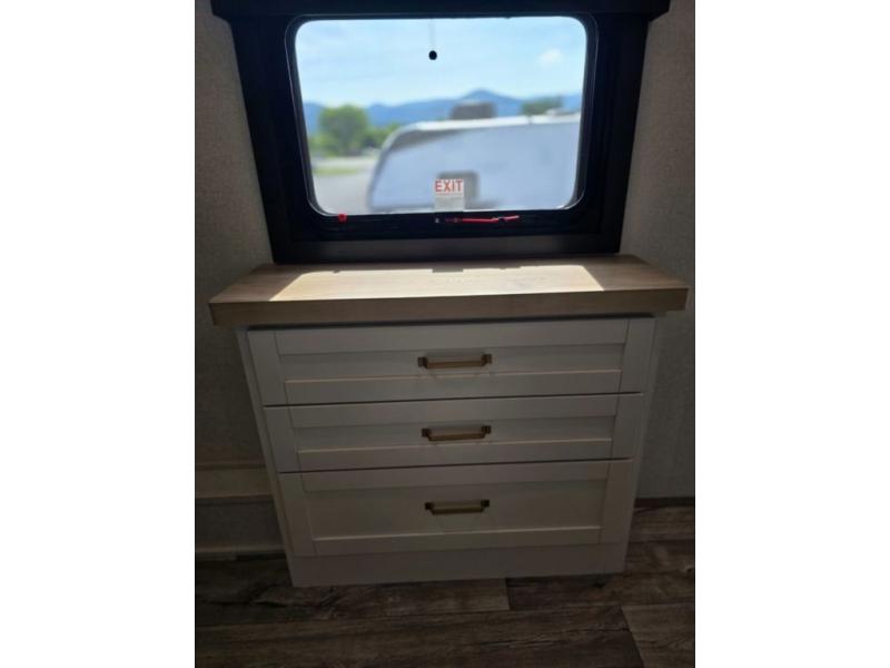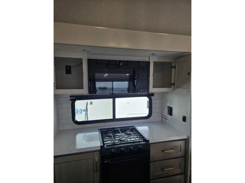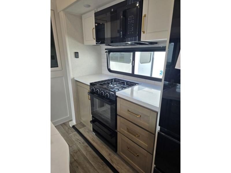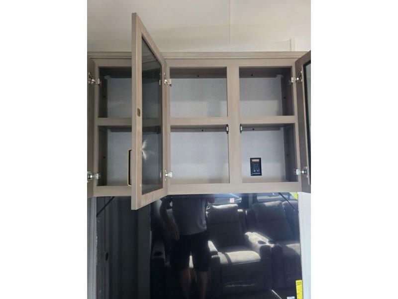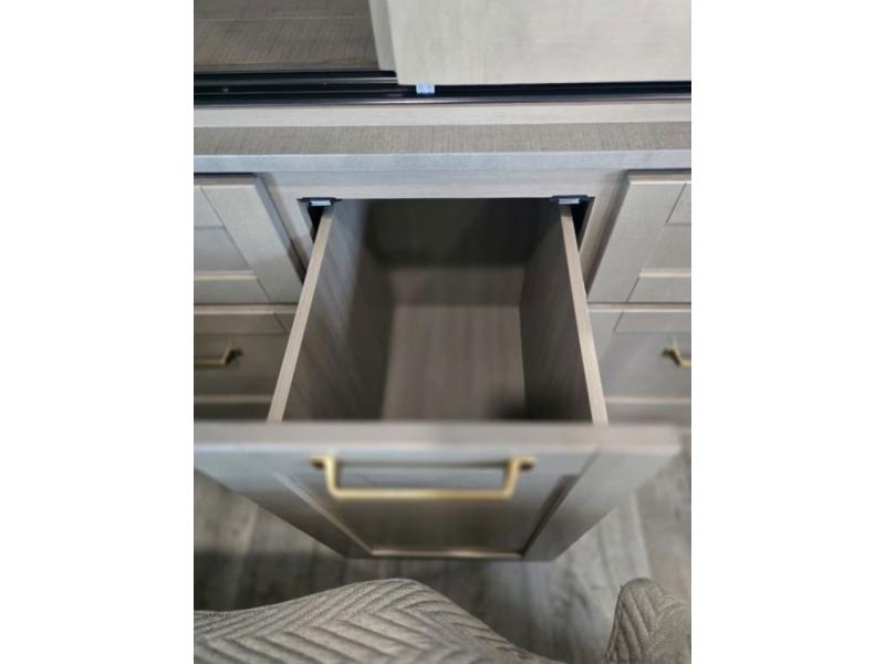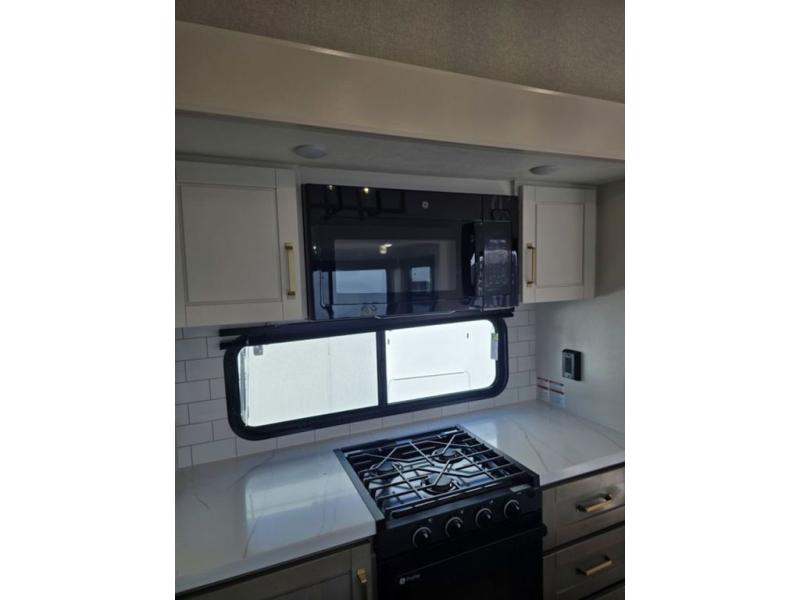 This fifth wheel is decked out in features you will love! The dual slides in the main living area create an open floorplan, and then there is a kitchen island that will make meal prepping easier. The theater seats plus table with chairs and a bench have a great view of the entertainment center and fireplace, and there is a ceiling fan here to keep the air moving. And did we mention there is an outside kitchen, complete with an outdoor refrigerator? This model also features a front private bedroom with a king bed slide out, a chest, and a front closet with convenient washer and dryer prep. There is also a rear private bunkhouse that has a 54" x 74" upper loft bed above a 66" x 80" Olympic bed with wardrobe storage drawers, as well as its very own half bathroom!