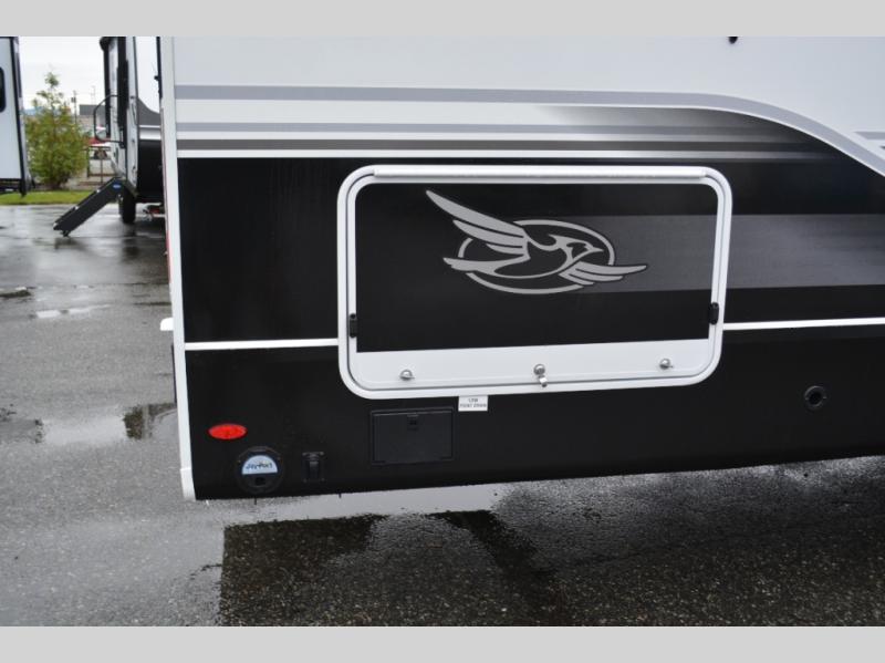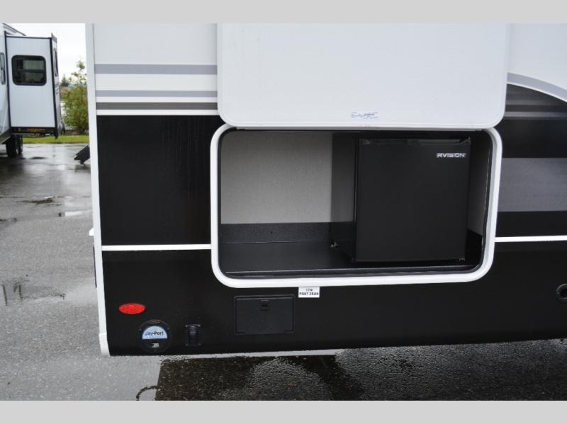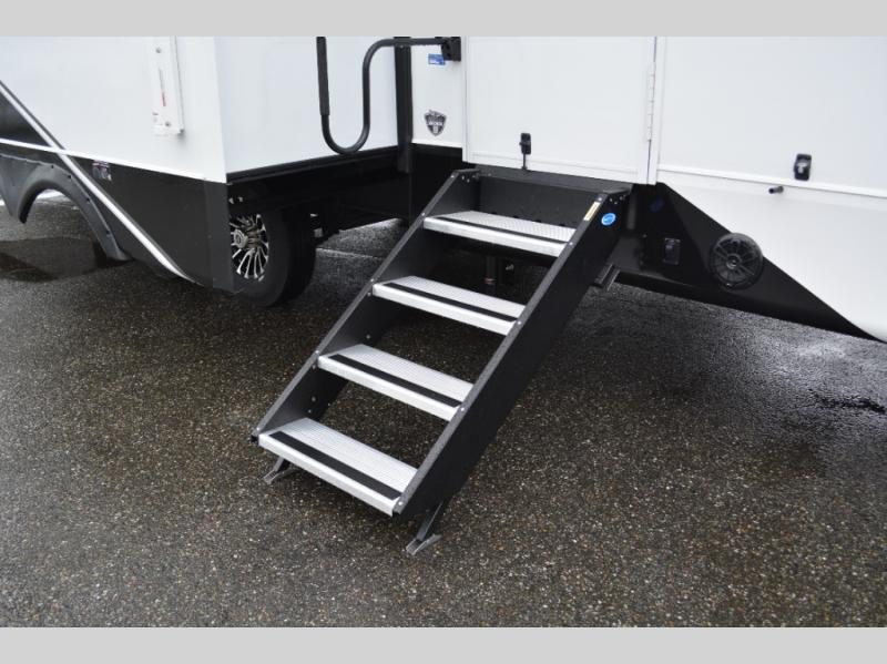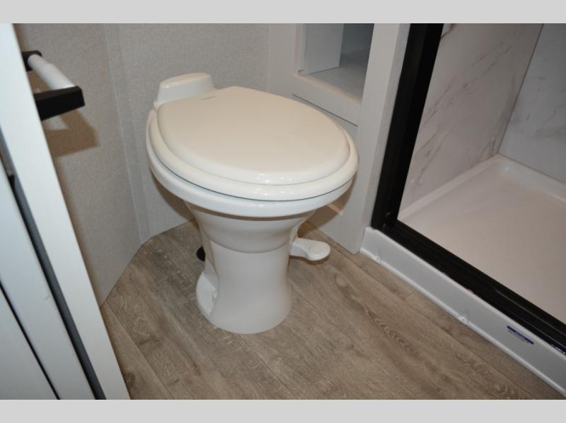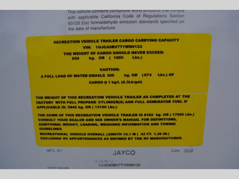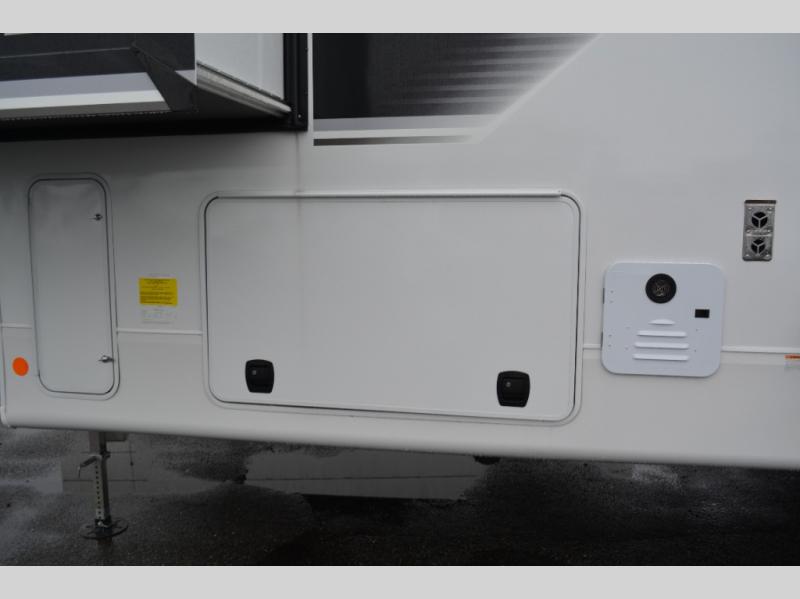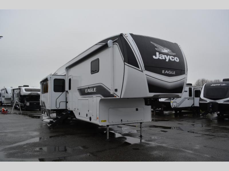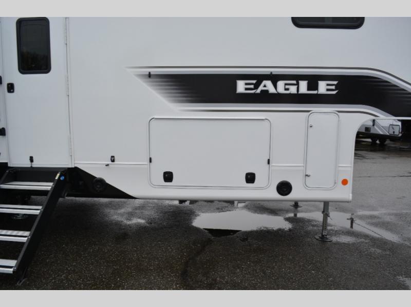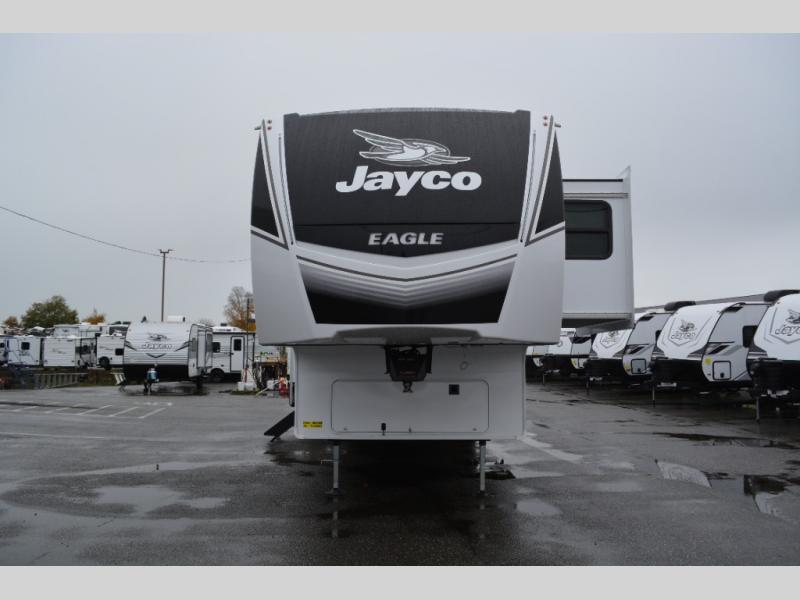 With any Eagle fifth wheel by Jayco you will appreciate durable construction materials, like the Magnum Truss Roof and the Stronghold VBL laminated walls. The JAYCOMMAND Smart RV system puts you in control of your RV's functions, and the 5 Star Handling Package will provide smooth towing from home to camp. Each model features Climate Shield zero-degree tested weather protection and the industry-exclusive HELIX cooling system that features two 15,000 BTU Whisper Quiet A/C's to keep you comfortable year around. Some of the exterior conveniences you are sure to love are the pass-through storage with Slam-Latch baggage doors and an automotive style front cap with max turn radius. The Eagle fifth wheels are designed to make you feel at home with solid hardwood slide fascia, residential vinyl flooring throughout, 100% no floor vents, and blackout roller shades with reflective side throughout for added privacy and insulation.