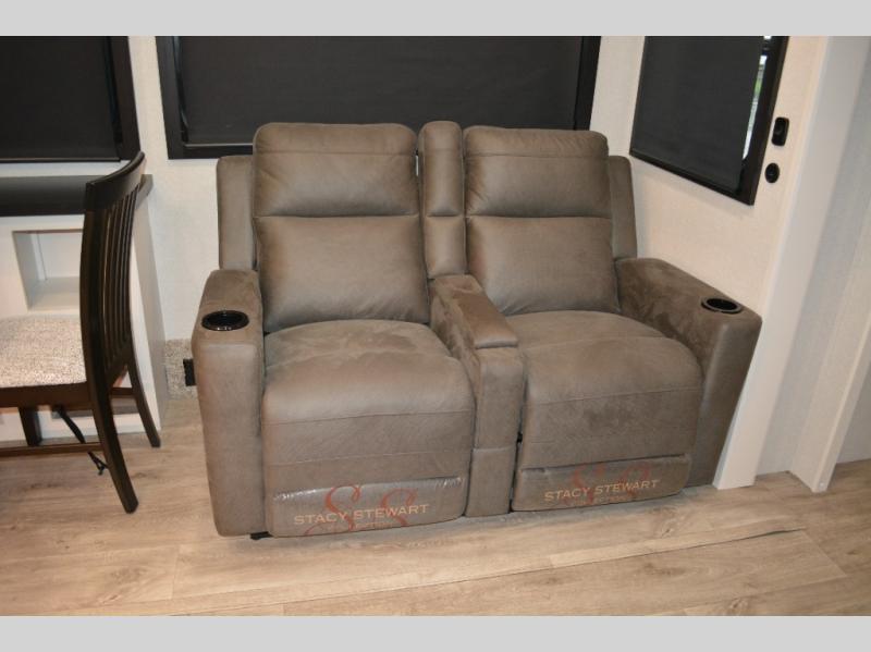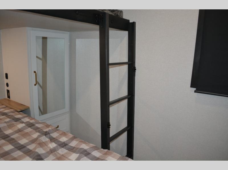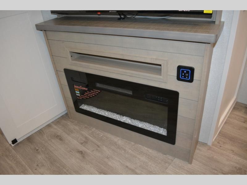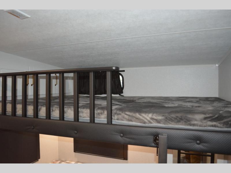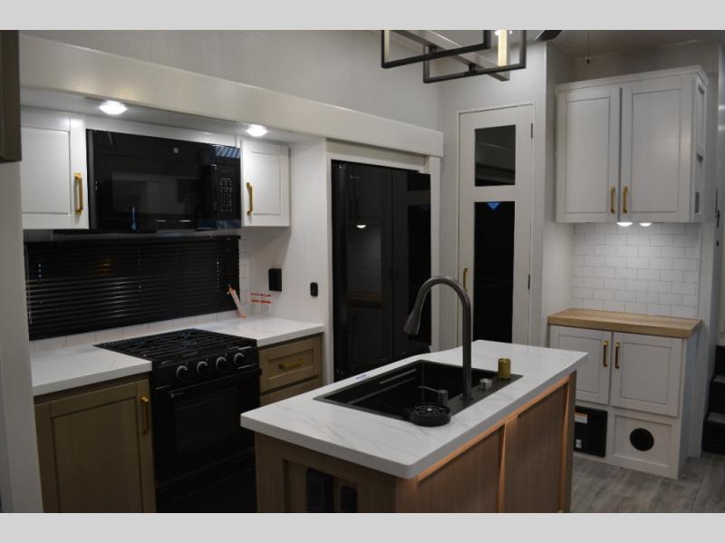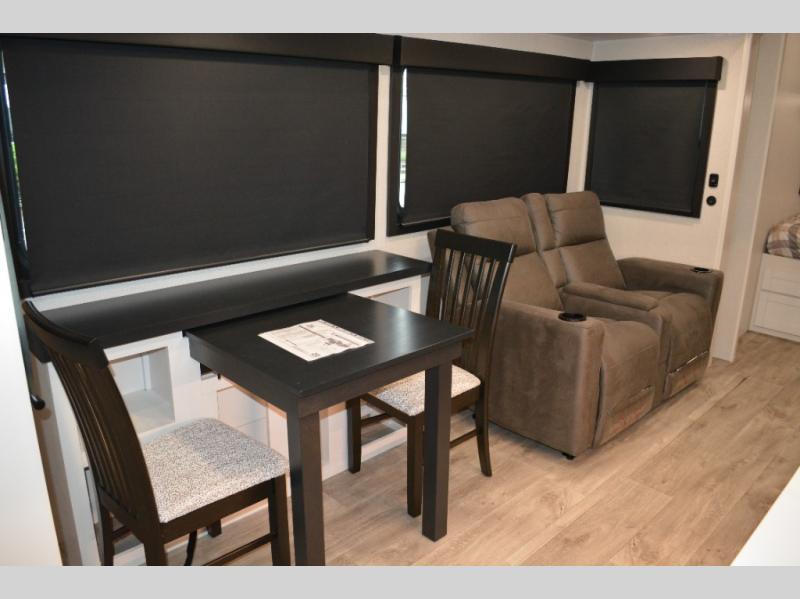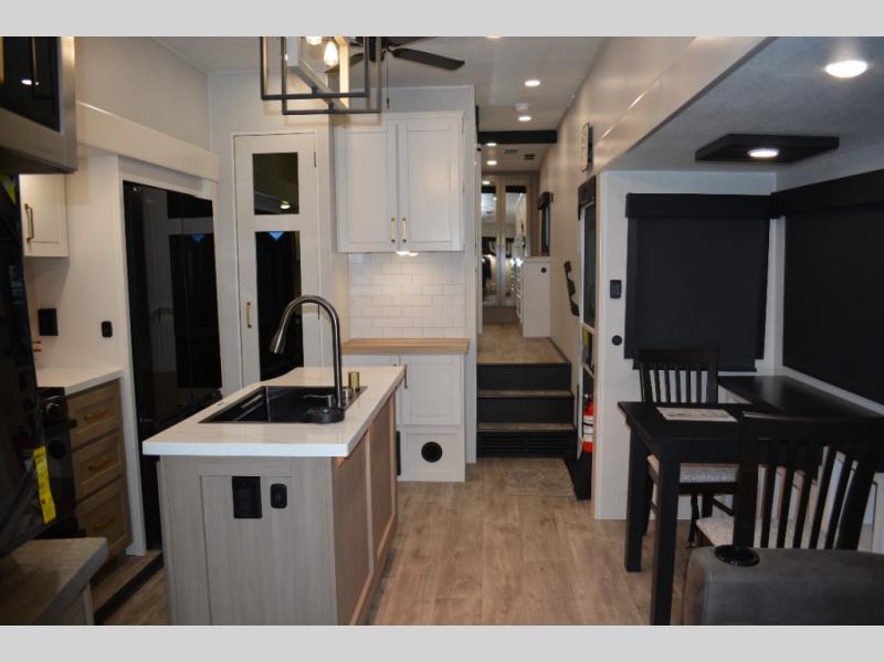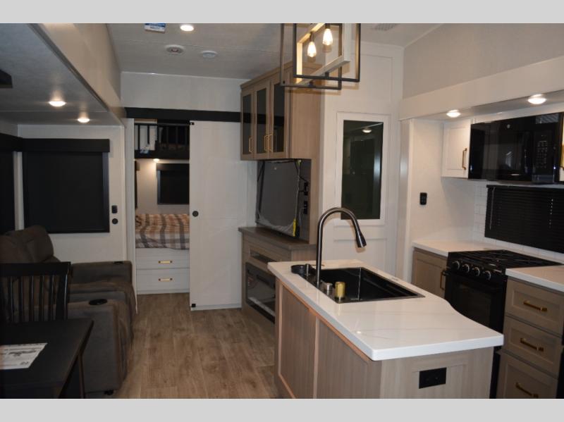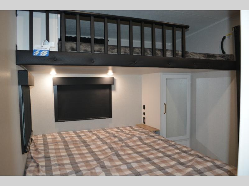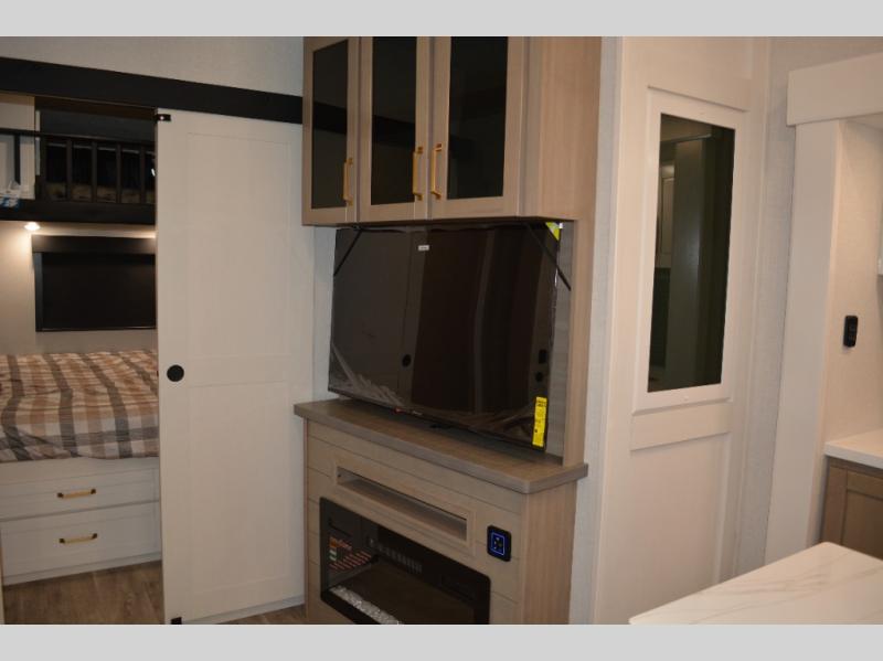 This fifth wheel is decked out in features you will love! The dual slides in the main living area create an open floorplan, and then there is a kitchen island that will make meal prepping easier. The theater seats plus table with chairs and a bench have a great view of the entertainment center and fireplace, and there is a ceiling fan here to keep the air moving. And did we mention there is an outside kitchen, complete with an outdoor refrigerator? This model also features a front private bedroom with a king bed slide out, a chest, and a front closet with convenient washer and dryer prep. There is also a rear private bunkhouse that has a 54" x 74" upper loft bed above a 66" x 80" Olympic bed with wardrobe storage drawers, as well as its very own half bathroom!