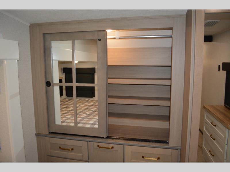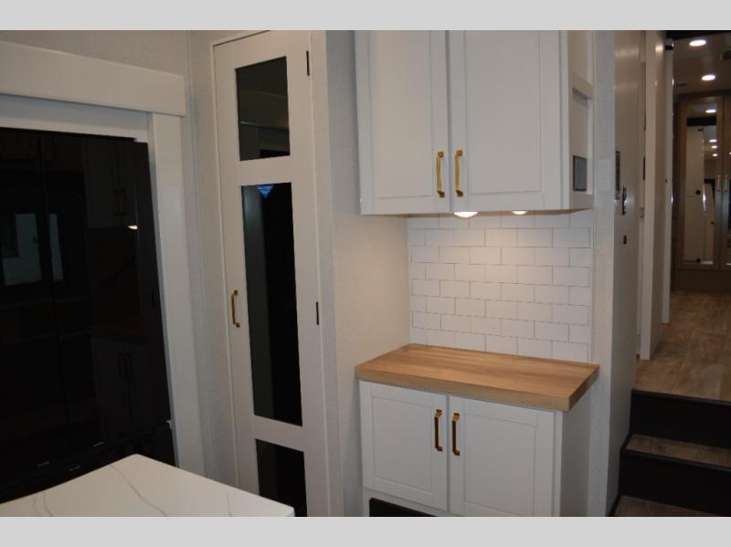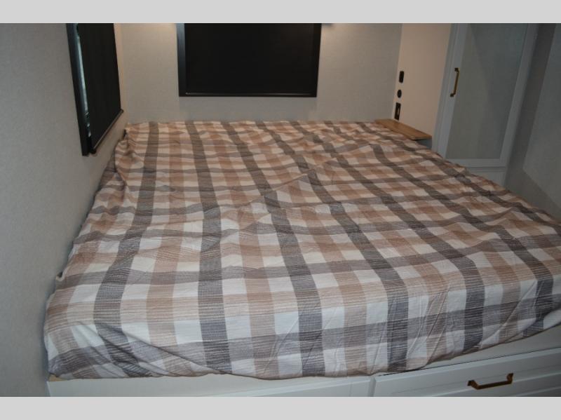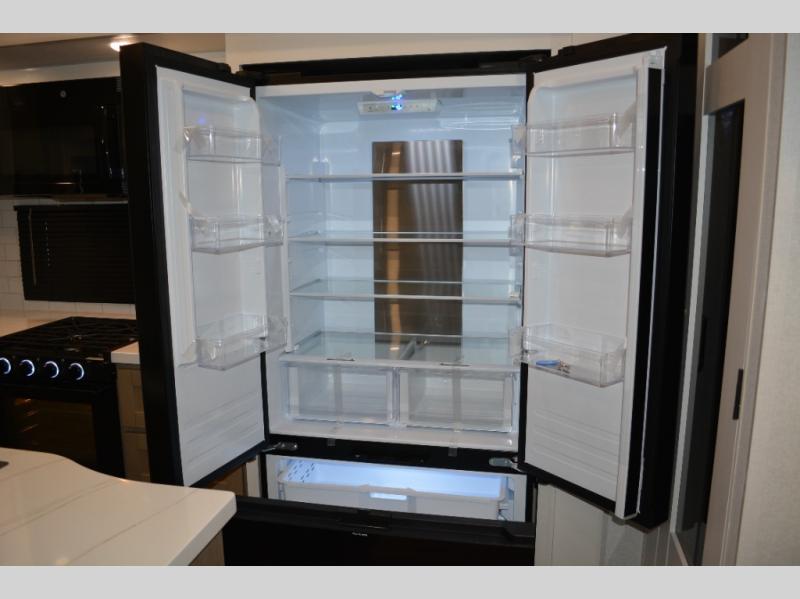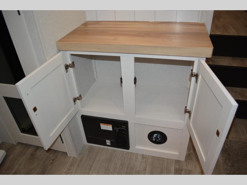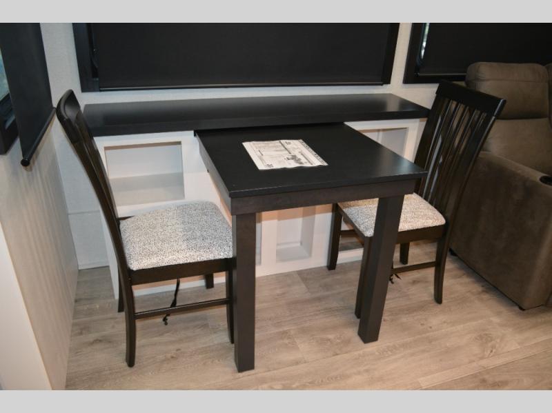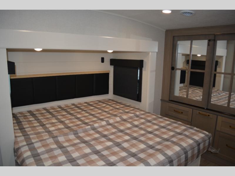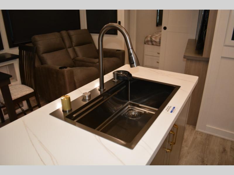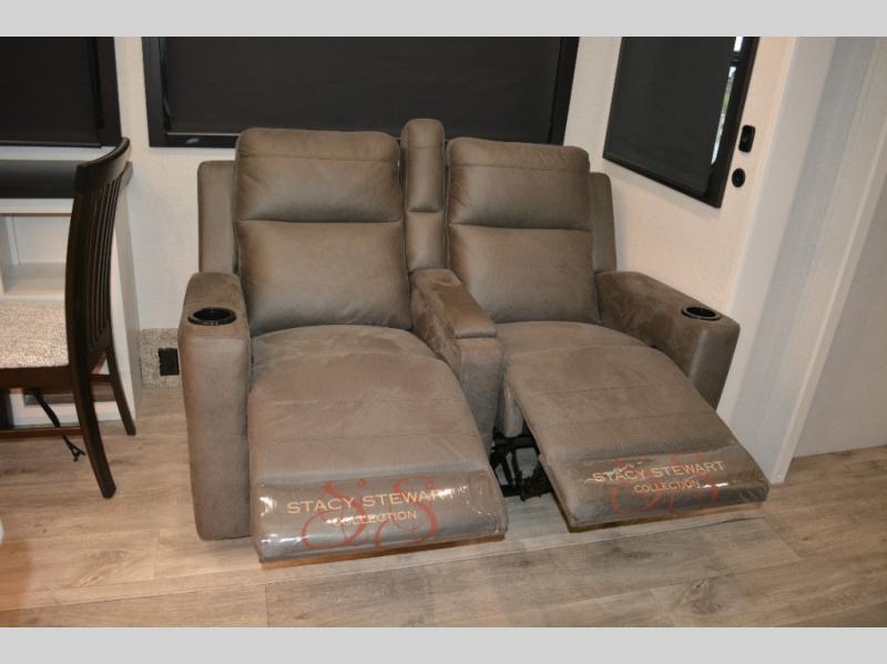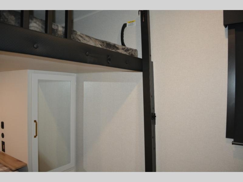 This fifth wheel is decked out in features you will love! The dual slides in the main living area create an open floorplan, and then there is a kitchen island that will make meal prepping easier. The theater seats plus table with chairs and a bench have a great view of the entertainment center and fireplace, and there is a ceiling fan here to keep the air moving. And did we mention there is an outside kitchen, complete with an outdoor refrigerator? This model also features a front private bedroom with a king bed slide out, a chest, and a front closet with convenient washer and dryer prep. There is also a rear private bunkhouse that has a 54" x 74" upper loft bed above a 66" x 80" Olympic bed with wardrobe storage drawers, as well as its very own half bathroom!