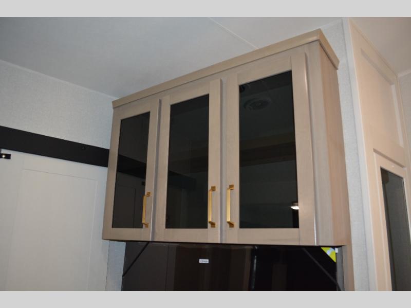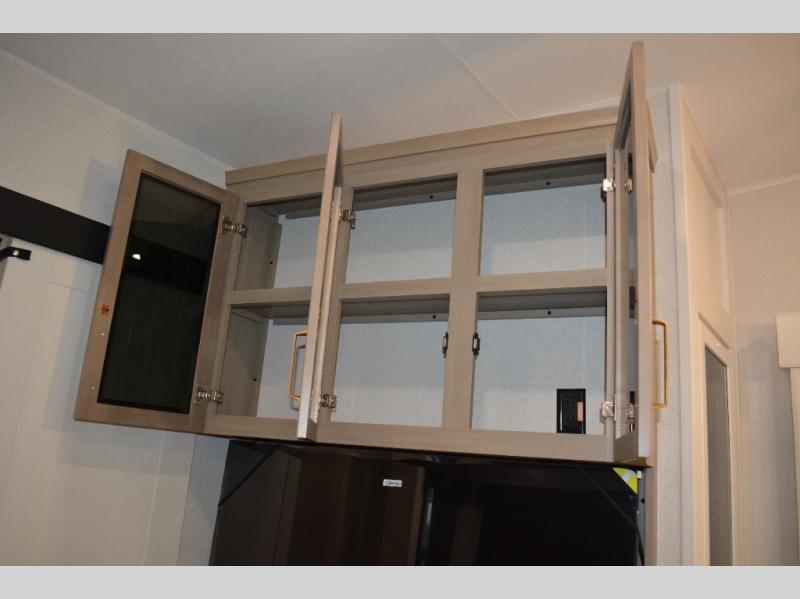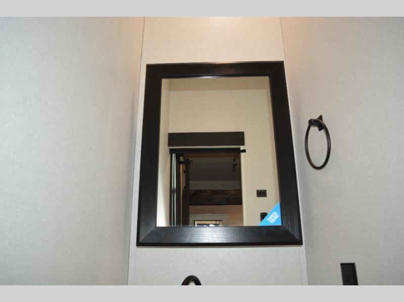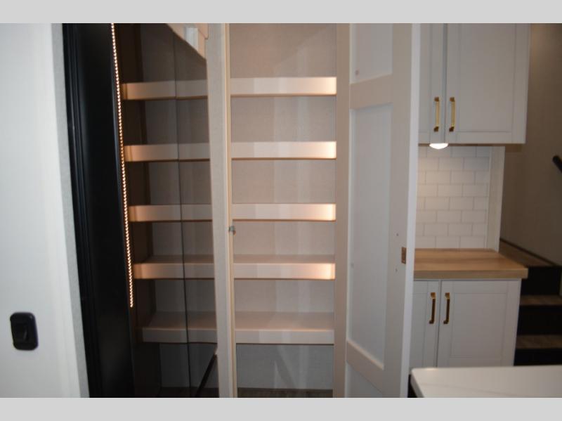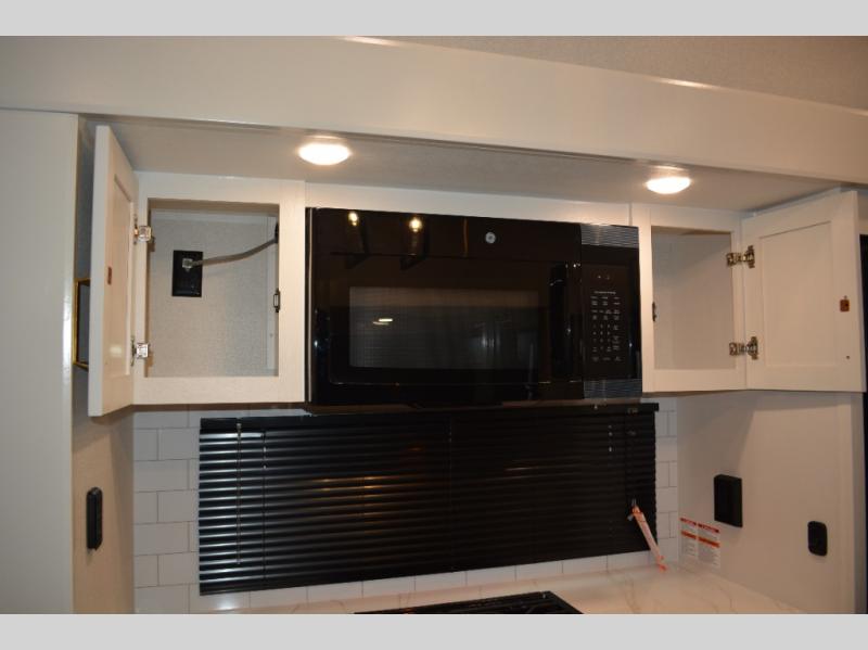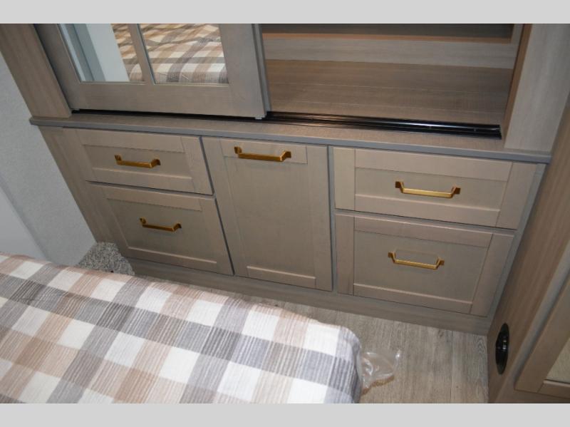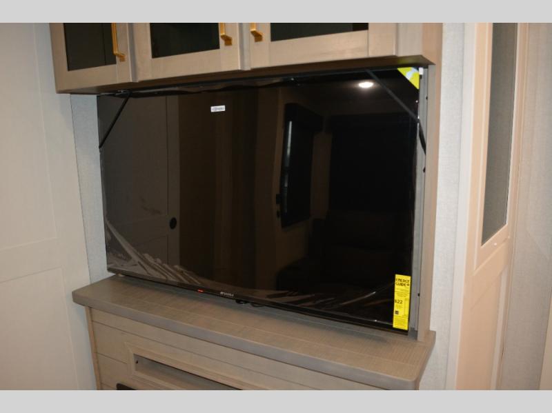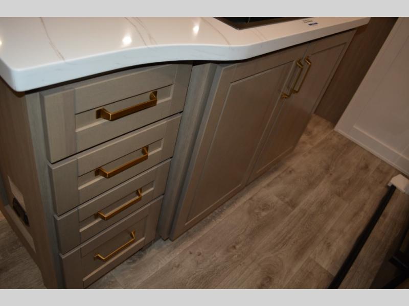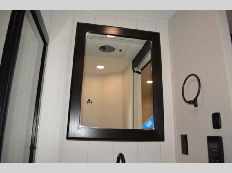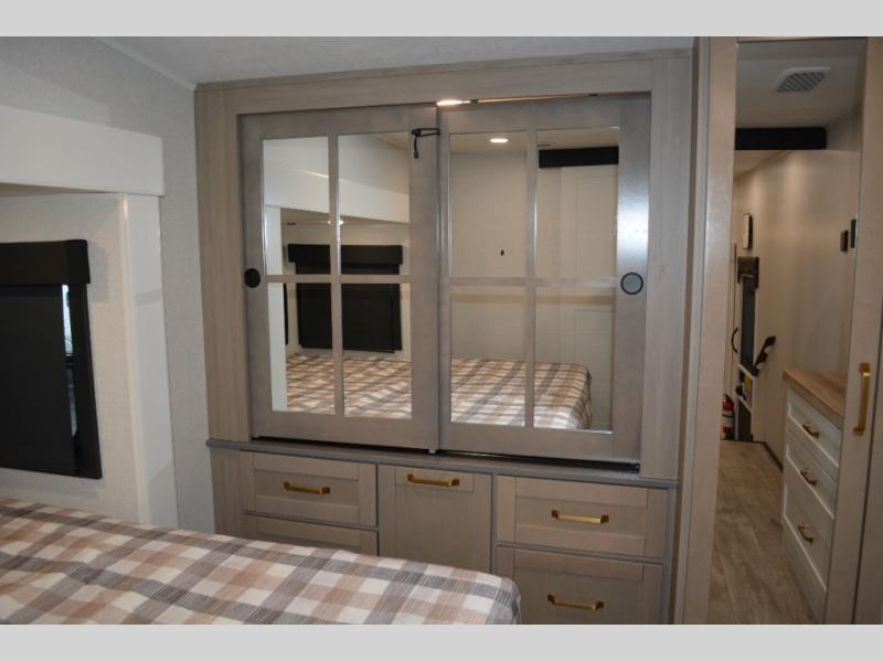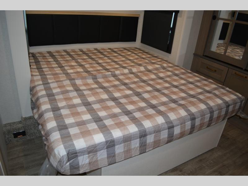 This fifth wheel is decked out in features you will love! The dual slides in the main living area create an open floorplan, and then there is a kitchen island that will make meal prepping easier. The theater seats plus table with chairs and a bench have a great view of the entertainment center and fireplace, and there is a ceiling fan here to keep the air moving. And did we mention there is an outside kitchen, complete with an outdoor refrigerator? This model also features a front private bedroom with a king bed slide out, a chest, and a front closet with convenient washer and dryer prep. There is also a rear private bunkhouse that has a 54" x 74" upper loft bed above a 66" x 80" Olympic bed with wardrobe storage drawers, as well as its very own half bathroom!