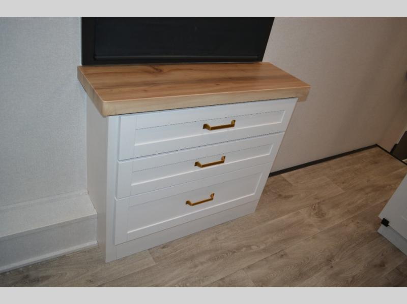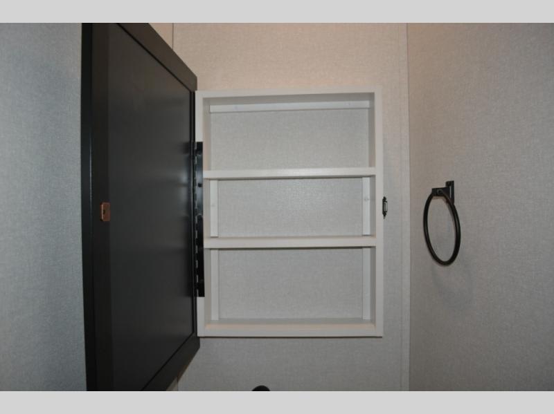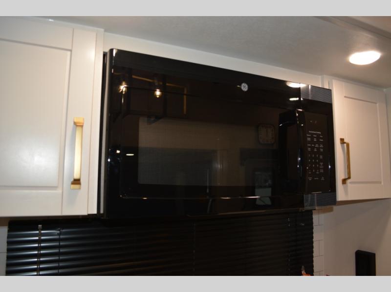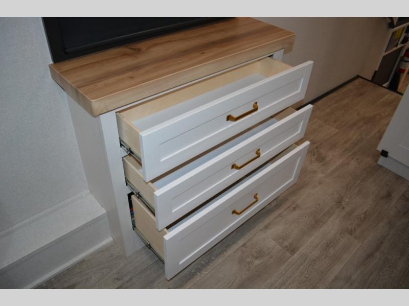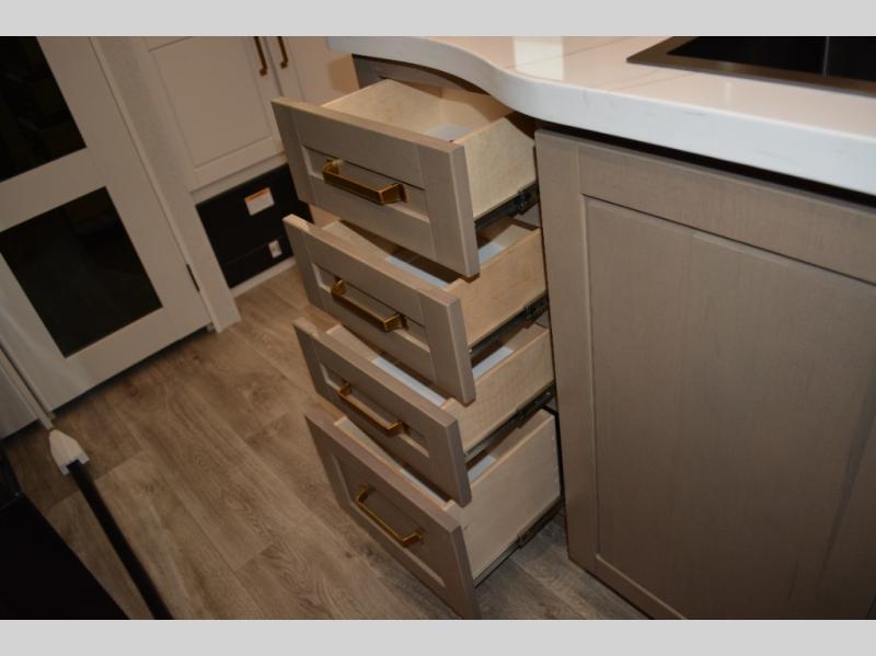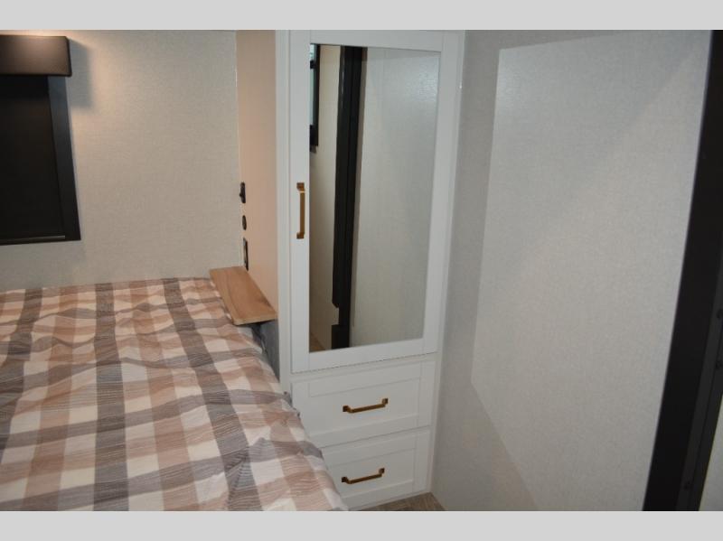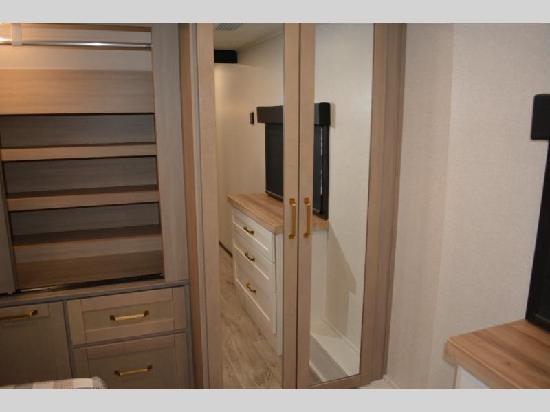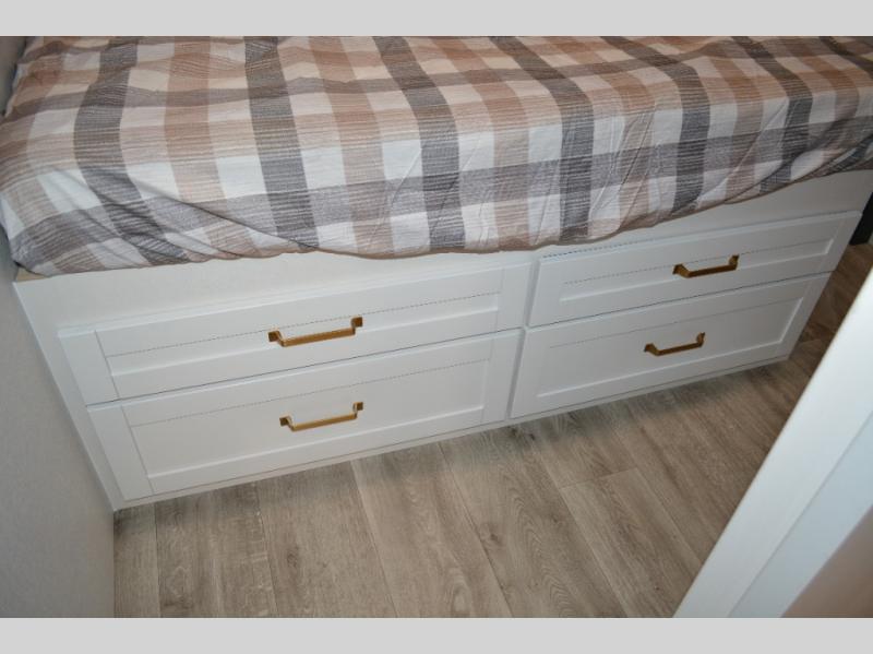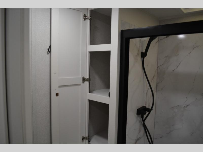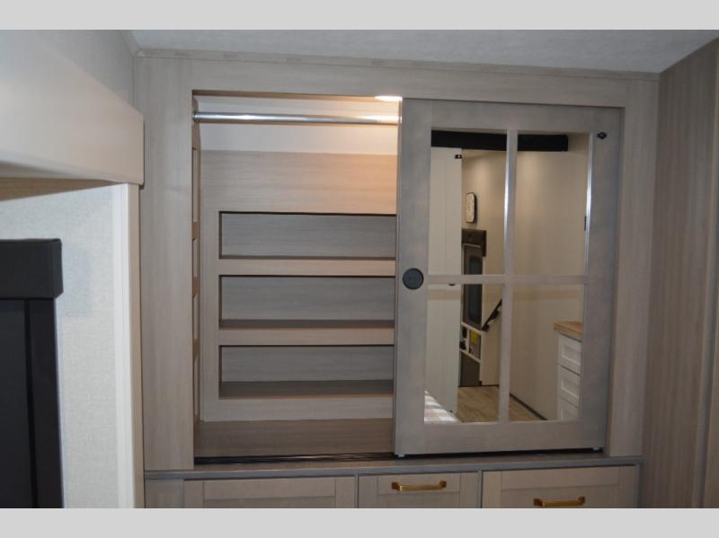 This fifth wheel is decked out in features you will love! The dual slides in the main living area create an open floorplan, and then there is a kitchen island that will make meal prepping easier. The theater seats plus table with chairs and a bench have a great view of the entertainment center and fireplace, and there is a ceiling fan here to keep the air moving. And did we mention there is an outside kitchen, complete with an outdoor refrigerator? This model also features a front private bedroom with a king bed slide out, a chest, and a front closet with convenient washer and dryer prep. There is also a rear private bunkhouse that has a 54" x 74" upper loft bed above a 66" x 80" Olympic bed with wardrobe storage drawers, as well as its very own half bathroom!