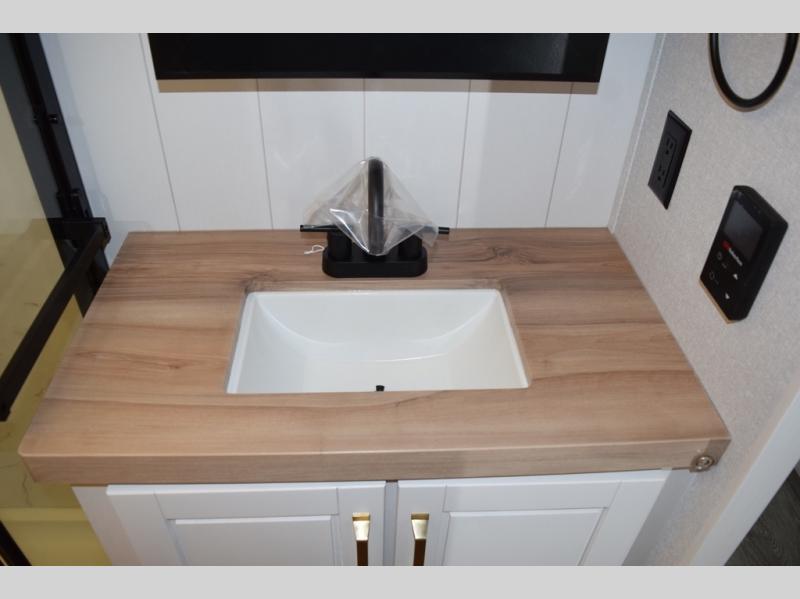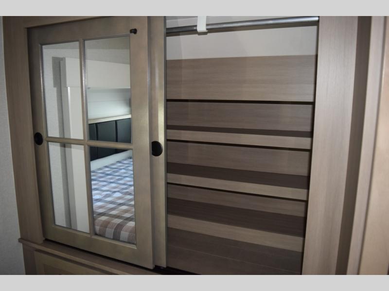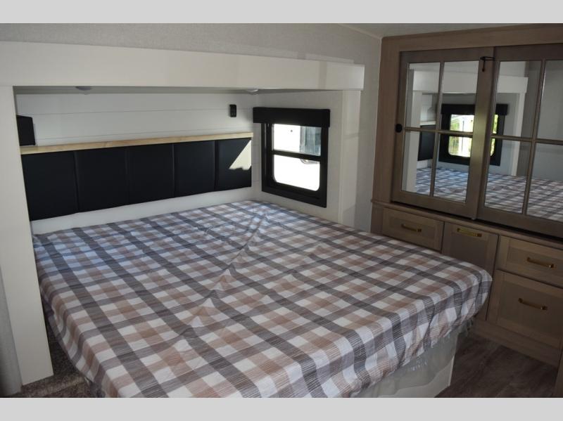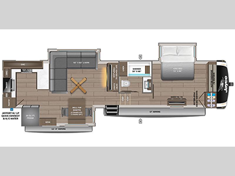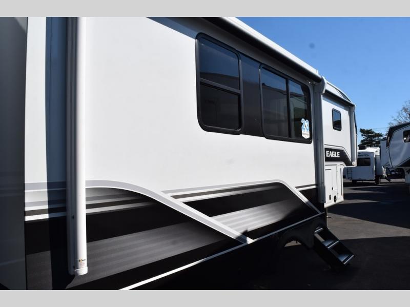 With any Eagle fifth wheel by Jayco you will appreciate durable construction materials, like the Magnum Truss Roof and the Stronghold VBL laminated walls. The JAYCOMMAND Smart RV system puts you in control of your RV's functions, and the 5 Star Handling Package will provide smooth towing from home to camp. Each model features Climate Shield zero-degree tested weather protection and the industry-exclusive HELIX cooling system that features two 15,000 BTU Whisper Quiet A/C's to keep you comfortable year around. Some of the exterior conveniences you are sure to love are the pass-through storage with Slam-Latch baggage doors and an automotive style front cap with max turn radius. The Eagle fifth wheels are designed to make you feel at home with solid hardwood slide fascia, residential vinyl flooring throughout, 100% no floor vents, and blackout roller shades with reflective side throughout for added privacy and insulation.