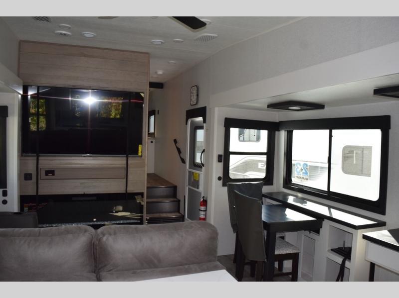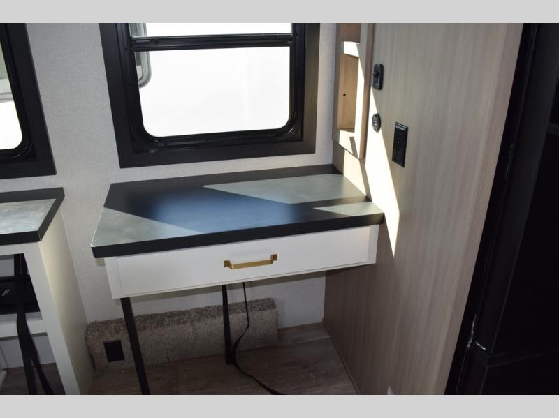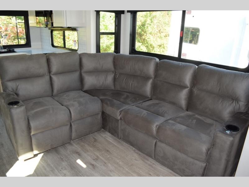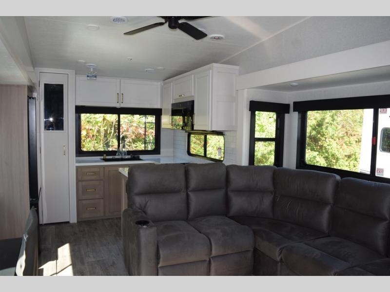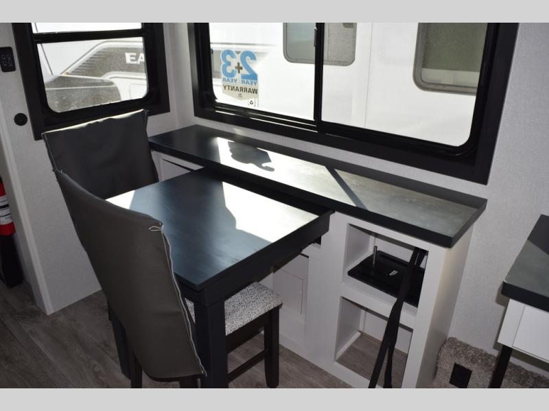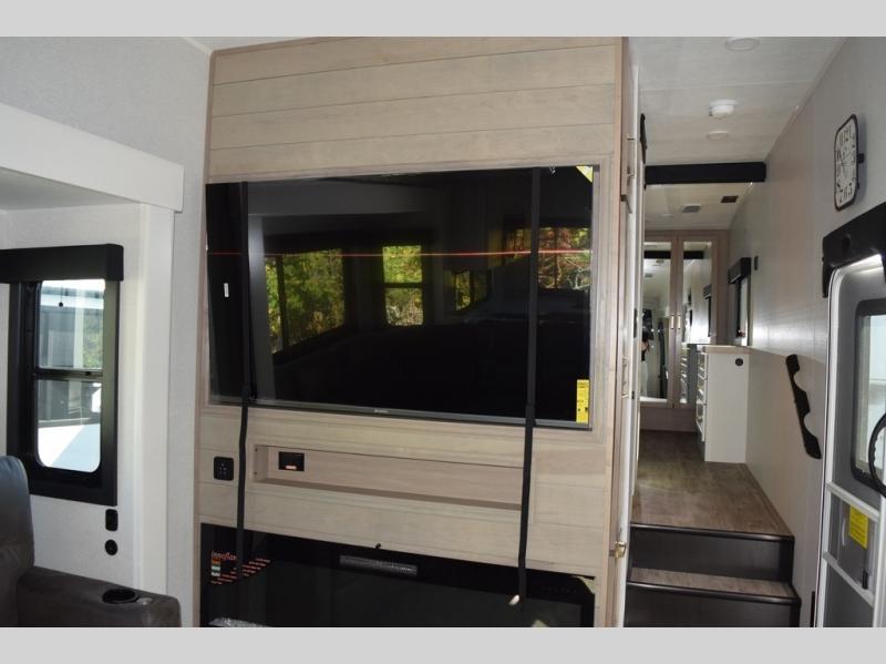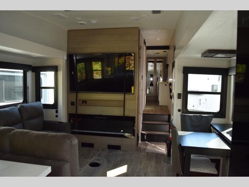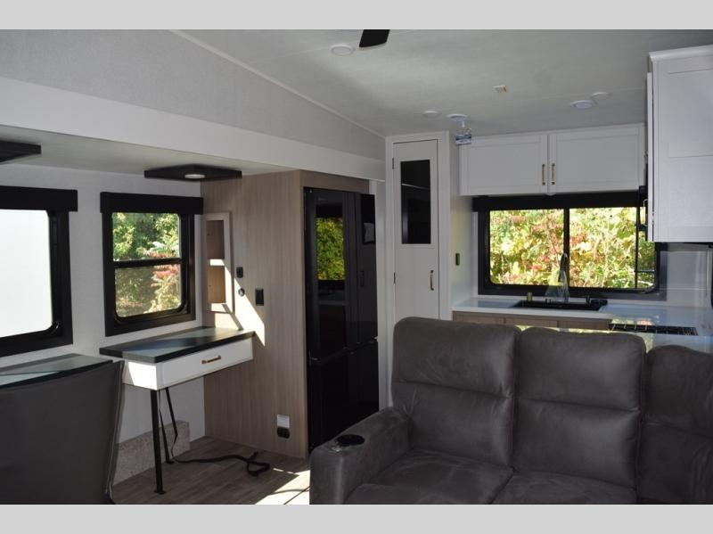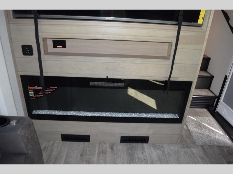 It will be so easy to enjoy time in this spacious fifth wheel! The chef of your group is sure to love the rear kitchen with a U-shaped counter and plenty of storage for food and dishes. The middle living area includes an entertainment center with a fireplace across from the L-shaped sofa for movie nights. There is also a desk to get some work done and a roll-top dinette with two chairs to dine at. Heading up front, you'll find the spacious bathroom that includes a shower with a seat, and the front private bedroom with a king bed slide out. There is also a chest with a TV, front shelves with drawers, plus washer and dryer prep!