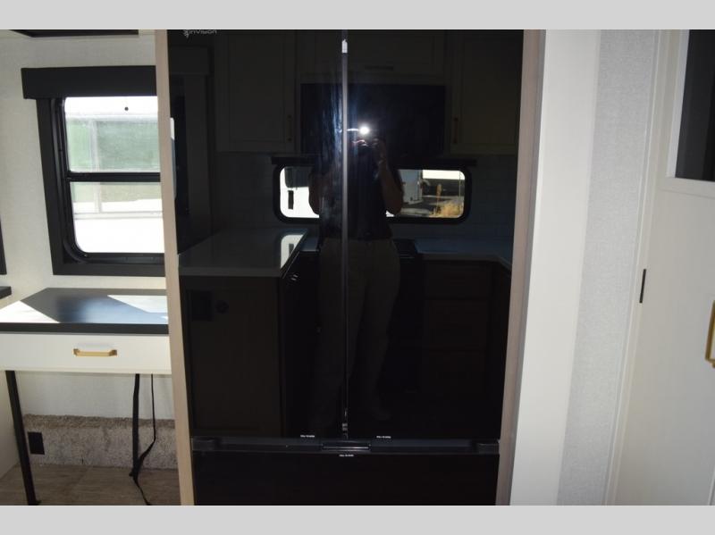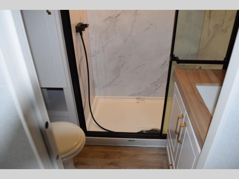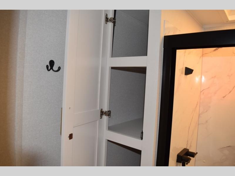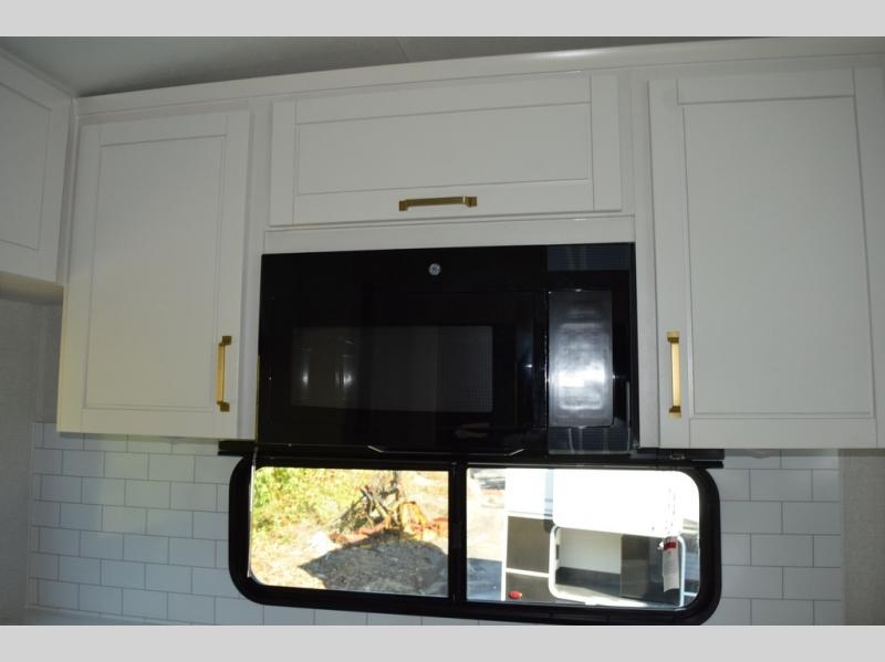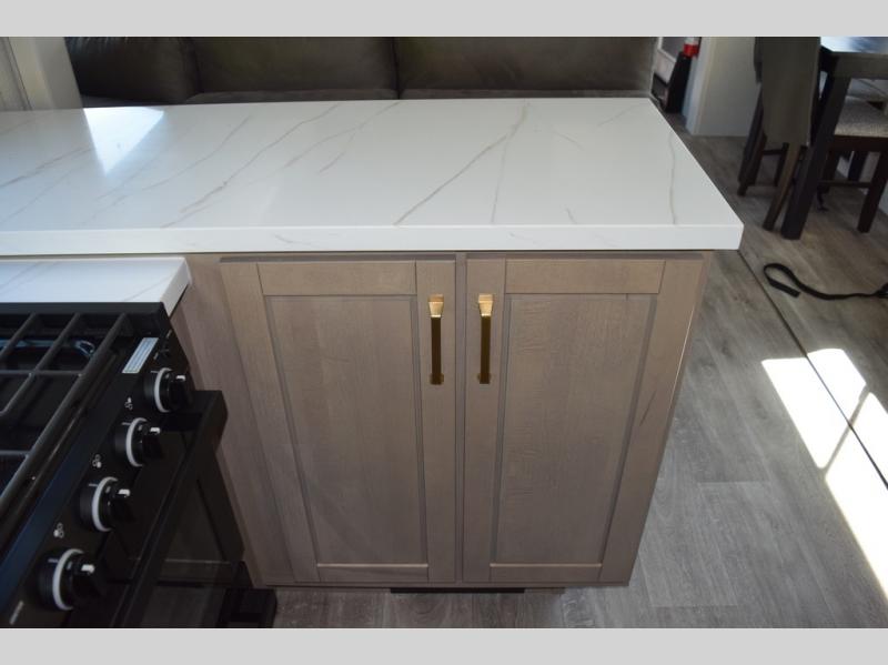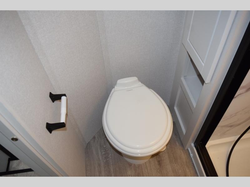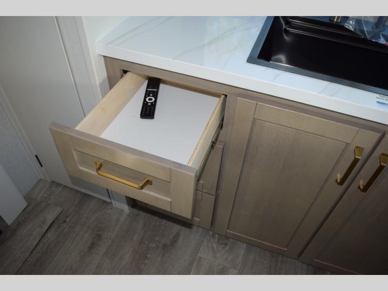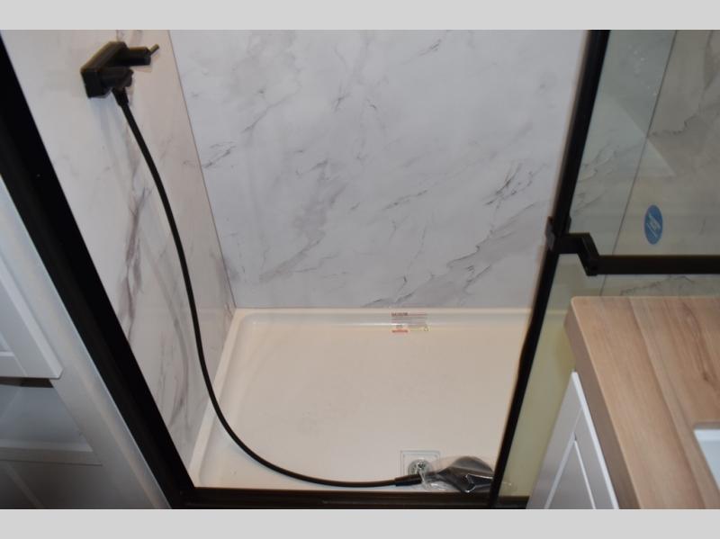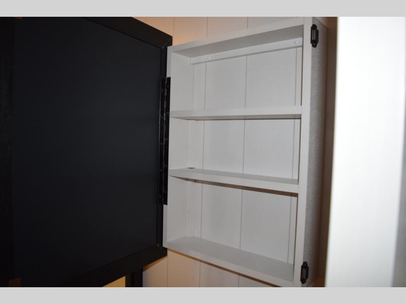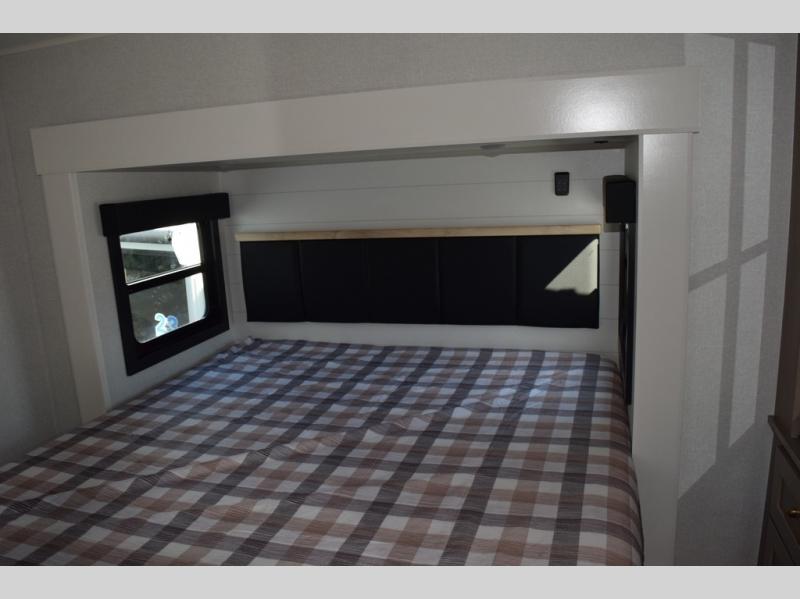 It will be so easy to enjoy time in this spacious fifth wheel! The chef of your group is sure to love the rear kitchen with a U-shaped counter and plenty of storage for food and dishes. The middle living area includes an entertainment center with a fireplace across from the L-shaped sofa for movie nights. There is also a desk to get some work done and a roll-top dinette with two chairs to dine at. Heading up front, you'll find the spacious bathroom that includes a shower with a seat, and the front private bedroom with a king bed slide out. There is also a chest with a TV, front shelves with drawers, plus washer and dryer prep!