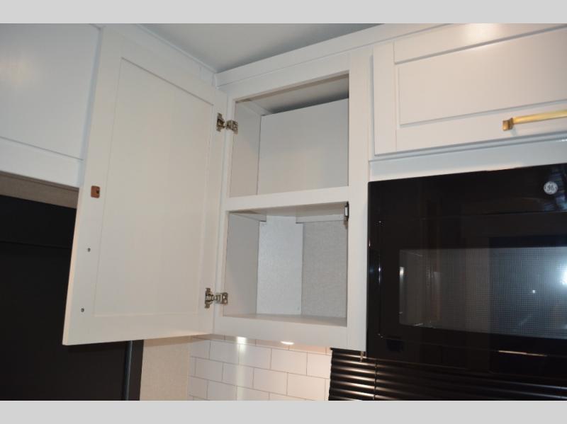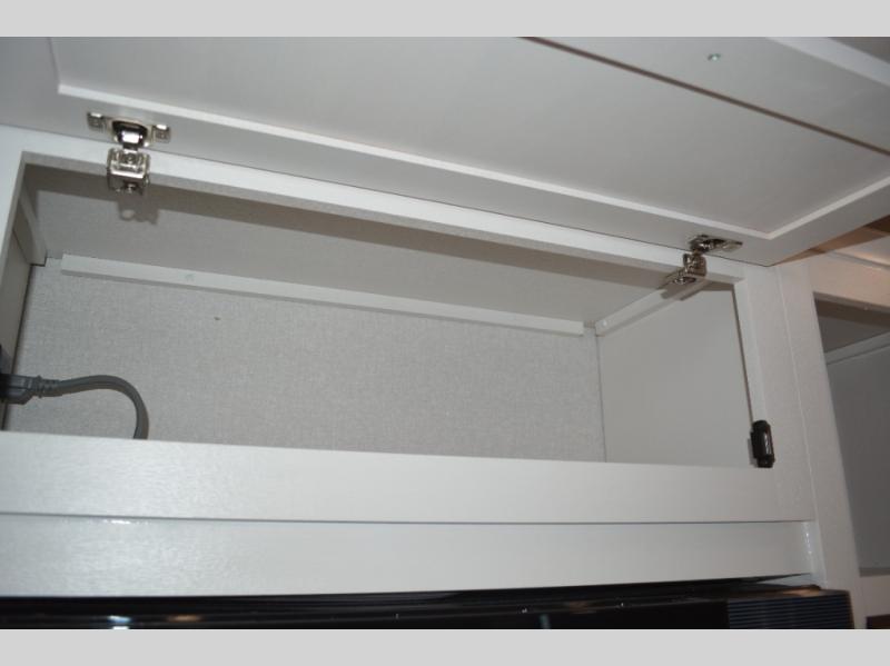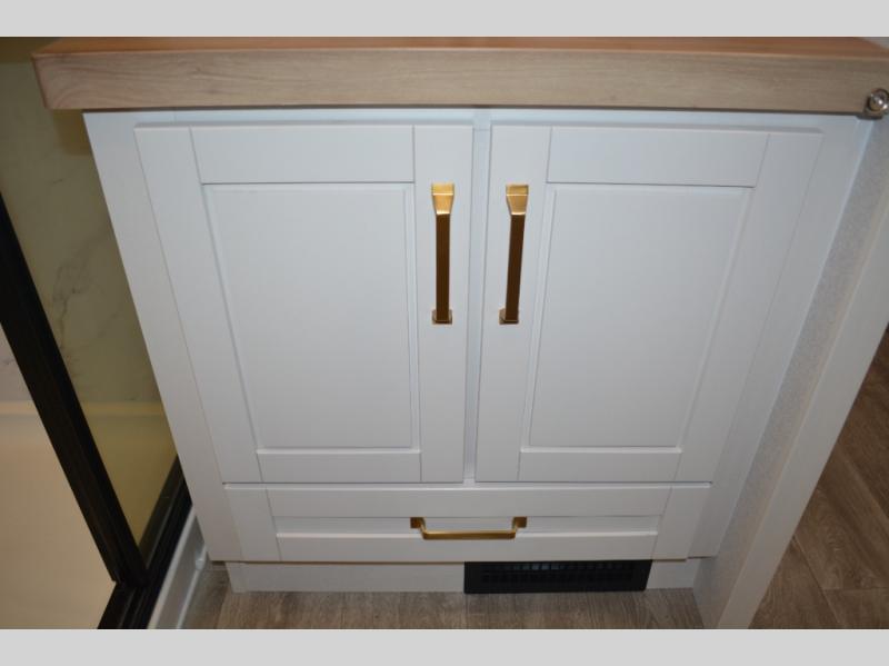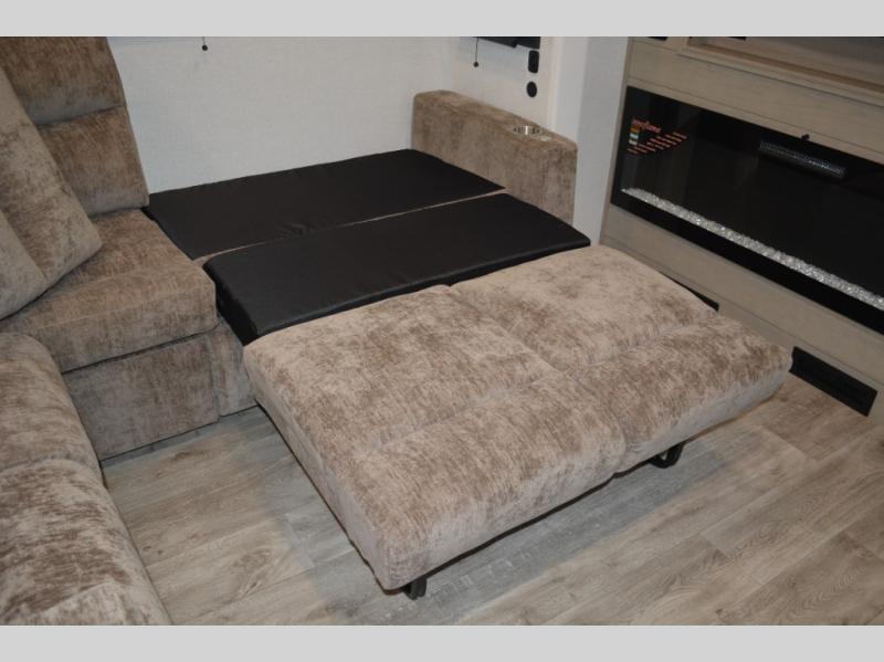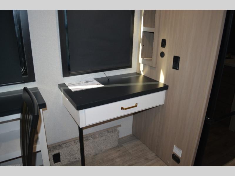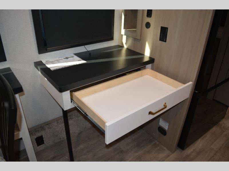 It will be so easy to enjoy time in this spacious fifth wheel! The chef of your group is sure to love the rear kitchen with a U-shaped counter and plenty of storage for food and dishes. The middle living area includes an entertainment center with a fireplace across from the L-shaped sofa for movie nights. There is also a desk to get some work done and a roll-top dinette with two chairs to dine at. Heading up front, you'll find the spacious bathroom that includes a shower with a seat, and the front private bedroom with a king bed slide out. There is also a chest with a TV, front shelves with drawers, plus washer and dryer prep!