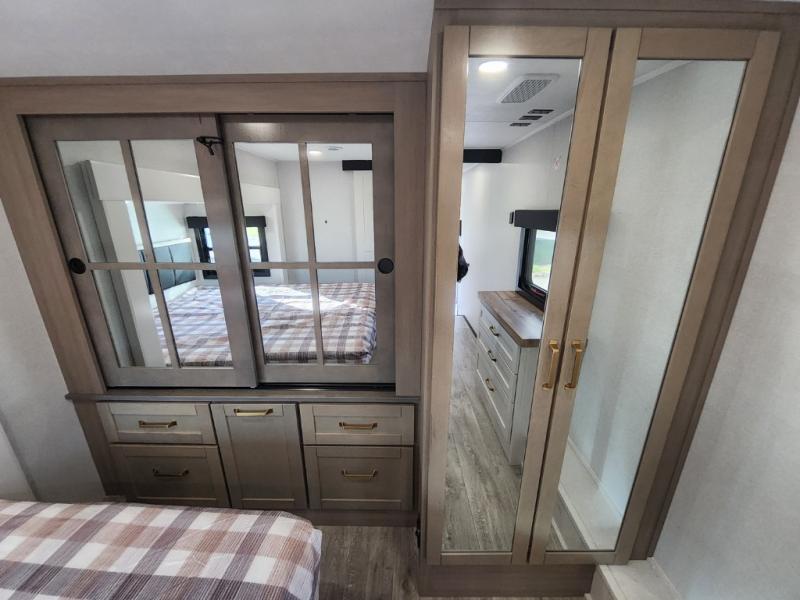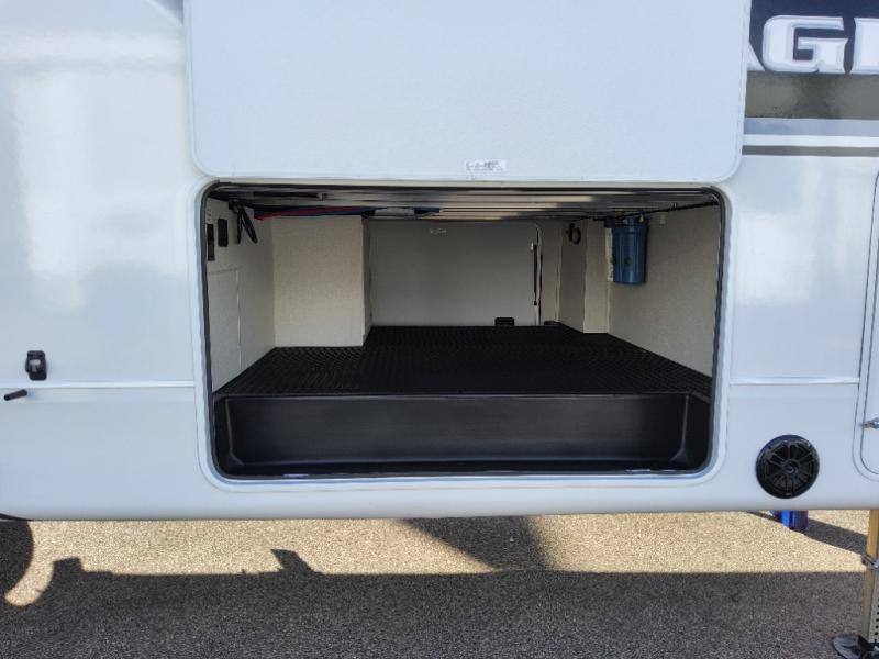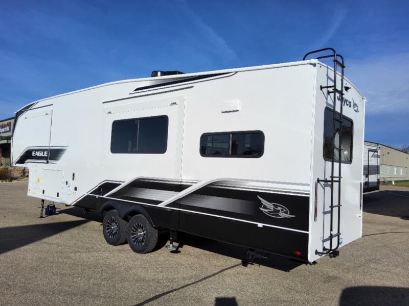 With any Eagle fifth wheel by Jayco you will appreciate durable construction materials, like the Magnum Truss Roof and the Stronghold VBL laminated walls. The JAYCOMMAND Smart RV system puts you in control of your RV's functions, and the 5 Star Handling Package will provide smooth towing from home to camp. Each model features Climate Shield zero-degree tested weather protection and the industry-exclusive HELIX cooling system that features two 15,000 BTU Whisper Quiet A/C's to keep you comfortable year around. Some of the exterior conveniences you are sure to love are the pass-through storage with Slam-Latch baggage doors and an automotive style front cap with max turn radius. The Eagle fifth wheels are designed to make you feel at home with solid hardwood slide fascia, residential vinyl flooring throughout, 100% no floor vents, and blackout roller shades with reflective side throughout for added privacy and insulation.