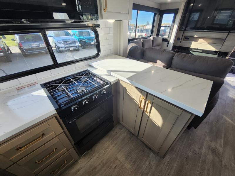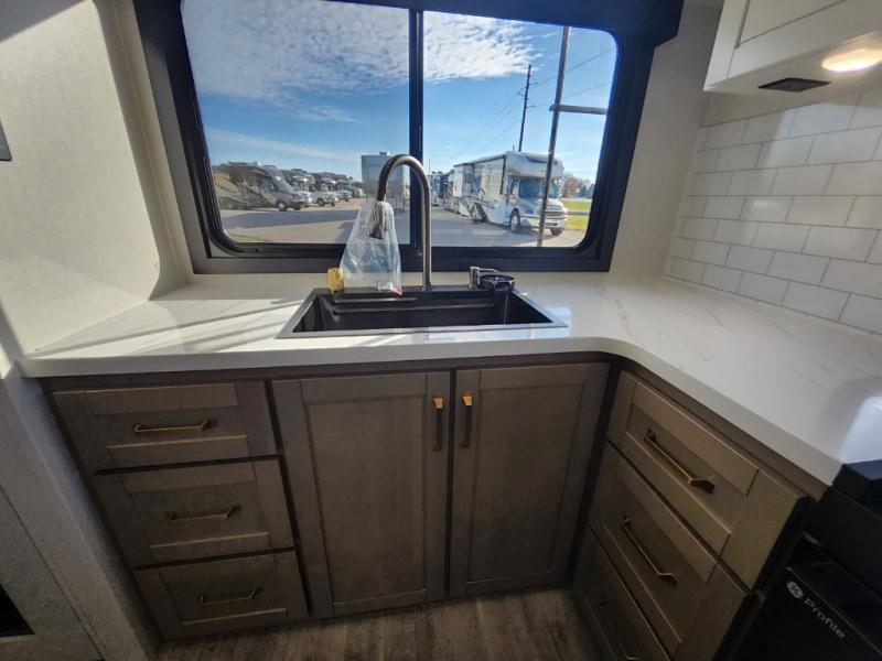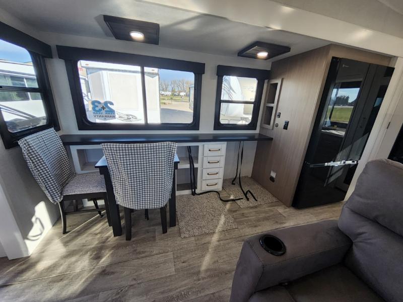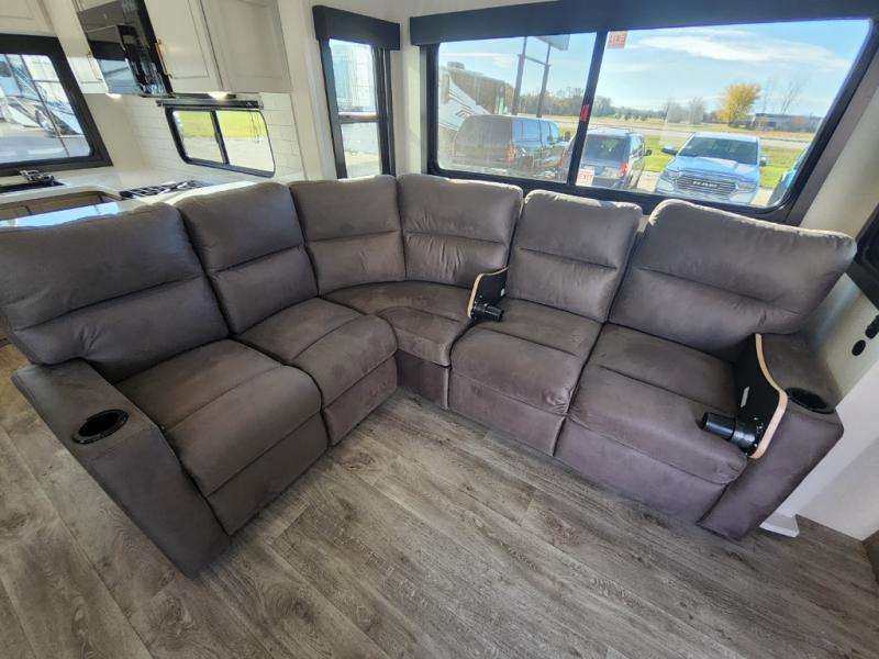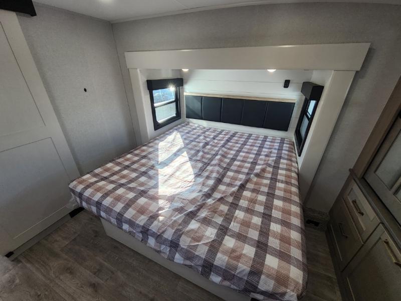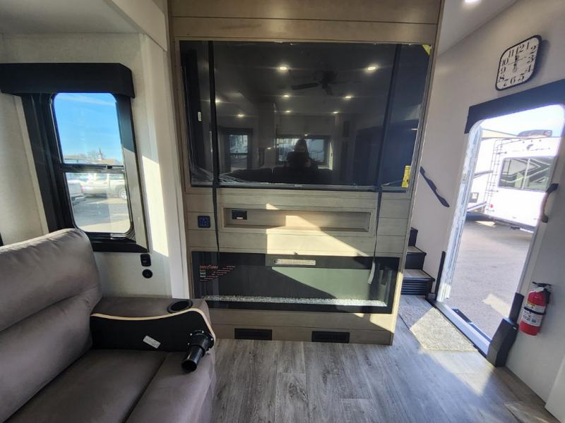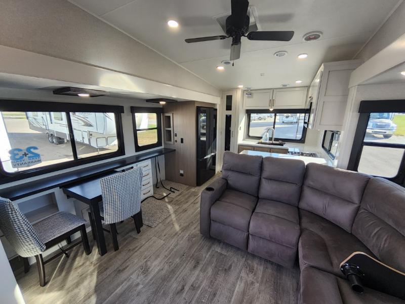 It will be so easy to enjoy time in this spacious fifth wheel! The chef of your group is sure to love the rear kitchen with a U-shaped counter and plenty of storage for food and dishes. The middle living area includes an entertainment center with a fireplace across from the L-shaped sofa for movie nights. There is also a desk to get some work done and a roll-top dinette with two chairs to dine at. Heading up front, you'll find the spacious bathroom that includes a shower with a seat, and the front private bedroom with a king bed slide out. There is also a chest with a TV, front shelves with drawers, plus washer and dryer prep!