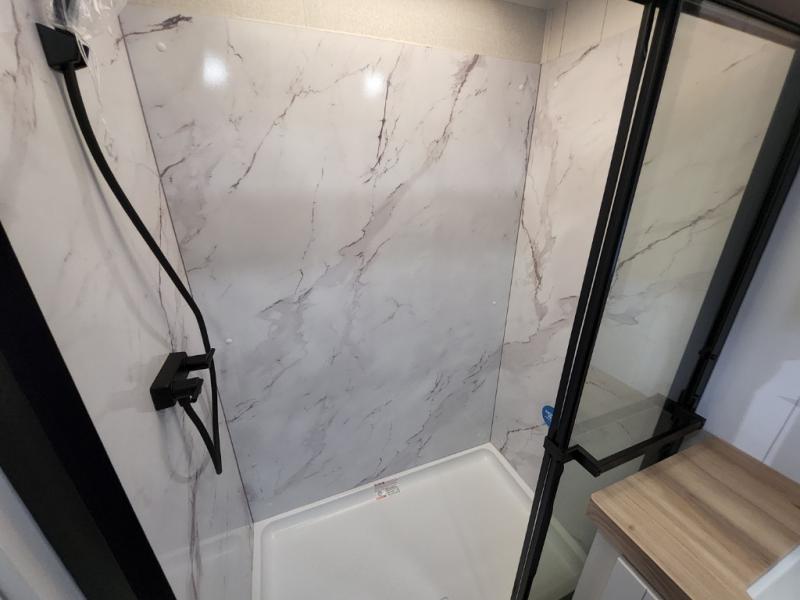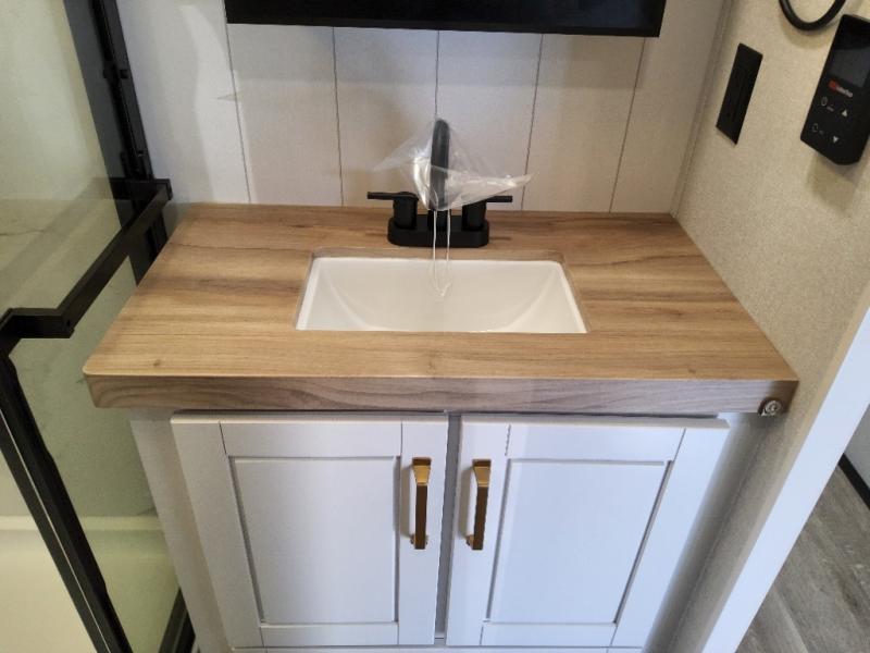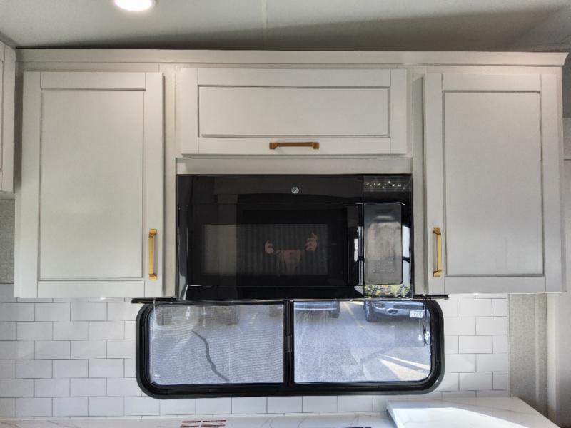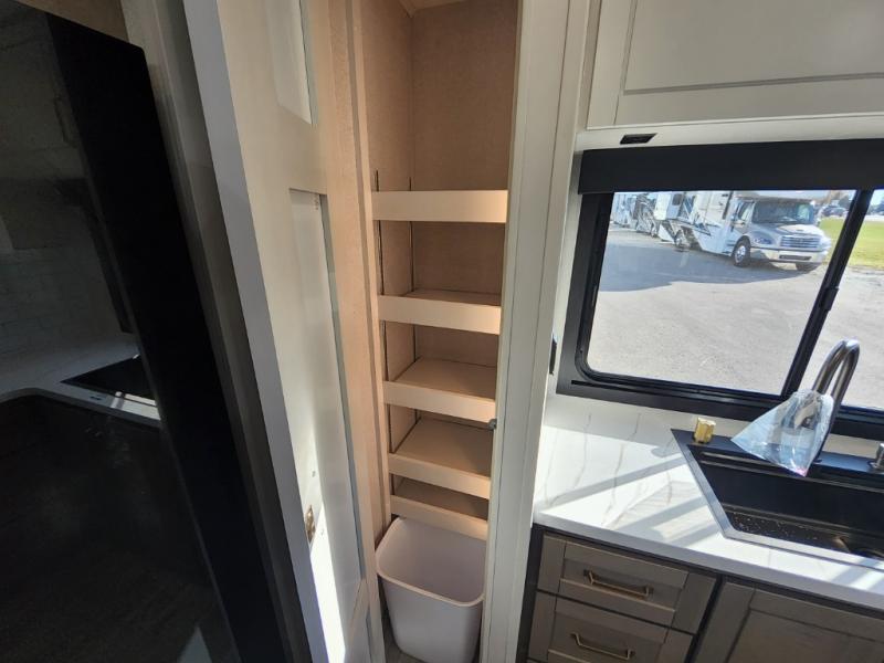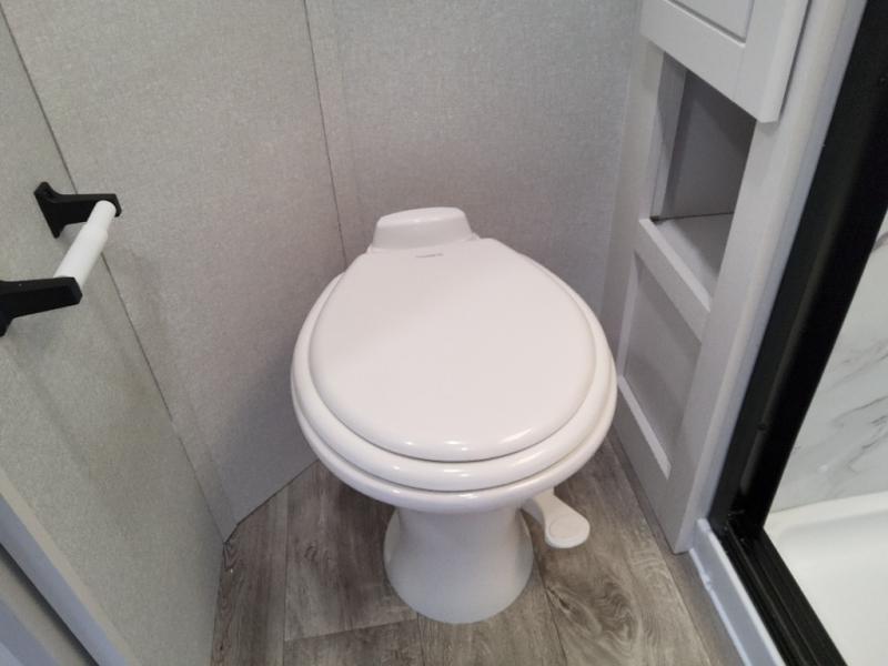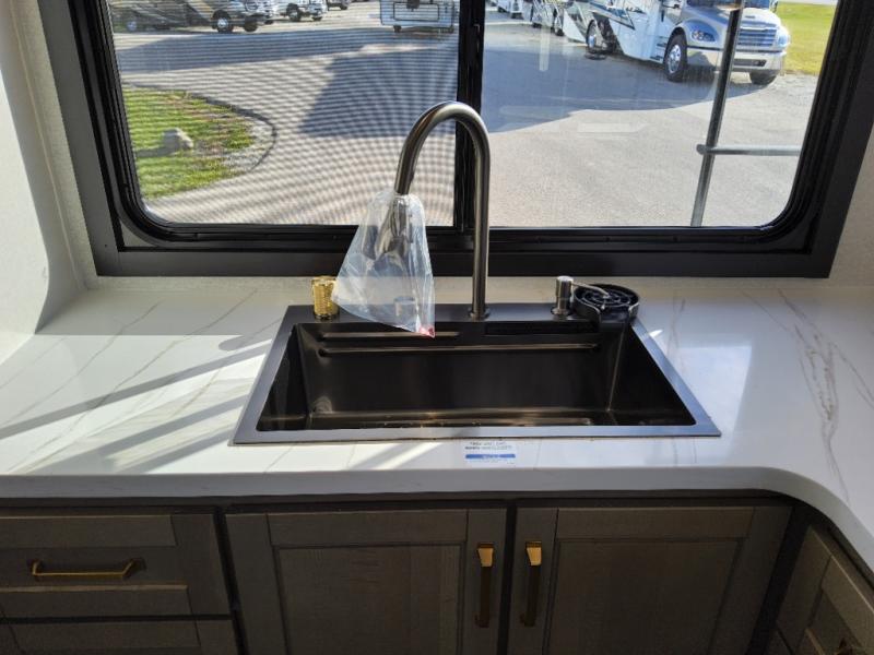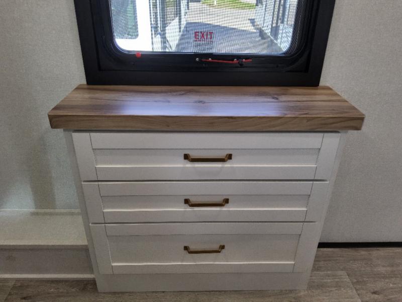 It will be so easy to enjoy time in this spacious fifth wheel! The chef of your group is sure to love the rear kitchen with a U-shaped counter and plenty of storage for food and dishes. The middle living area includes an entertainment center with a fireplace across from the L-shaped sofa for movie nights. There is also a desk to get some work done and a roll-top dinette with two chairs to dine at. Heading up front, you'll find the spacious bathroom that includes a shower with a seat, and the front private bedroom with a king bed slide out. There is also a chest with a TV, front shelves with drawers, plus washer and dryer prep!