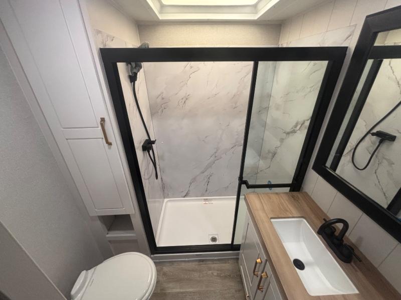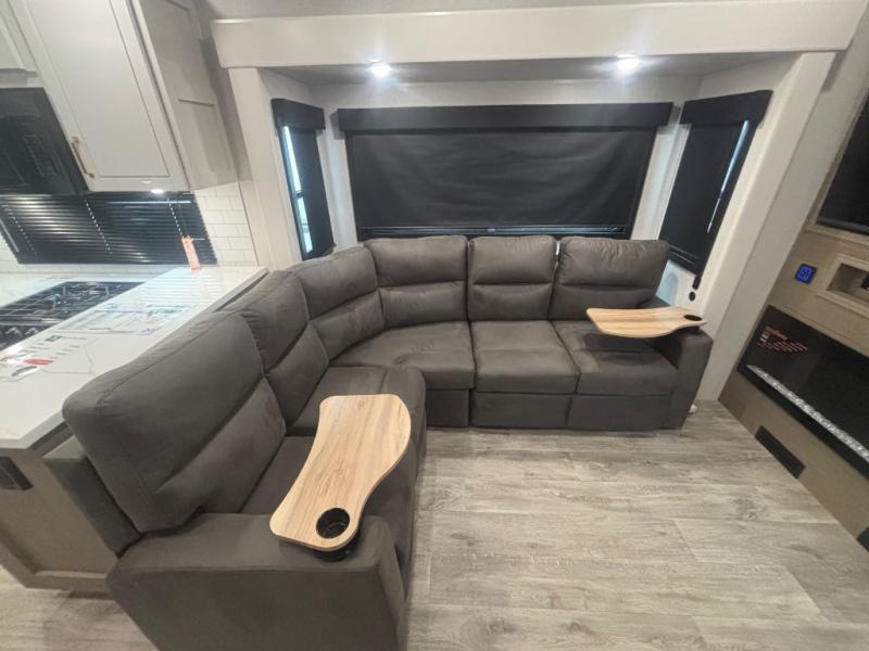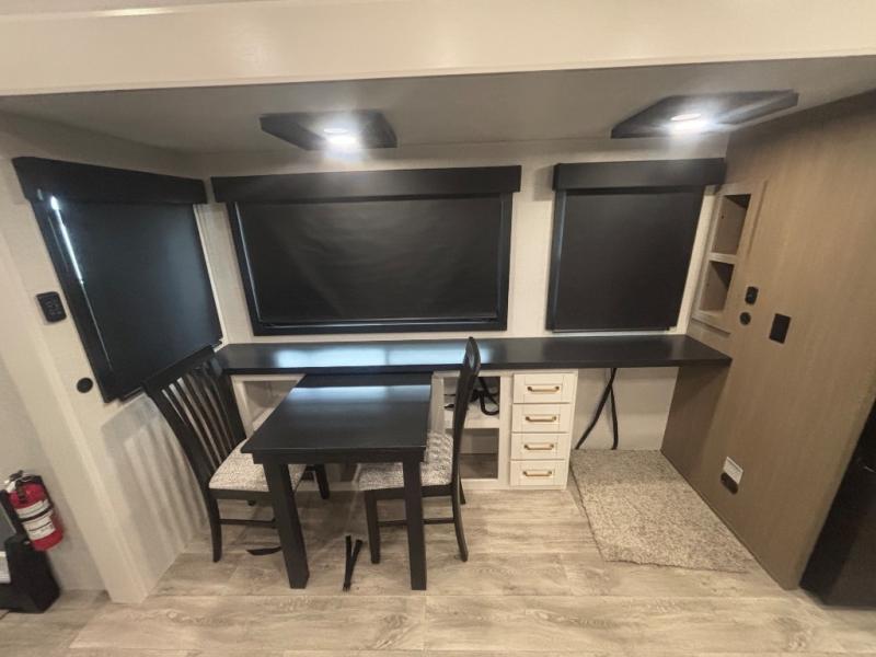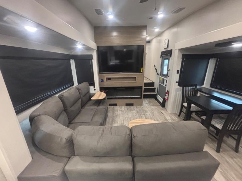 It will be so easy to enjoy time in this spacious fifth wheel! The chef of your group is sure to love the rear kitchen with a U-shaped counter and plenty of storage for food and dishes. The middle living area includes an entertainment center with a fireplace across from the L-shaped sofa for movie nights. There is also a desk to get some work done and a roll-top dinette with two chairs to dine at. Heading up front, you'll find the spacious bathroom that includes a shower with a seat, and the front private bedroom with a king bed slide out. There is also a chest with a TV, front shelves with drawers, plus washer and dryer prep!