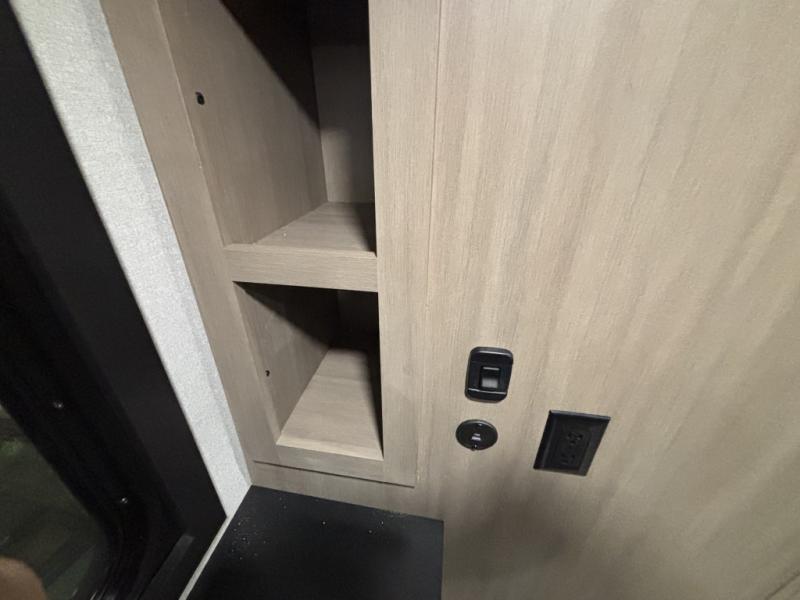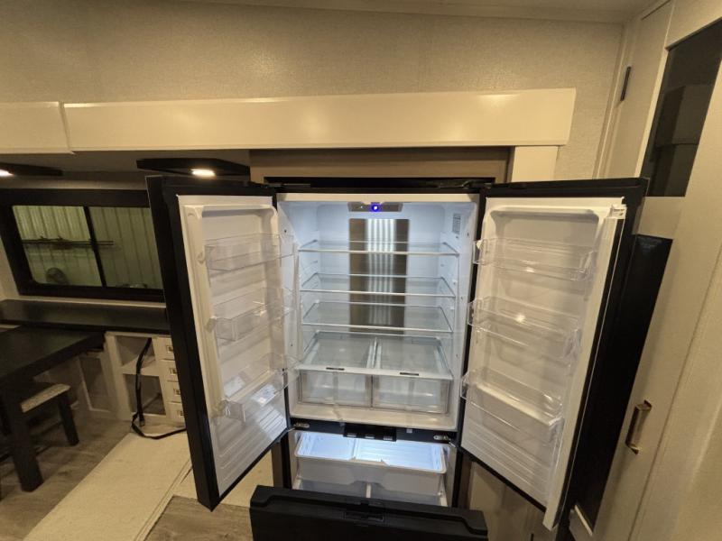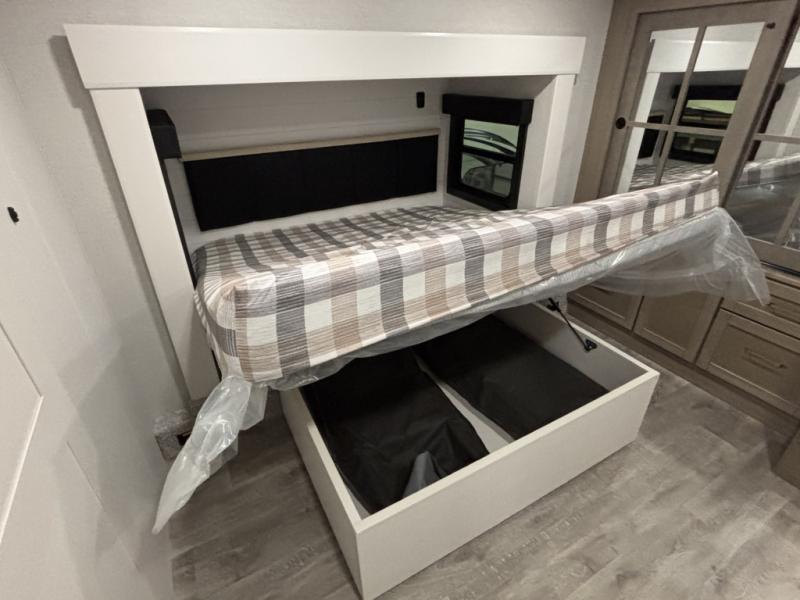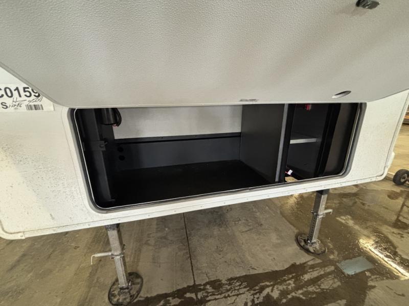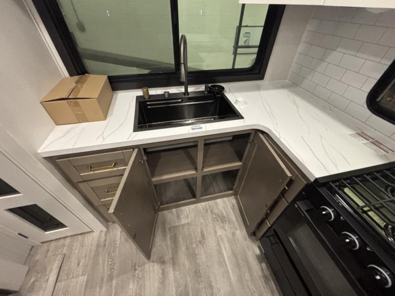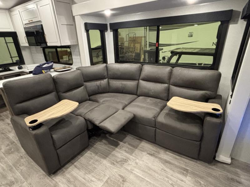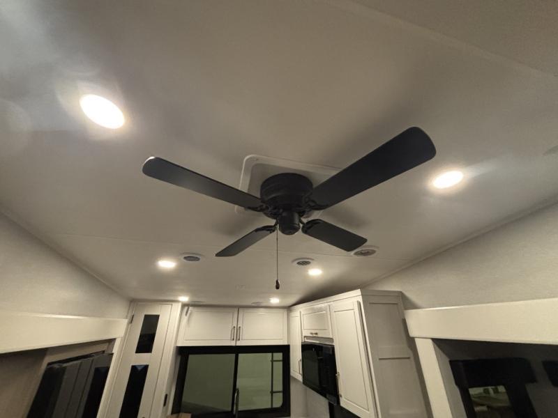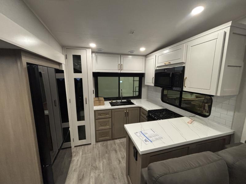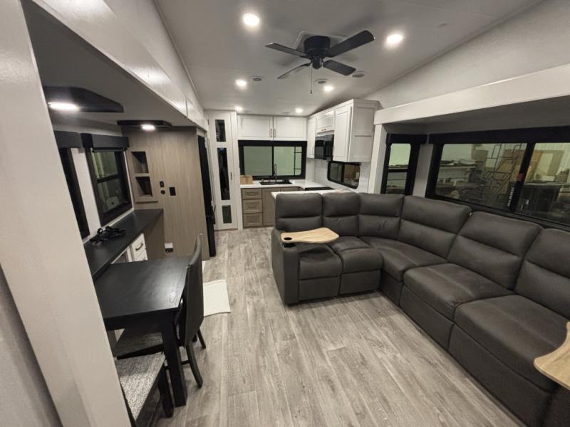 It will be so easy to enjoy time in this spacious fifth wheel! The chef of your group is sure to love the rear kitchen with a U-shaped counter and plenty of storage for food and dishes. The middle living area includes an entertainment center with a fireplace across from the L-shaped sofa for movie nights. There is also a desk to get some work done and a roll-top dinette with two chairs to dine at. Heading up front, you'll find the spacious bathroom that includes a shower skylight, and the front private bedroom with a king bed slide out. There is also a chest with a TV, front shelves with drawers, plus washer and dryer prep!