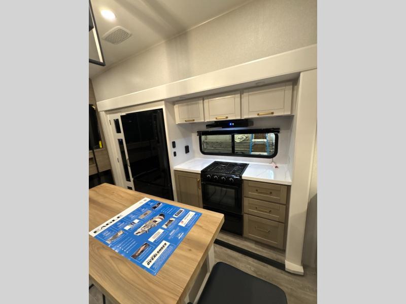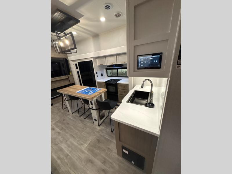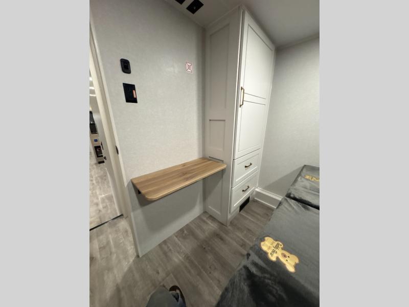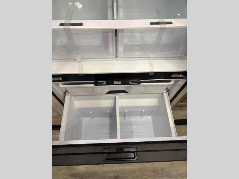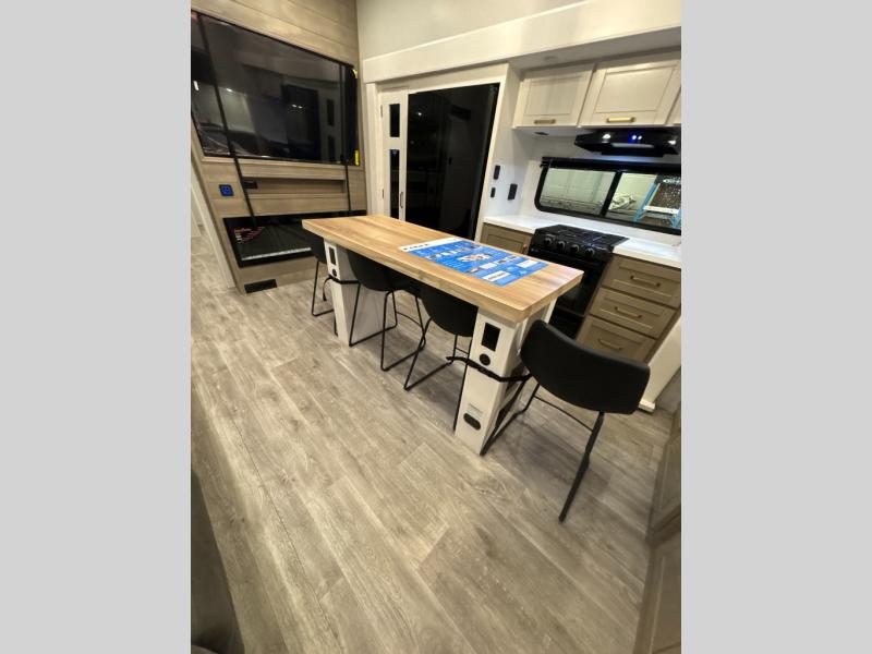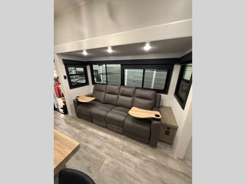 At the front of the unit, you’ll find one of the two bedrooms, featuring dual 34" x 76" twin beds that easily convert into an expansive 92" x 76" sleeping area with a fold-down bed ideal for guests or family. This space also includes a fold-down desk for work or study, along with a wardrobe with washer/dryer prep. Just down the hall, a convenient half bath adds extra functionality for guests. In the middle, the living area and kitchen shine with dual opposing slide-outs that create an open, residential feel. One slide houses a spacious pantry, a 16 cu. ft. refrigerator, and a 21" range with edge-to-edge grates, complemented by abundant overhead cabinetry, while the adjacent area features a 30" over-the-range black and stainless microwave and sink. The central kitchen island dinette provides the perfect gathering spot for meals or game nights. Across the way, a 93" theater sofa with cup holders and end tables offers a cozy place to relax. At the rear, the second bedroom delivers true comfort with a 72" x 80" king bed, a wardrobe and dresser for storage, and a private full bathroom complete with generous counter space and a 30" x 48" shower—creating a luxurious retreat at the end of the day.
