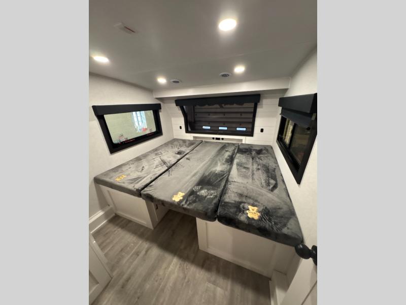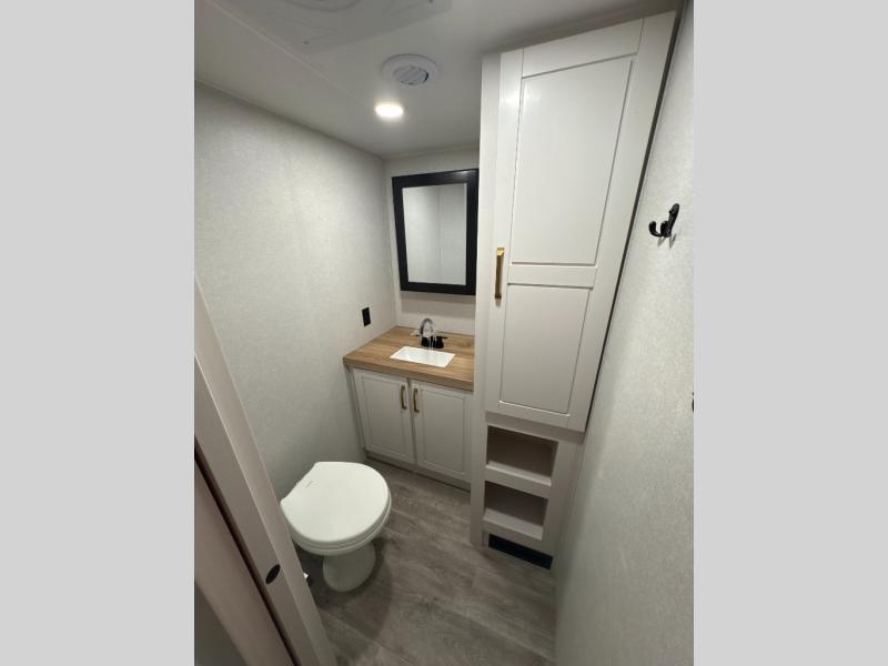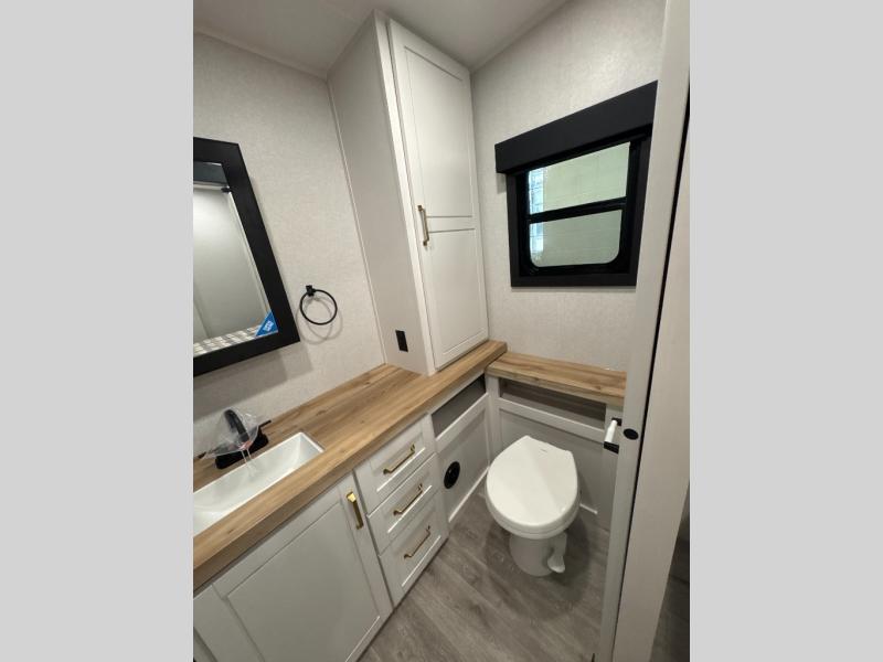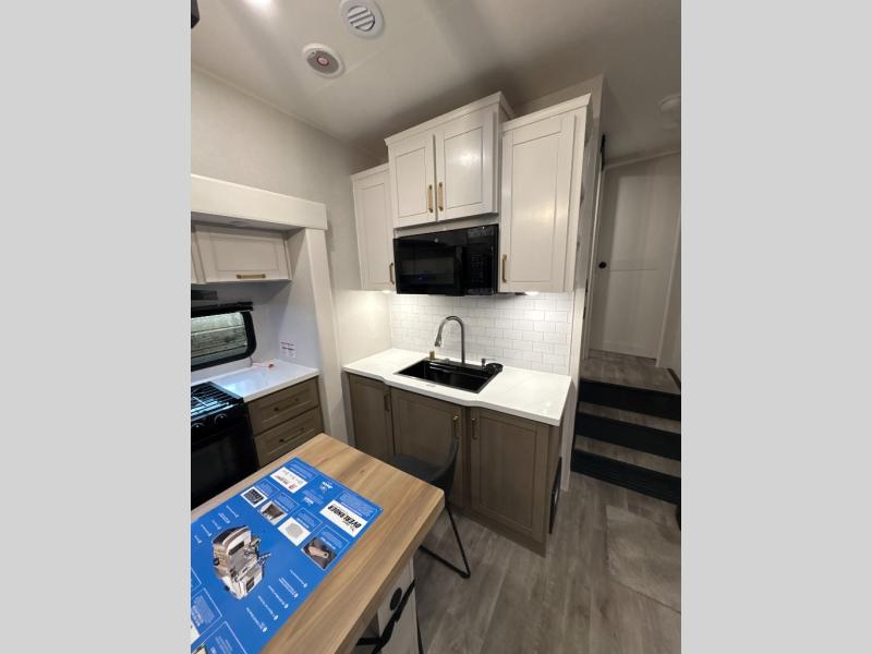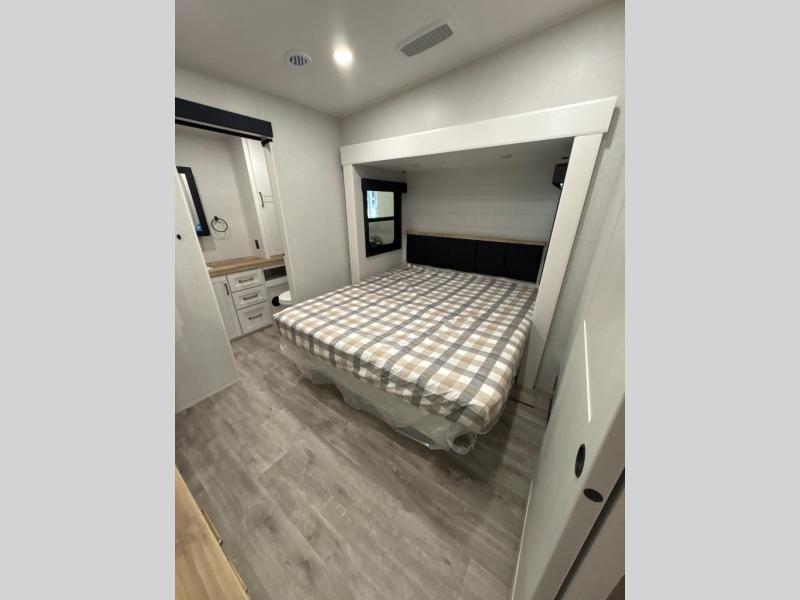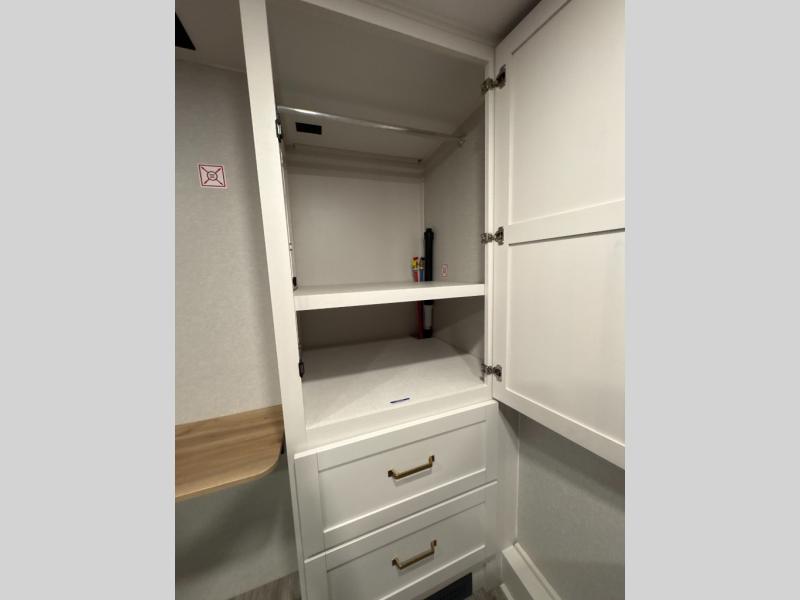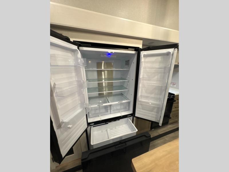 At the front of the unit, you’ll find one of the two bedrooms, featuring dual 34" x 76" twin beds that easily convert into an expansive 92" x 76" sleeping area with a fold-down bed ideal for guests or family. This space also includes a fold-down desk for work or study, along with a wardrobe with washer/dryer prep. Just down the hall, a convenient half bath adds extra functionality for guests. In the middle, the living area and kitchen shine with dual opposing slide-outs that create an open, residential feel. One slide houses a spacious pantry, a 16 cu. ft. refrigerator, and a 21" range with edge-to-edge grates, complemented by abundant overhead cabinetry, while the adjacent area features a 30" over-the-range black and stainless microwave and sink. The central kitchen island dinette provides the perfect gathering spot for meals or game nights. Across the way, a 93" theater sofa with cup holders and end tables offers a cozy place to relax. At the rear, the second bedroom delivers true comfort with a 72" x 80" king bed, a wardrobe and dresser for storage, and a private full bathroom complete with generous counter space and a 30" x 48" shower—creating a luxurious retreat at the end of the day.