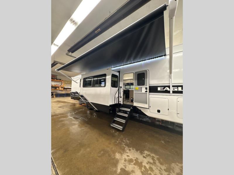 With any Eagle fifth wheel by Jayco you will appreciate durable construction materials, like the Magnum Truss Roof and the Stronghold VBL laminated walls. The JAYCOMMAND Smart RV system puts you in control of your RV's functions, and the 4 Star Handling Package will provide smooth towing from home to camp. Each model features Climate Shield zero-degree tested weather protection and the industry-exclusive HELIX cooling system that features two 15,000 BTU Whisper Quiet A/C's to keep you comfortable during those colder months. Some of the exterior conveniences you are sure to love are the pass-through storage with Slam-Latch baggage doors and an automotive style front cap with max turn radius. The Eagle fifth wheels are designed to make you feel at home with solid surface countertops, residential vinyl flooring throughout, 100% no floor vents, and blackout roller shades with reflective side throughout for added privacy and insulation.