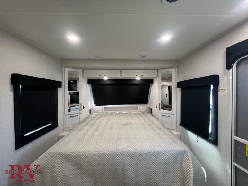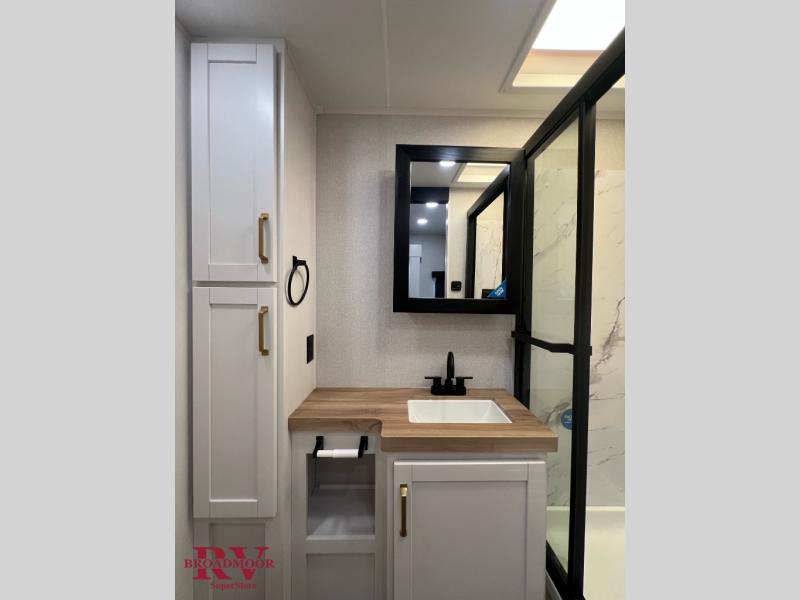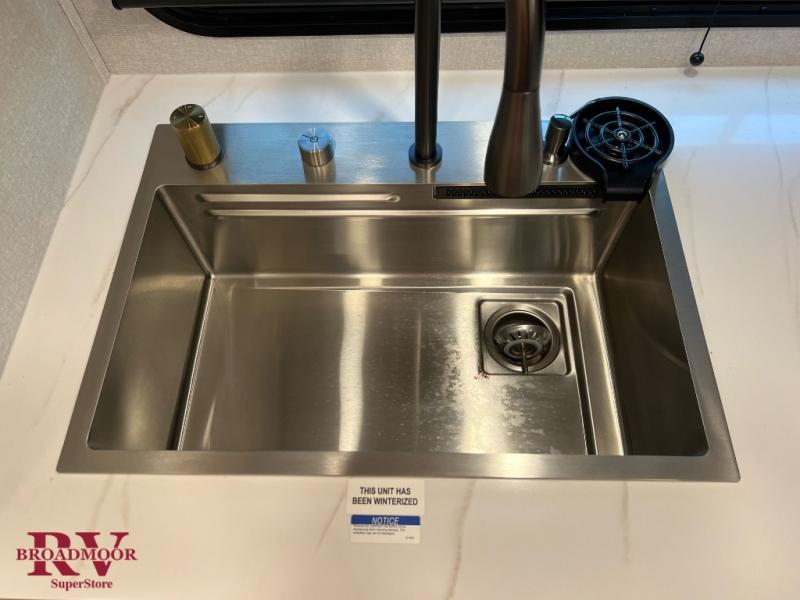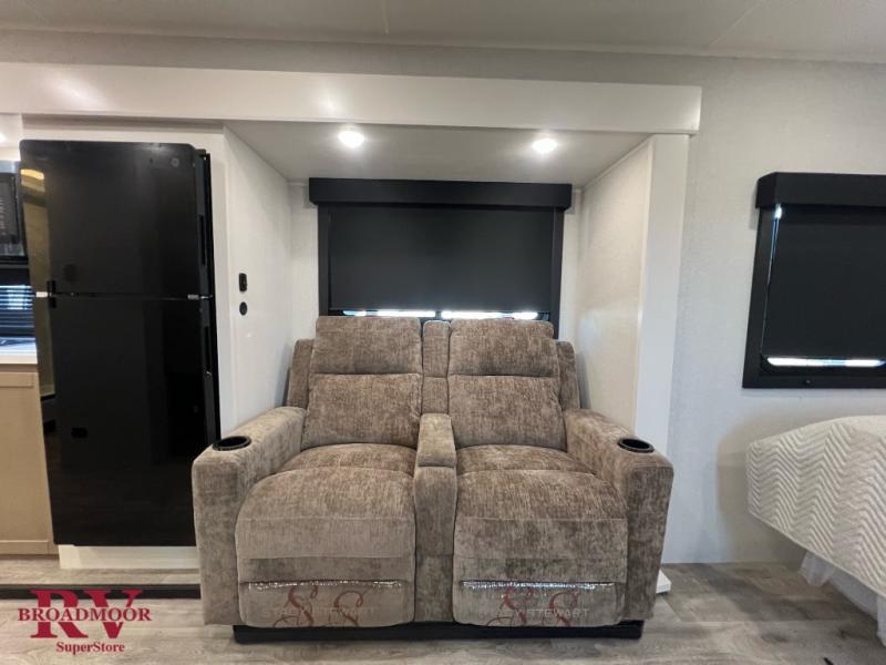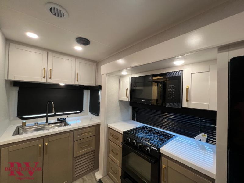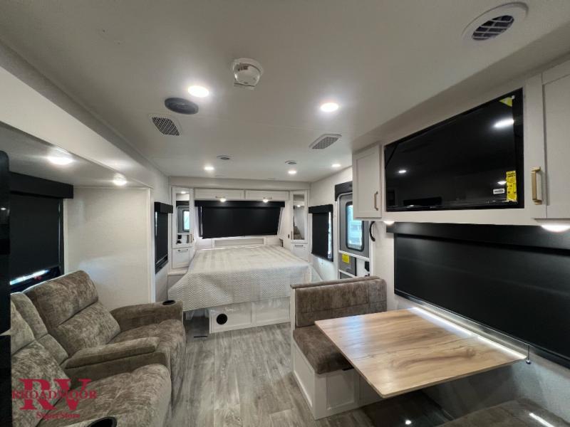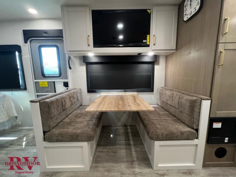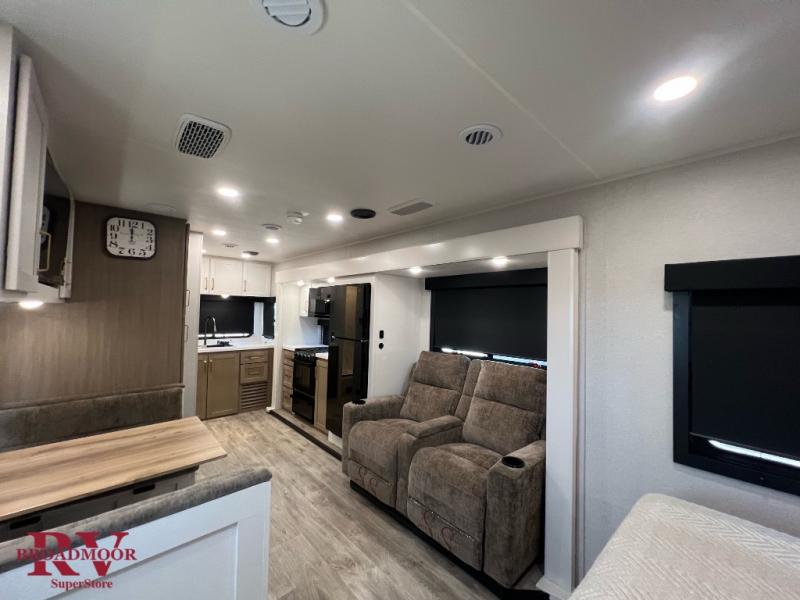 It will be so easy to enjoy camping trips when you're in this travel trailer! A full kitchen, complete with a three burner cooktop, over-the-range microwave, and 10 cu. ft. 12V refrigerator will let you cook and store meals, and the booth dinette provides a place to dine. Within the large slide, you'll find the 60" theater sofa with cup holders which is across from the 40" 4K Ultra LED HD Smart TV! You'll love having a 66" x 80" Olympic queen bed to sleep on, and there are dual wardrobes to keep your clothes organized. And larger camp gear can go outside in the pass-thru storage!
