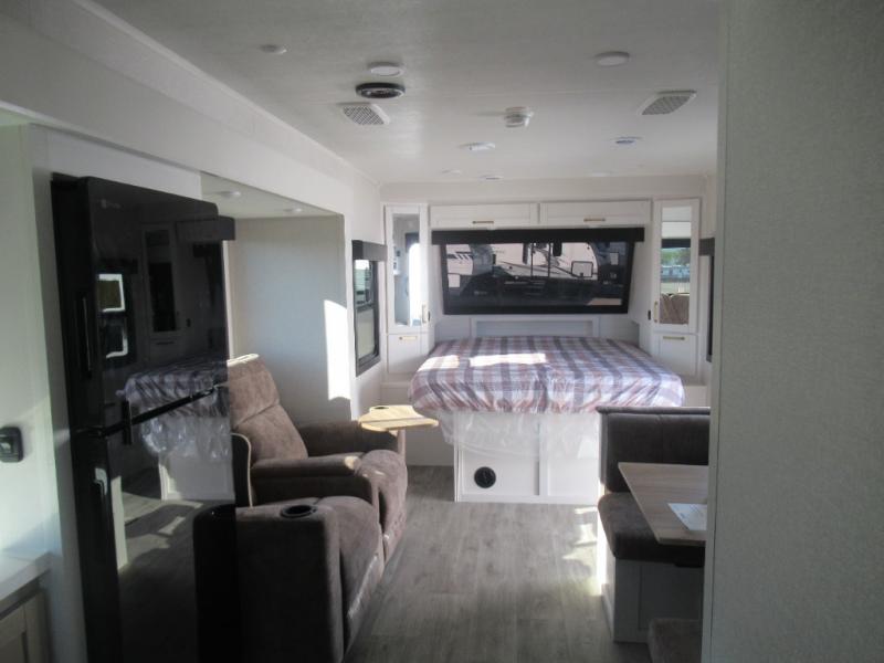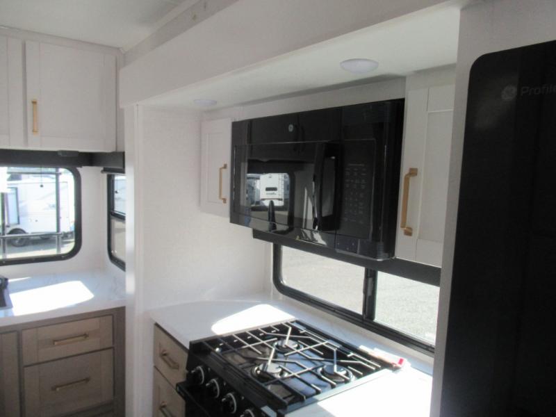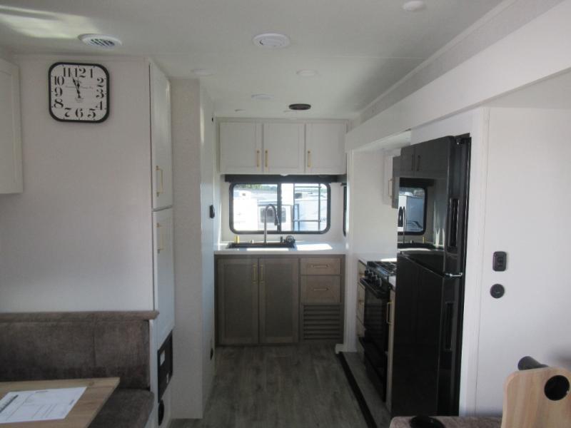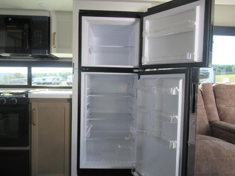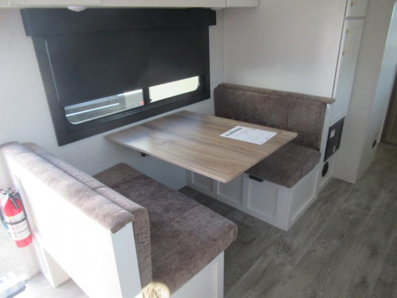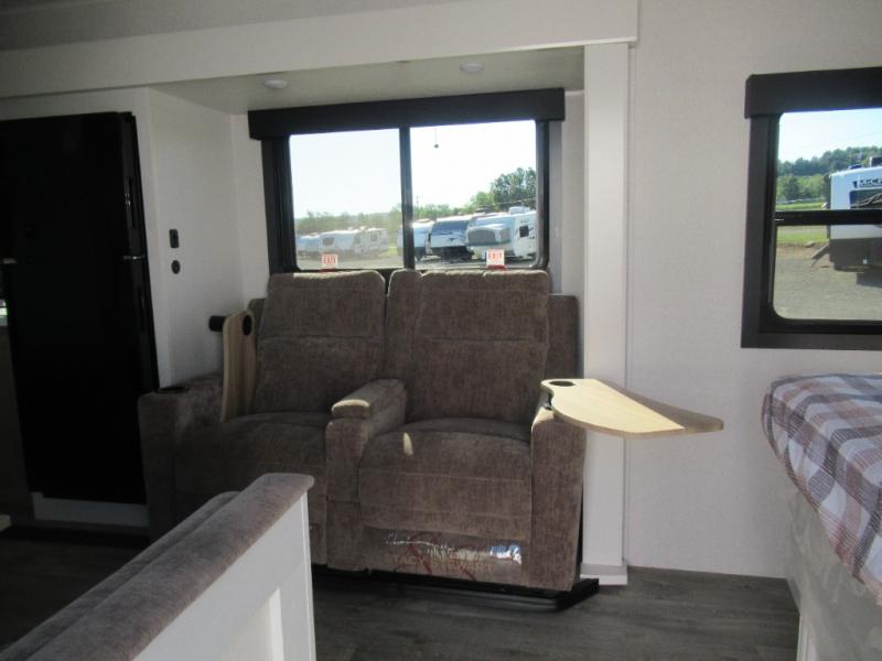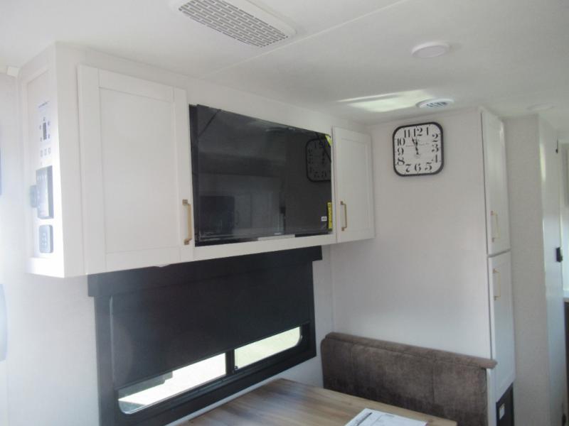 It will be so easy to enjoy camping trips when you're in this travel trailer! A full kitchen, complete with a three burner cooktop, over-the-range microwave, and 10 cu. ft. 12V refrigerator will let you cook and store meals, and the booth dinette provides a place to dine. Within the large slide, you'll find the 60" theater sofa with cup holders which is across from the 40" 4K Ultra LED HD Smart TV! You'll love having a 66" x 80" Olympic queen bed to sleep on, and there are dual wardrobes to keep your clothes organized. And larger camp gear can go outside in the pass-thru storage!
