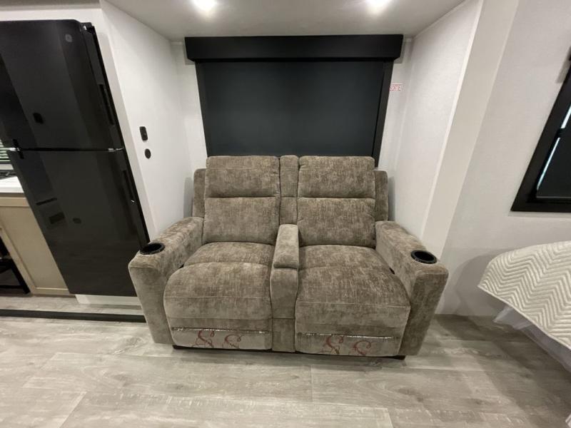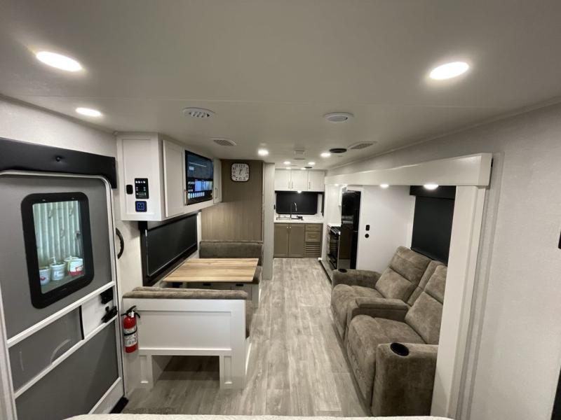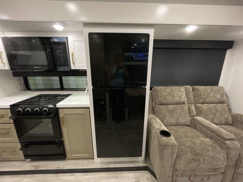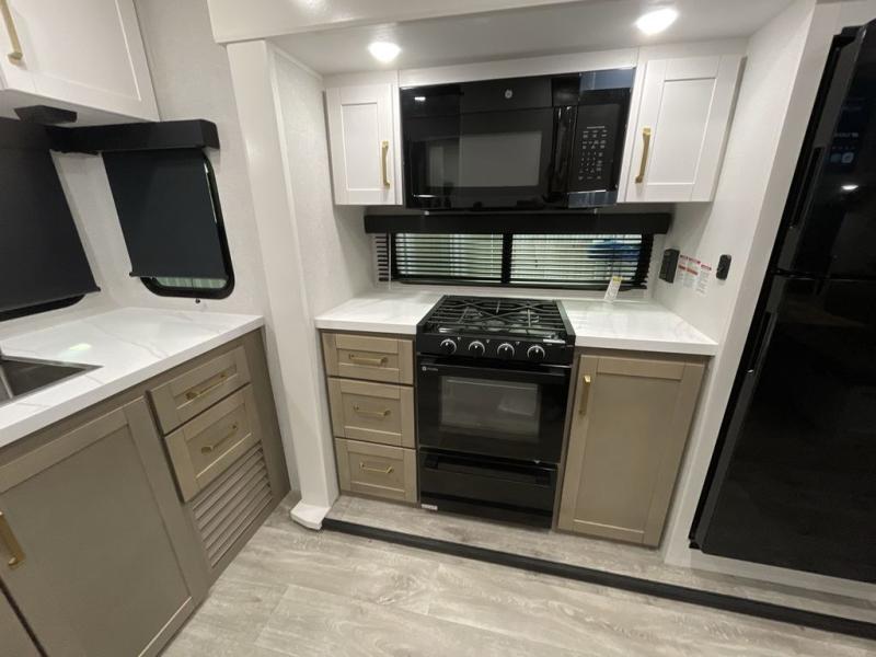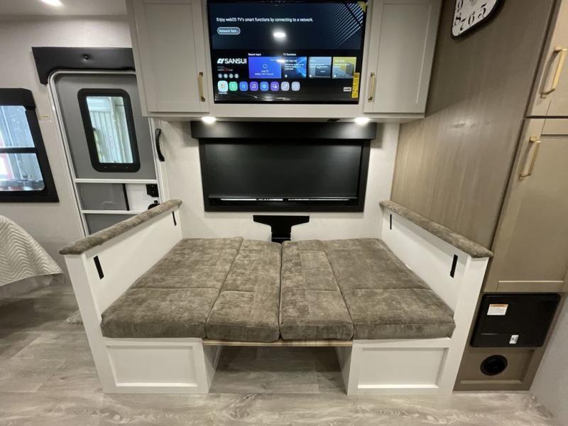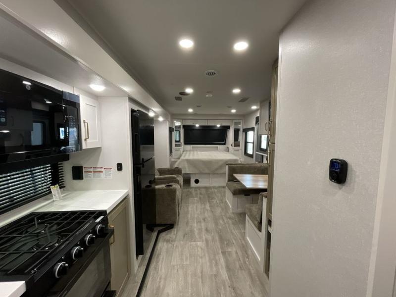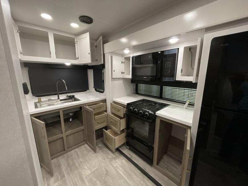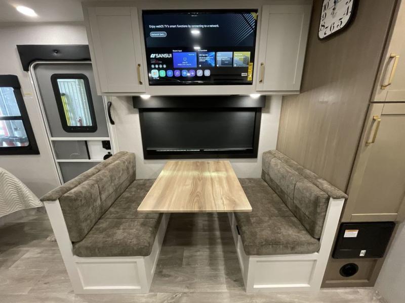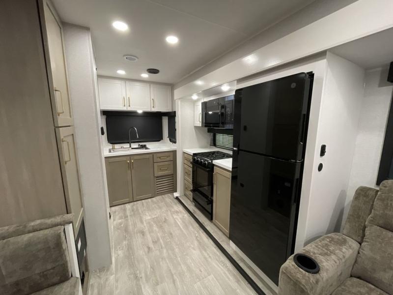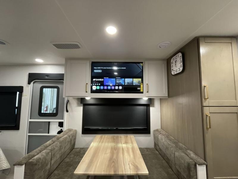It will be so easy to enjoy camping trips when you're in this travel trailer! A full kitchen, complete with a three burner cooktop, over-the-range microwave, and 10 cu. ft. 12V refrigerator will let you cook and store meals, and the booth dinette provides a place to dine. Within the large slide, you'll find the 60" theater sofa with cup holders which is across from the 4K Ultra LED HD Smart TV! You'll love having a 66" x 80" Olympic queen bed to sleep on, and there are dual wardrobes to keep your clothes organized. And larger camp gear can go outside in the pass-thru storage!