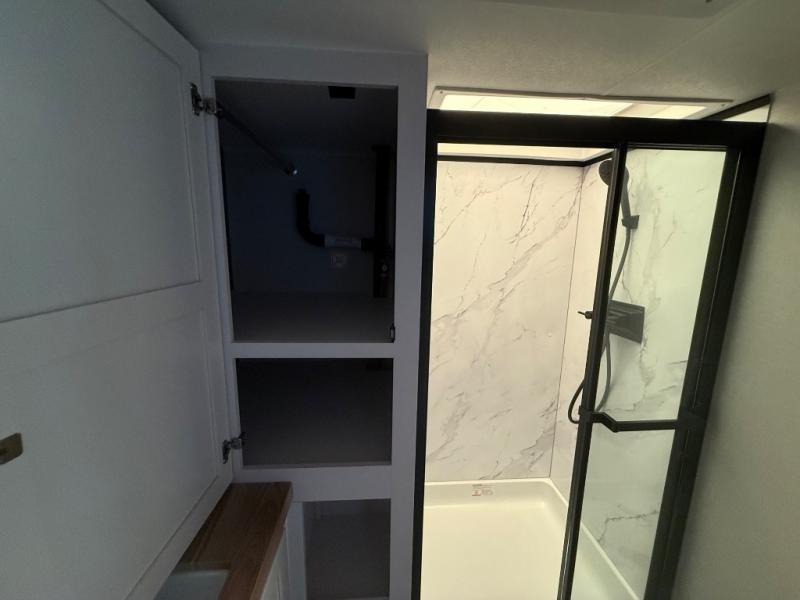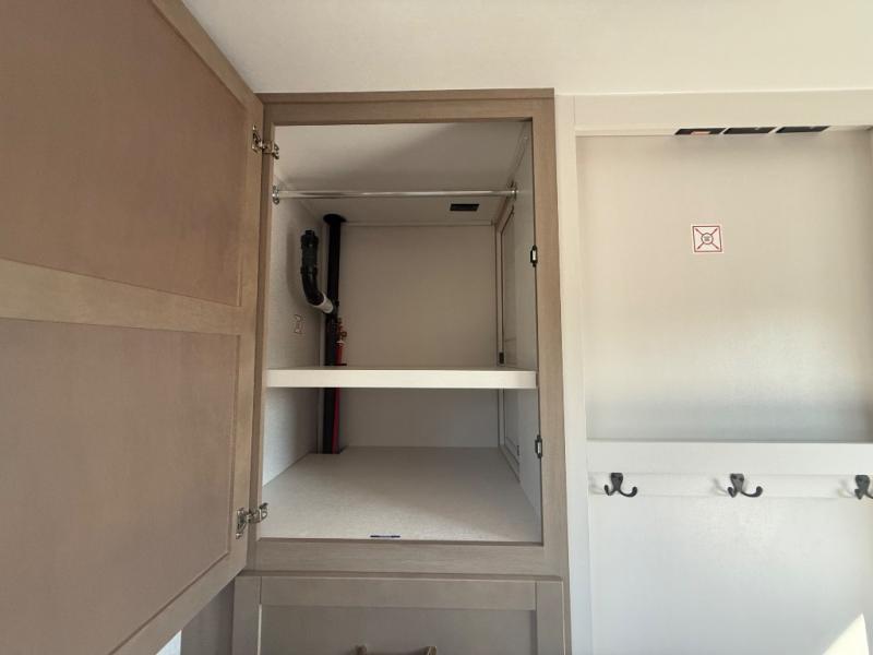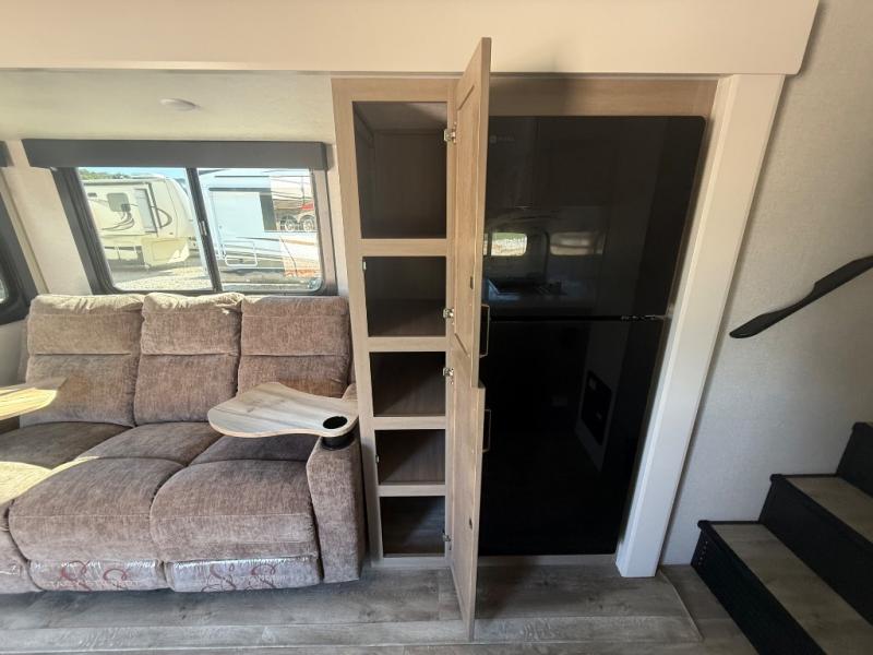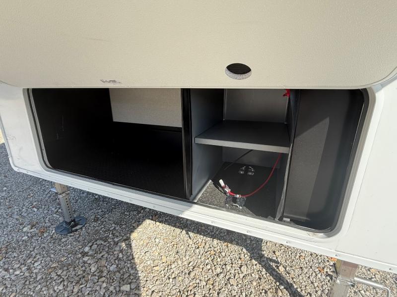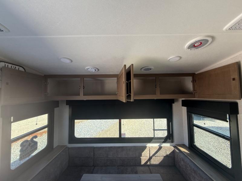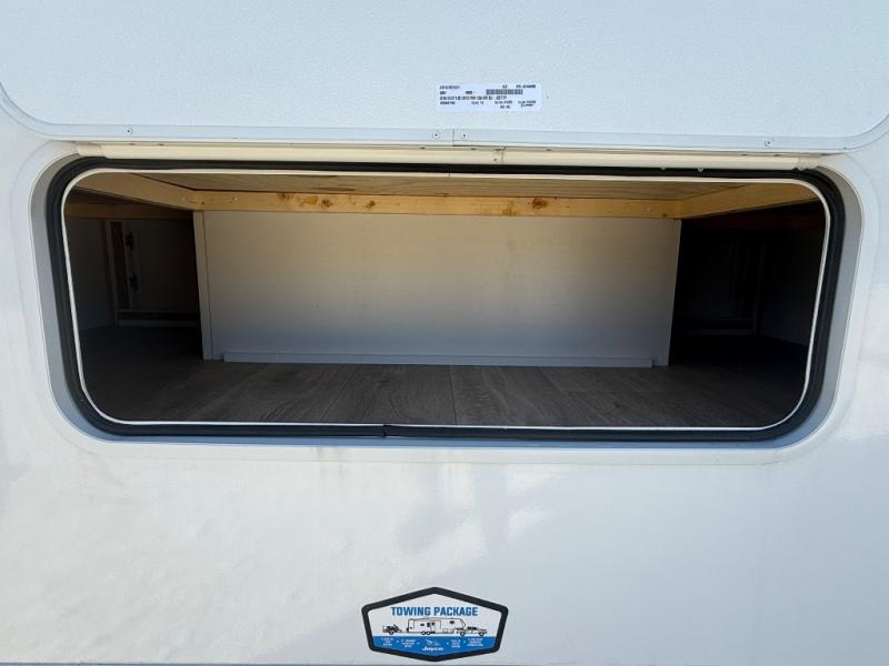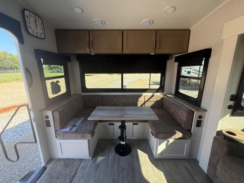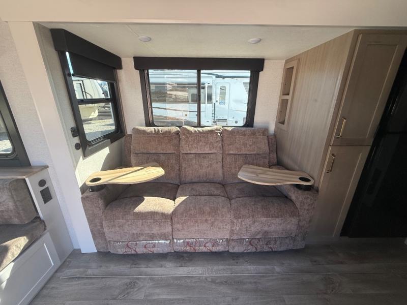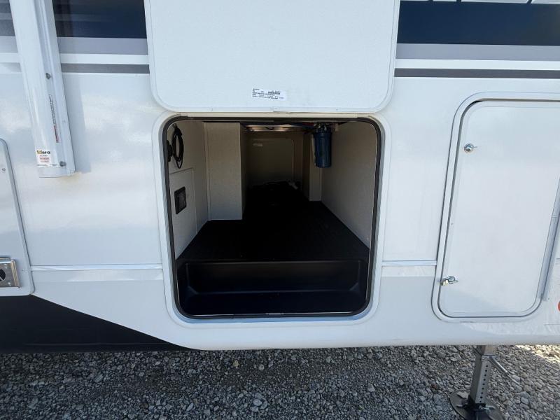 You'll have everything you need in this fifth wheel for enjoyable trips to the lake. Once you arrive at your destination, set up the 16' power awning, grab the fishing poles from the pass-through storage, and relax with a cold drink. And there is a Jayport with LP Quick Connect if you want to bring along your griddle. You and your group can head inside to play a game around the U-shaped dinette or relax on the theater seat across from the TV. The full kitchen includes a black and stainless 21" range, a GE microwave, plus a 12V refrigerator for perishables, and the full bath will let you clean up each day. When you're ready to call it a night, head to the front private bedroom for a great night's rest on the Olympic-size queen bed with dual wardrobes, while your guests sleep on the dinette!