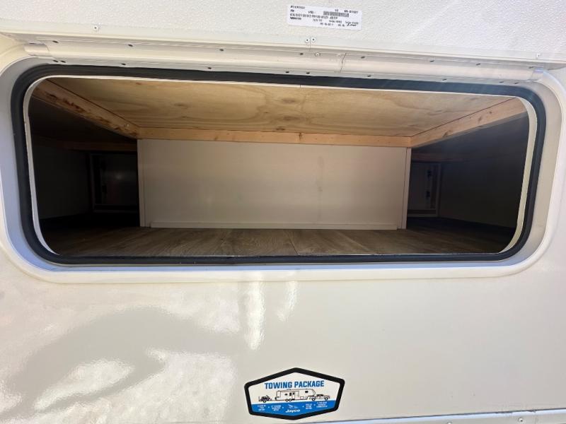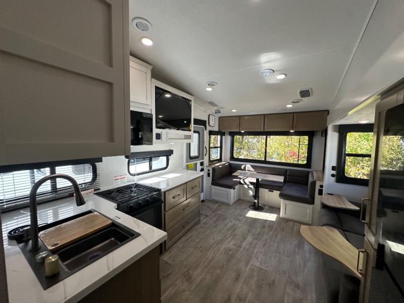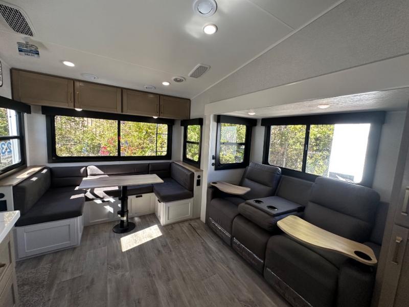 You'll have everything you need in this fifth wheel for enjoyable trips to the lake. Once you arrive at your destination, set up the 16' power awning, grab the fishing poles from the pass-through storage, and relax with a cold drink. And there is a Jayport with LP Quick Connect if you want to bring along your griddle. You and your group can head inside to play a game around the U-shaped dinette or relax on the theater seat across from the TV. The full kitchen includes a black and stainless 21" range, a GE microwave, plus a 12V refrigerator for perishables, and the full bath will let you clean up each day. When you're ready to call it a night, head to the front private bedroom for a great night's rest on the Olympic-size queen bed with dual wardrobes, while your guests sleep on the dinette!