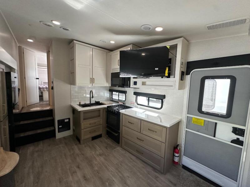 You'll have everything you need in this fifth wheel for enjoyable trips to the lake. Once you arrive at your destination, set up the 16' power awning, grab the fishing poles from the pass-through storage, and relax with a cold drink. And there is a Jayport with LP Quick Connect if you want to bring along your griddle. You and your group can head inside to play a game around the U-shaped dinette or relax on the theater seat across from the TV. The full kitchen includes a black and stainless 21" range, a GE microwave, plus a 12V refrigerator for perishables, and the full bath will let you clean up each day. When you're ready to call it a night, head to the front private bedroom for a great night's rest on the Olympic-size queen bed with dual wardrobes, while your guests sleep on the dinette!