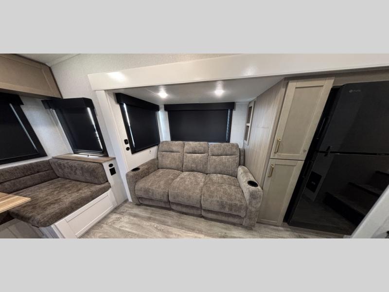 You'll have everything you need in this fifth wheel for enjoyable trips to the lake. Once you arrive at your destination, set up the 16' power awning, grab the fishing poles from the pass-through storage, and relax with a cold drink. And there is a Jayport with LP Quick Connect if you want to bring along your griddle. You and your group can head inside to play a game around the U-shaped dinette or relax on the theater seat across from the TV. The full kitchen includes a black and stainless 21" range, a GE microwave, plus a 12V refrigerator for perishables, and the full bath will let you clean up each day. When you're ready to call it a night, head to the front private bedroom for a great night's rest on the Olympic-size queen bed with dual wardrobes, while your guests sleep on the dinette!