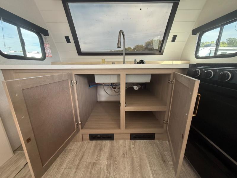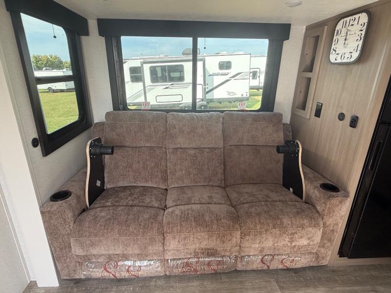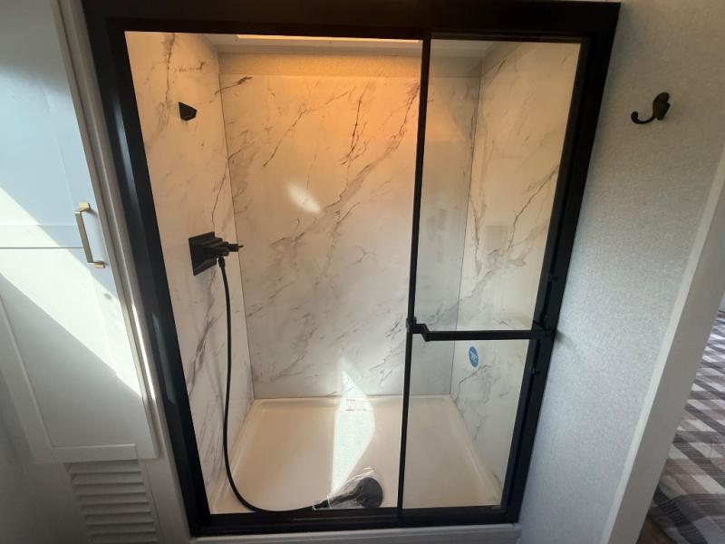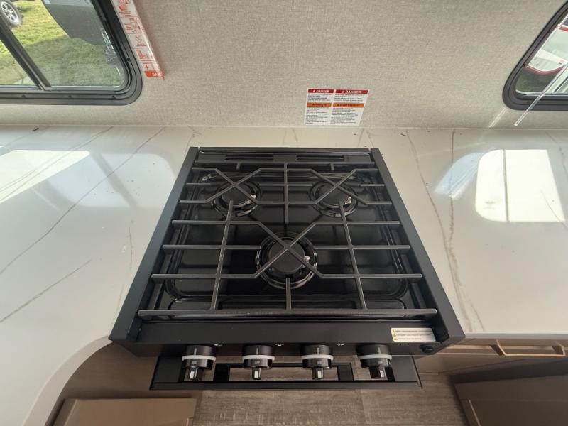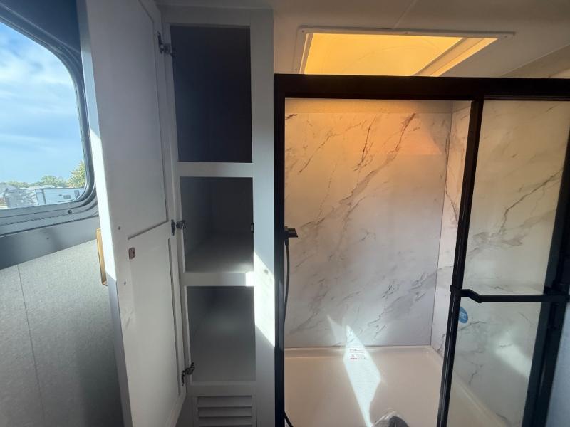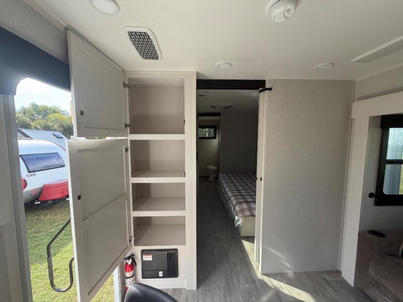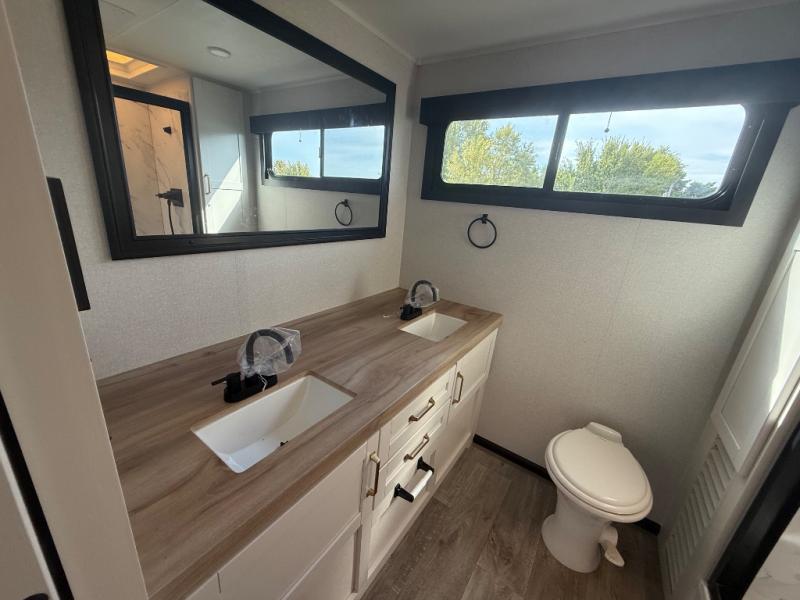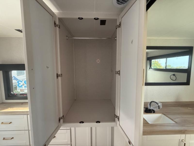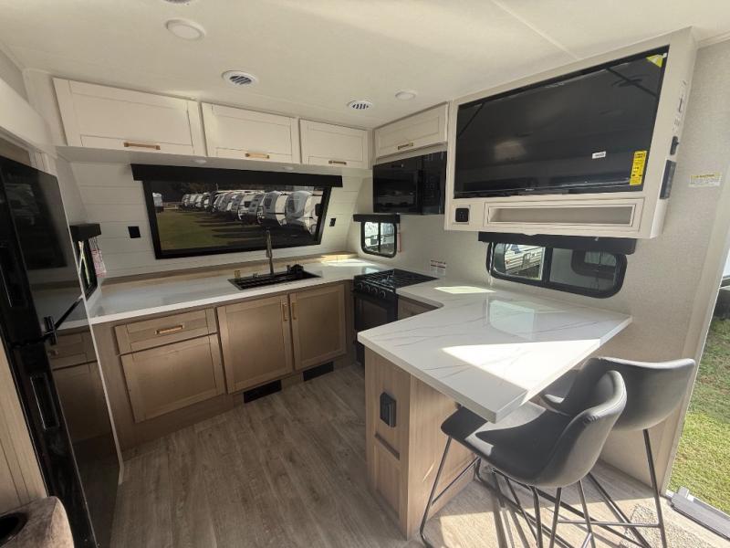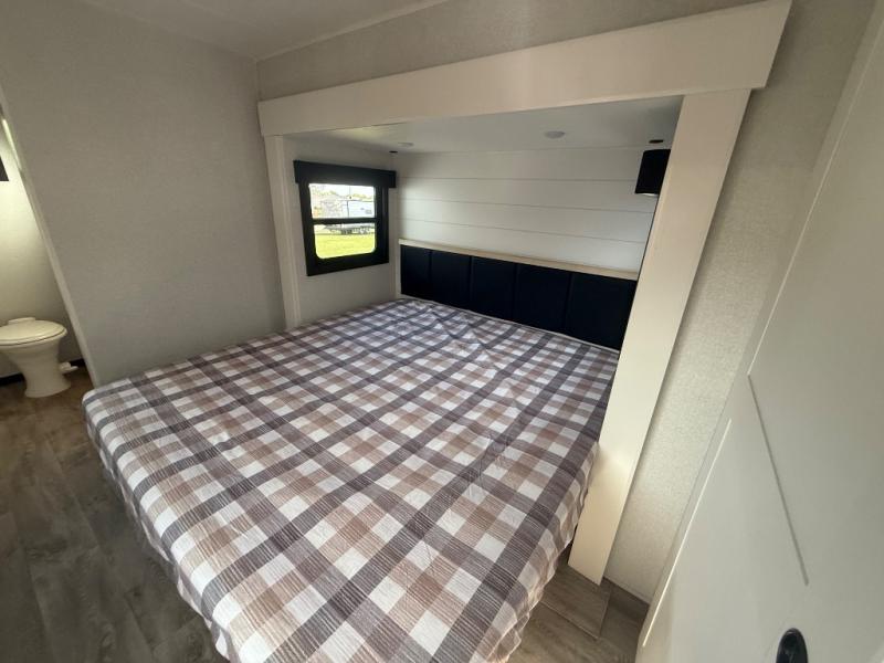 This is the perfect travel trailer for the couple who loves comfort at the campground! The front kitchen features ample counter space, including a bartop with barstool chairs and all the appliances to make your best meals. If you'd rather be outside, there is an outdoor kitchen and a power awning where you can spend your evenings. The master bedroom includes an Olympic-size queen bed slide out, a dresser, plus a wardrobe with washer and dryer prep. And don't overlook the full rear bath, complete with a 30" x 48" shower, a linen closet, and dual bath sinks so you both can get ready at the same time!