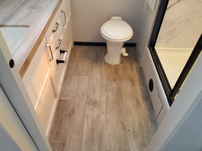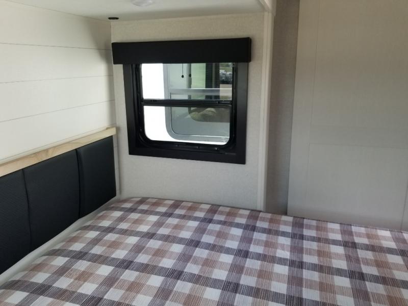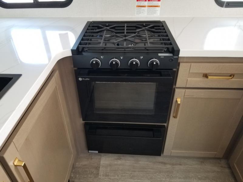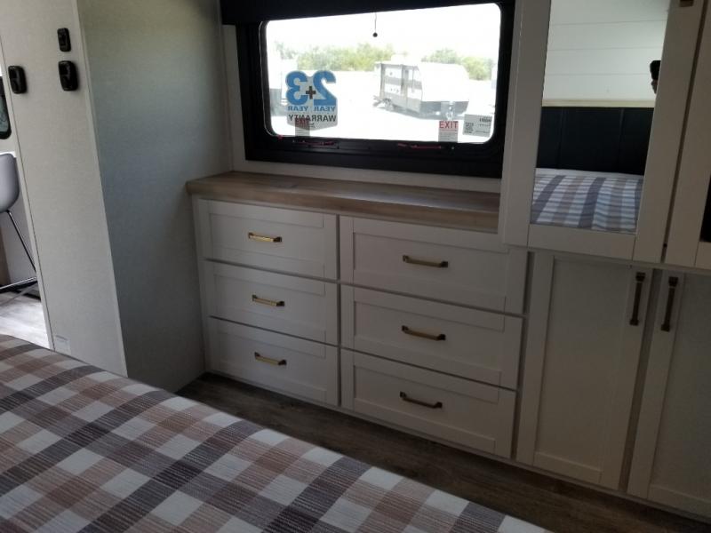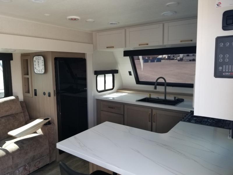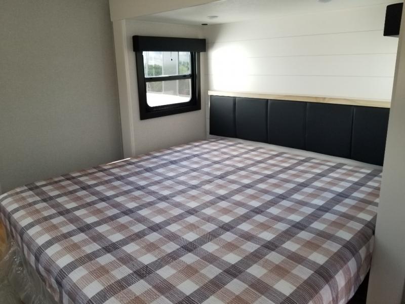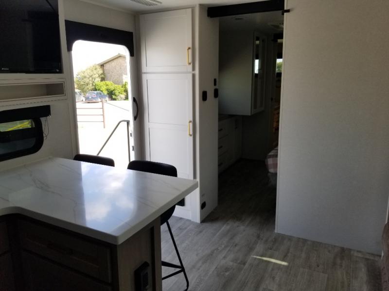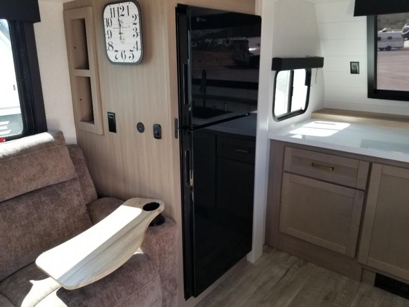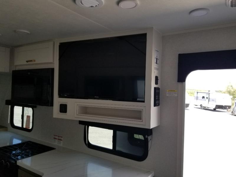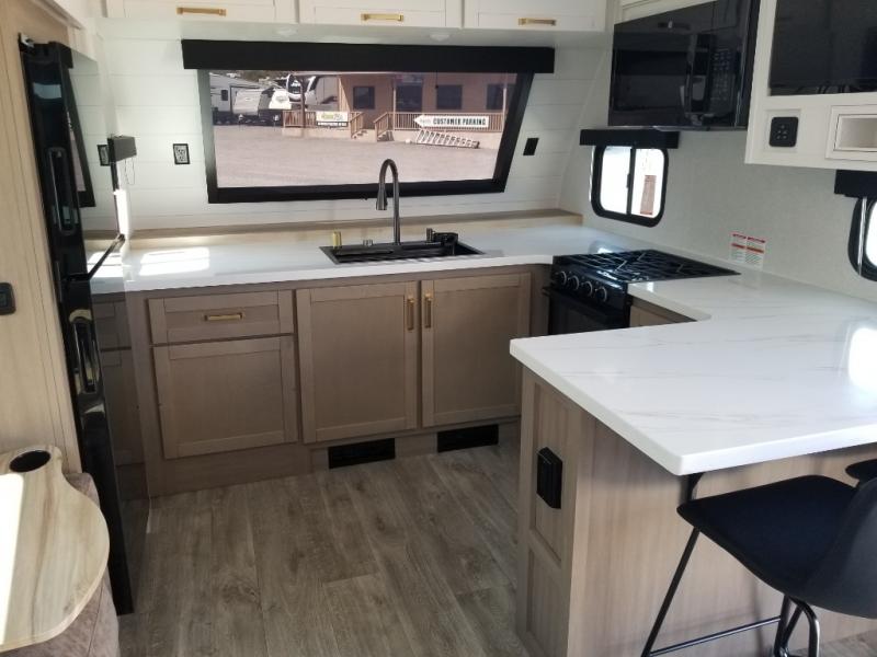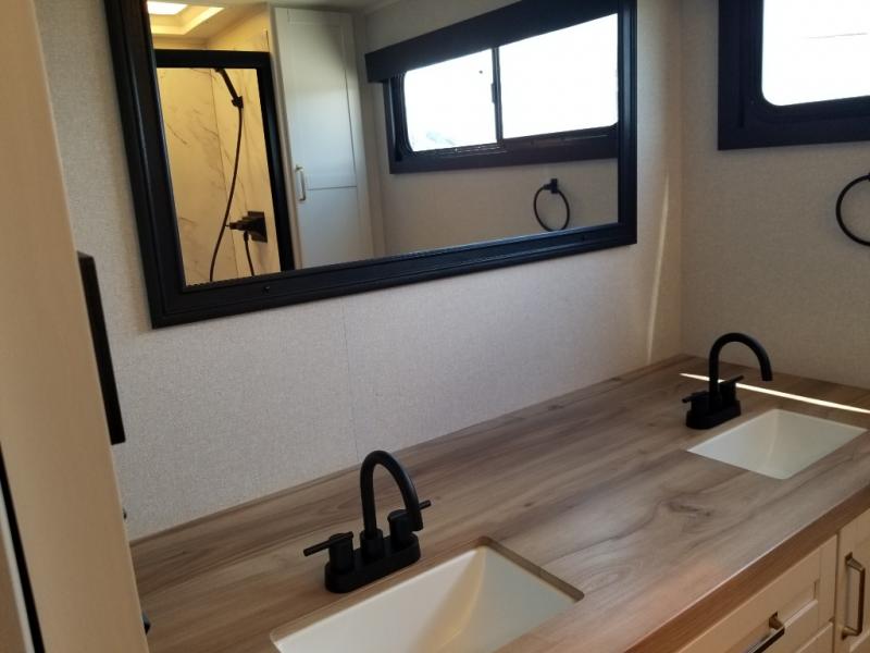 This is the perfect travel trailer for the couple who loves comfort at the campground! The front kitchen features ample counter space, including a bartop with barstool chairs and all the appliances to make your best meals. If you'd rather be outside, there is an outdoor kitchen and a power awning where you can spend your evenings. The master bedroom includes an Olympic-size queen bed slide out, a dresser, plus a wardrobe with washer and dryer prep. And don't overlook the full rear bath, complete with a 30" x 48" shower, a linen closet, and dual bath sinks so you both can get ready at the same time!
