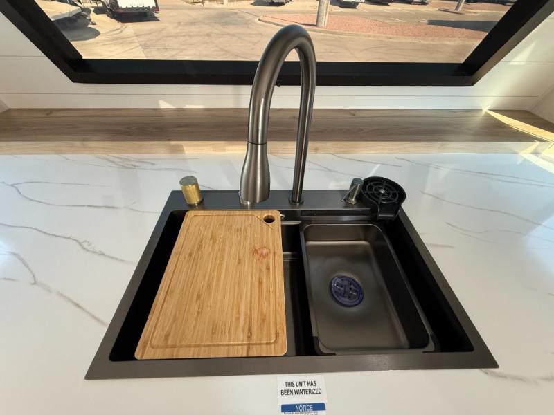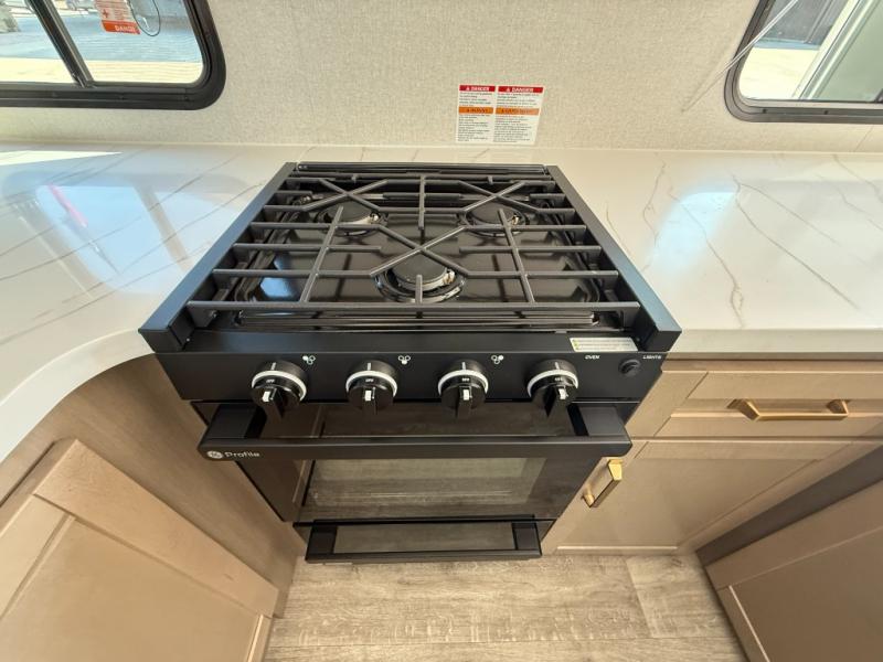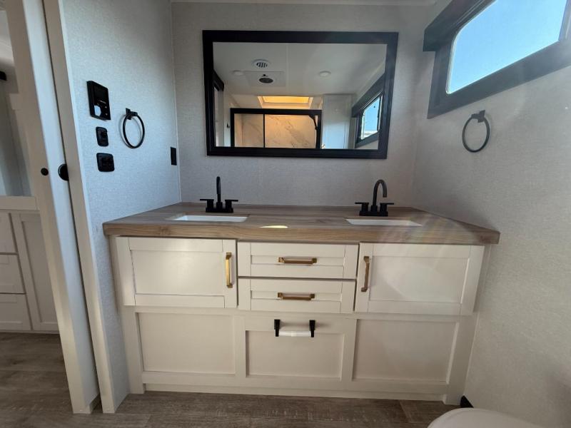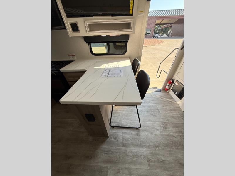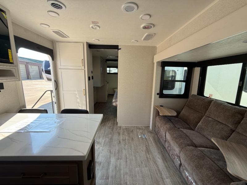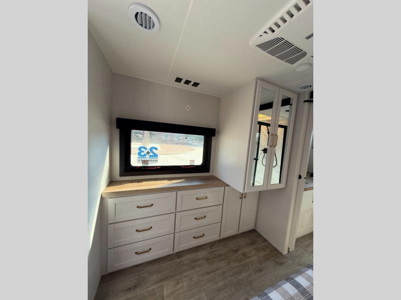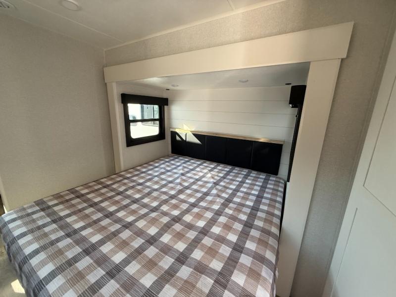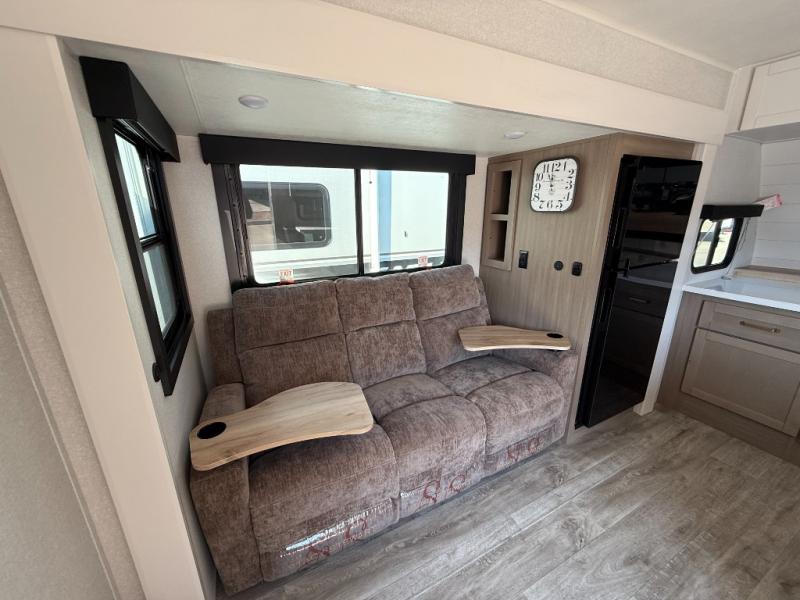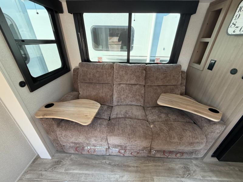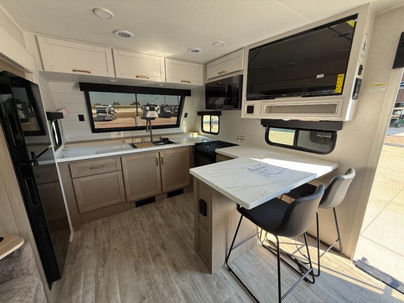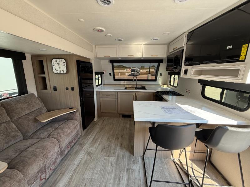 This is the perfect travel trailer for the couple who loves comfort at the campground! The front kitchen features ample counter space, including a bartop with barstool chairs and all the appliances to make your best meals. If you'd rather be outside, there is an outdoor kitchen and a power awning where you can spend your evenings. The master bedroom includes an Olympic-size queen bed slide out, a dresser, plus a wardrobe with washer and dryer prep. And don't overlook the full rear bath, complete with a 30" x 48" shower, a linen closet, and dual bath sinks so you both can get ready at the same time!