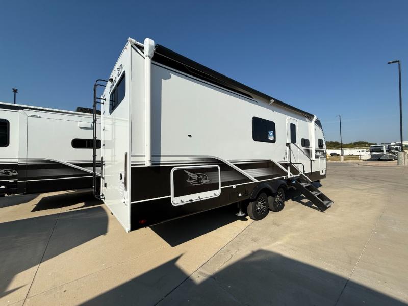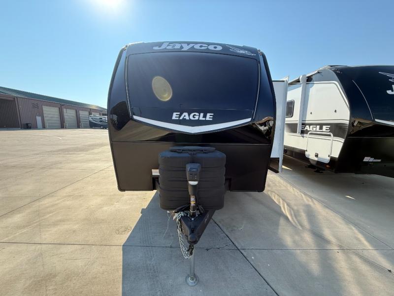 With any Eagle HT fifth wheel or travel trailer by Jayco you will enjoy a smooth drive thanks to the 4 Star Handling Package and MORryde CRE-3000 rubberized suspension. The Customer Value Package includes amenities that are sure to make camping easier than ever, like the 60K on-demand water heater, Keyed-Alike lock system, 15,000 BTU "Whisper Quiet" A/C, and more. Handcrafted door/drawer fronts will make your space feel more like home, along with residential vinyl flooring throughout, GE appliances, and blackout roller shades with reflective side throughout to keep the sun out when you want to sleep in. Each model also includes a NuVo H2O water treatment system with filters included, interior and exterior "Blue Sync" audio connect with MB Quart Sound for your TV and phone, and 100% no floor vents for added comfort and convenience!
