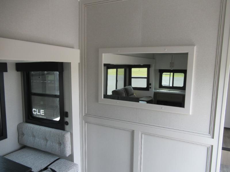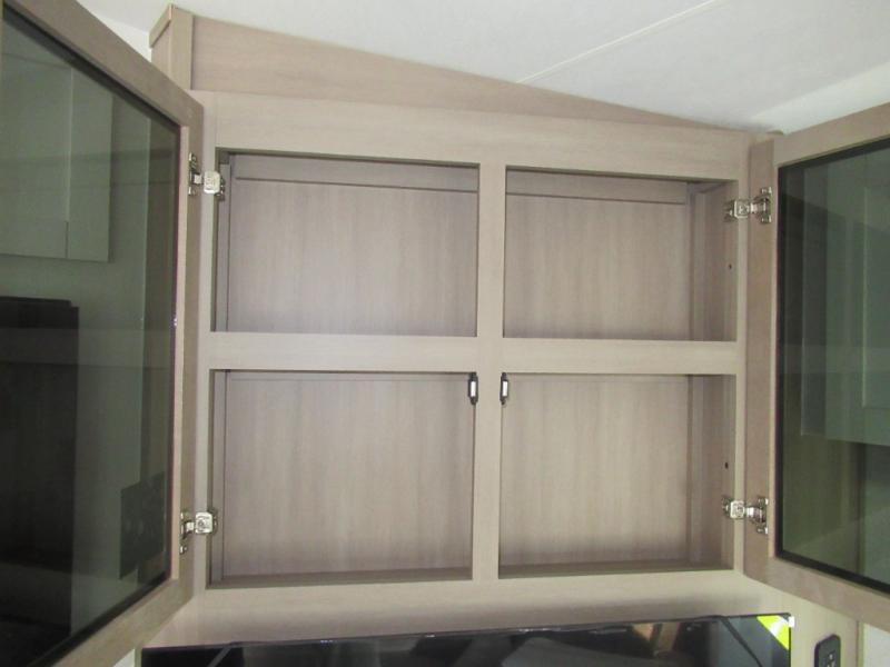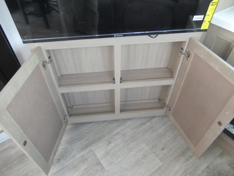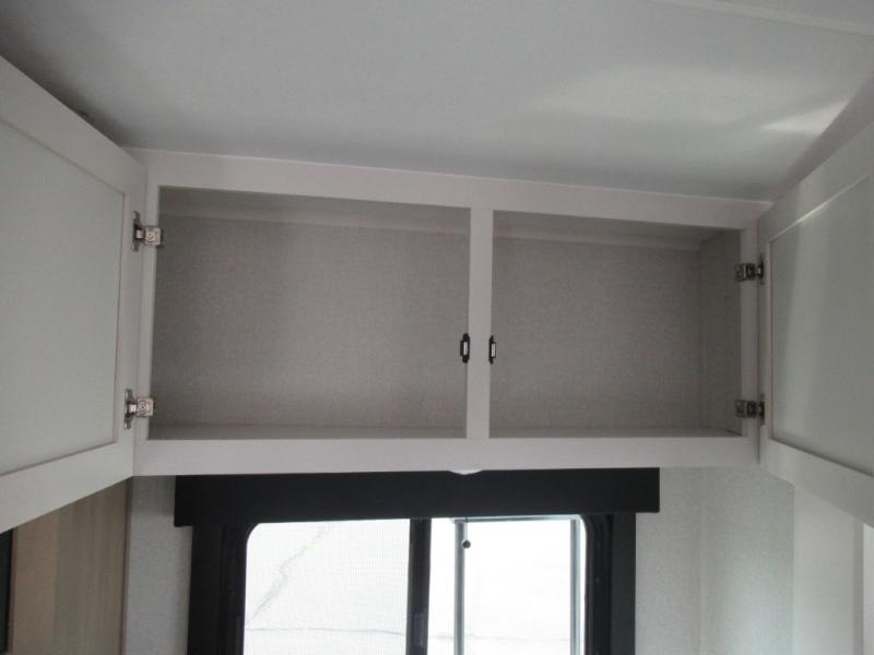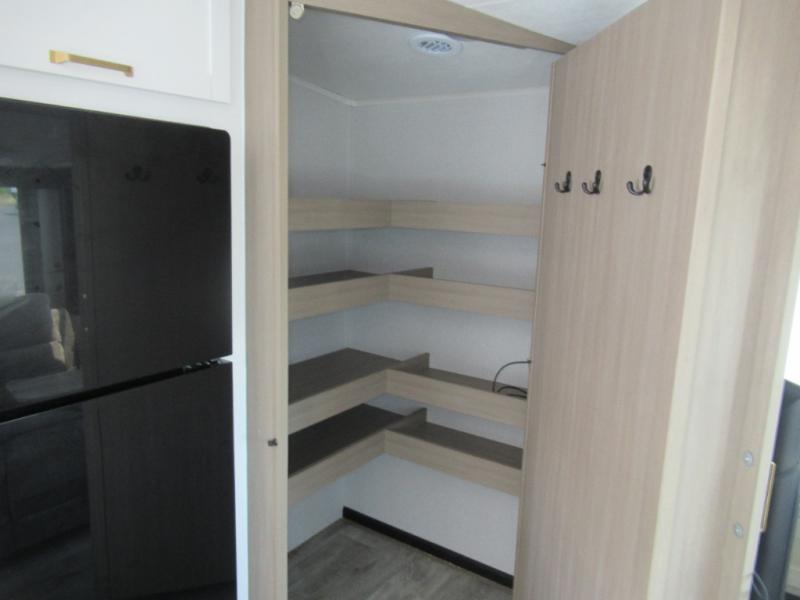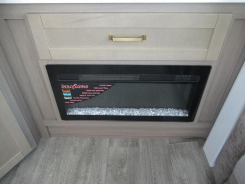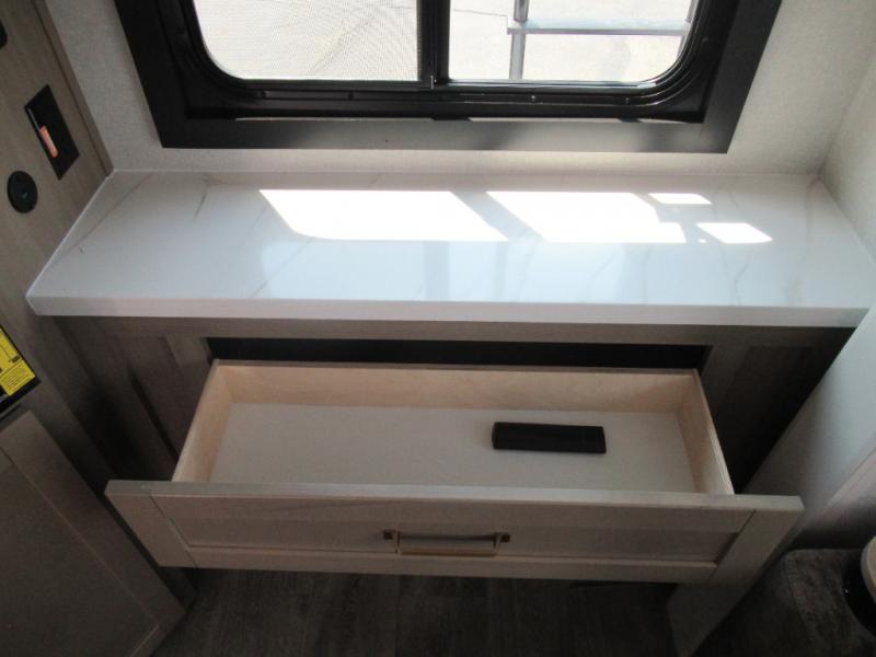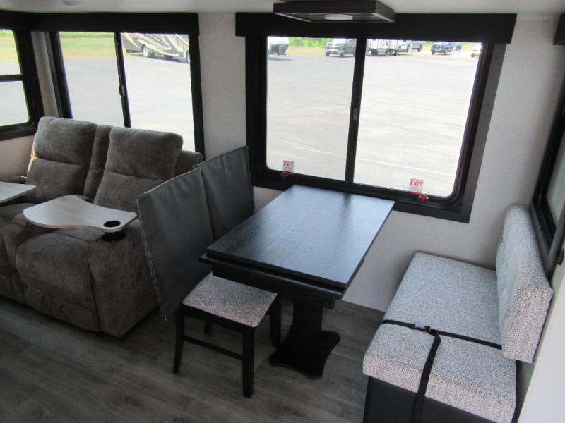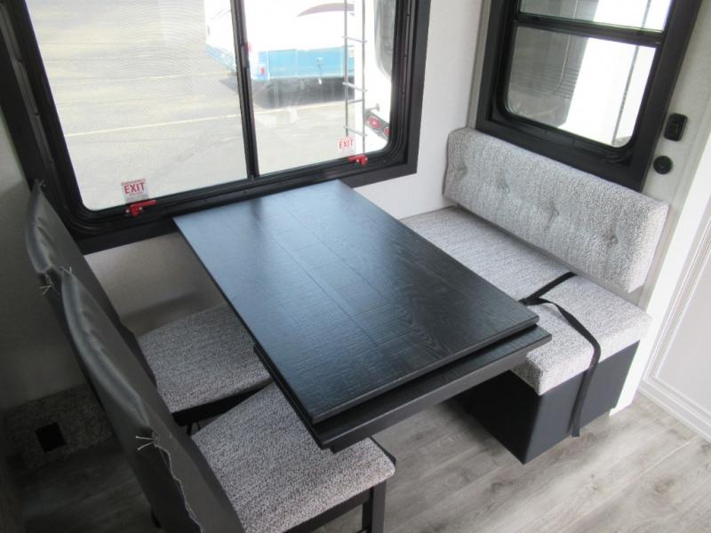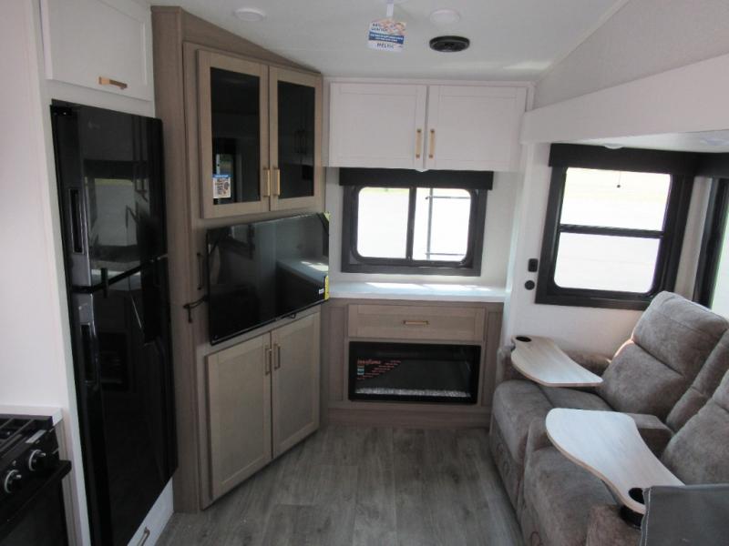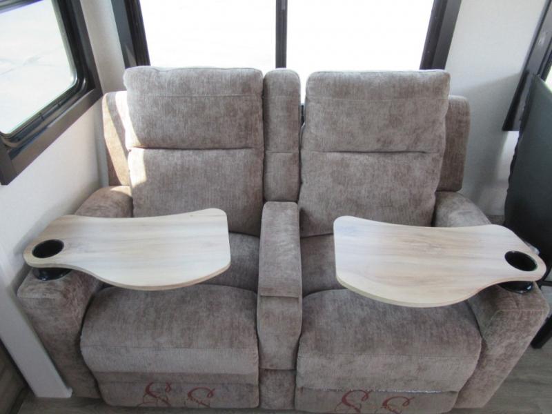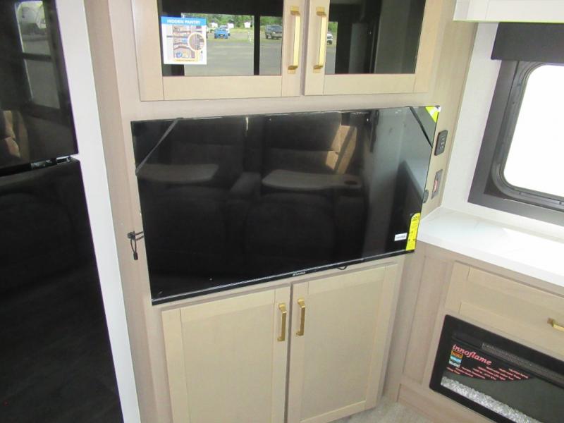 This is the perfect couple's fifth wheel since it features sleeping space for two up front! You can use the dual bedroom wardrobes to store your clothes in, and the full bath is close by so you can get ready each morning. After you've whipped up breakfast in the kitchen, you can dine at the table and chairs with bench seating, then relax with your coffee on the theater seat. There is an entertainment center across from the sofa for convenience, plus a hidden walk-in pantry behind the TV. You'll also love the fireplace, making it feel more like home!