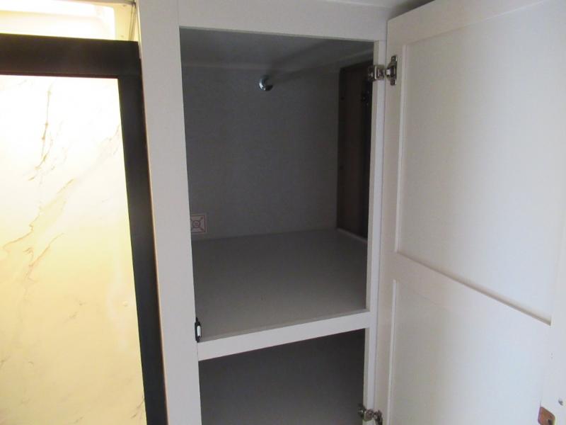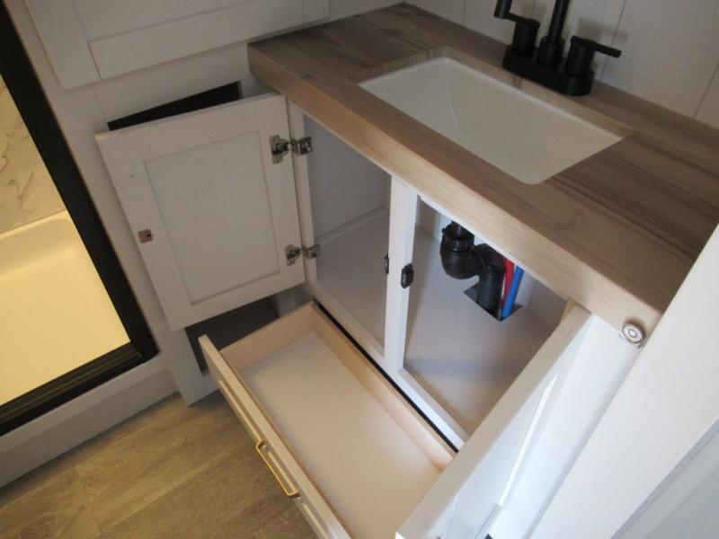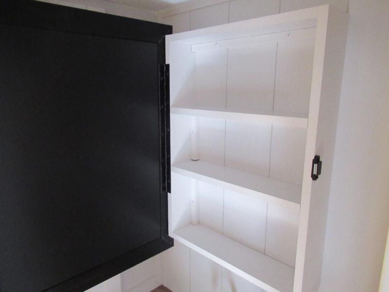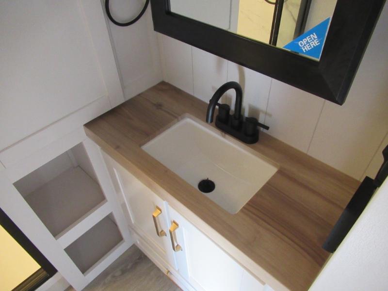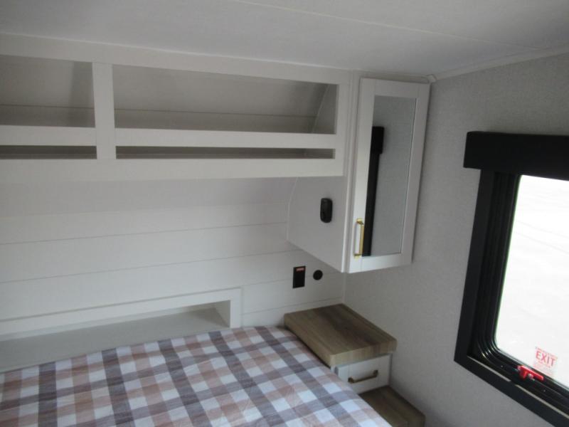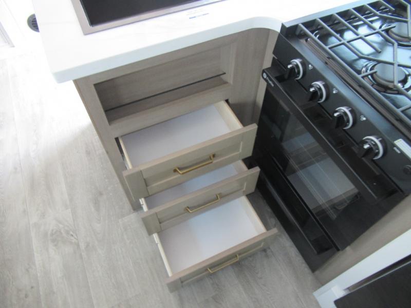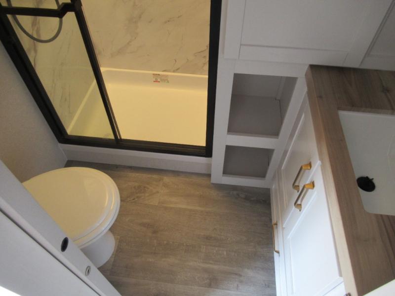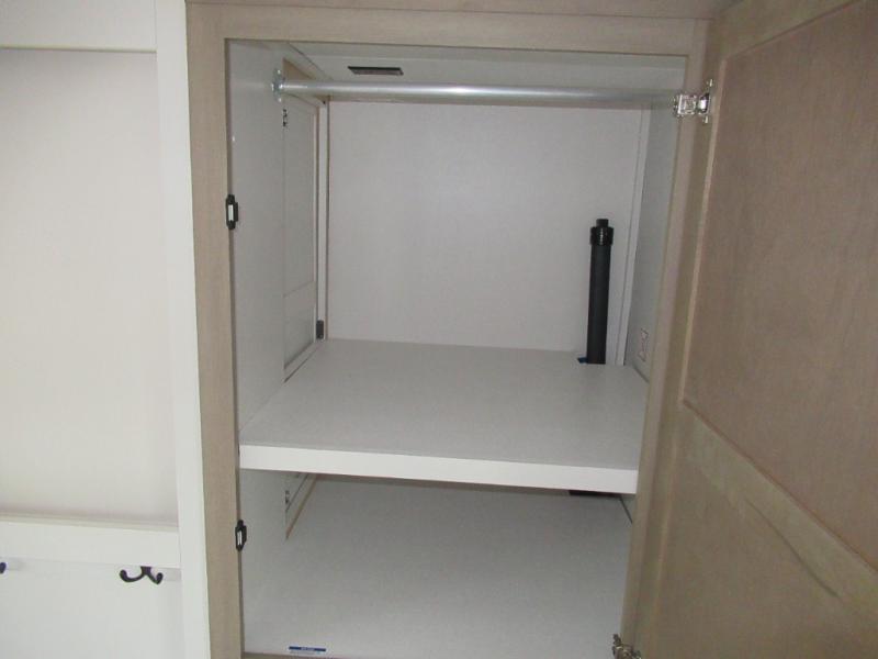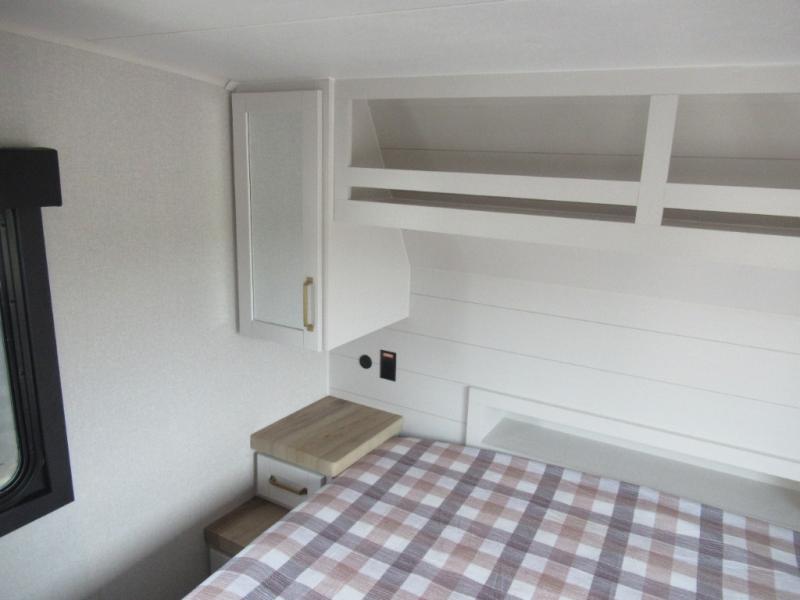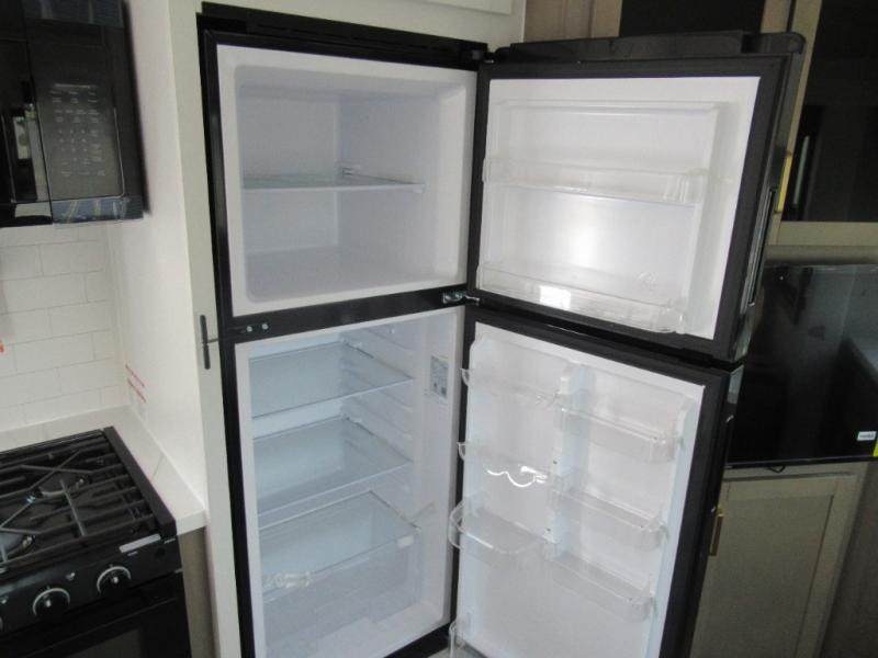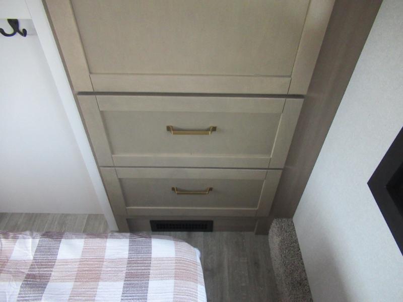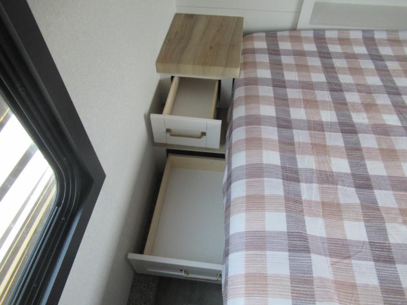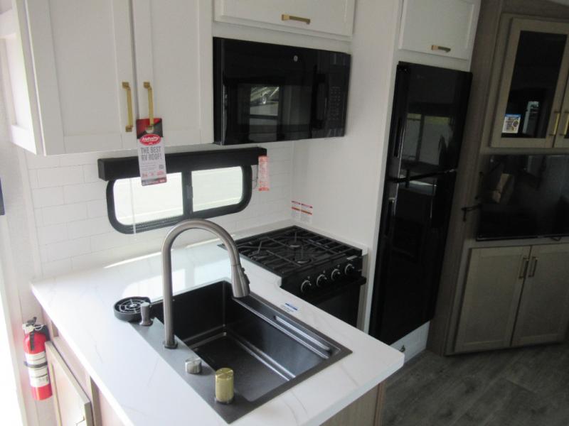 This is the perfect couple's fifth wheel since it features sleeping space for two up front! You can use the dual bedroom wardrobes to store your clothes in, and the full bath is close by so you can get ready each morning. After you've whipped up breakfast in the kitchen, you can dine at the table and chairs with bench seating, then relax with your coffee on the theater seat. There is an entertainment center across from the sofa for convenience, plus a hidden walk-in pantry behind the TV. You'll also love the fireplace, making it feel more like home!