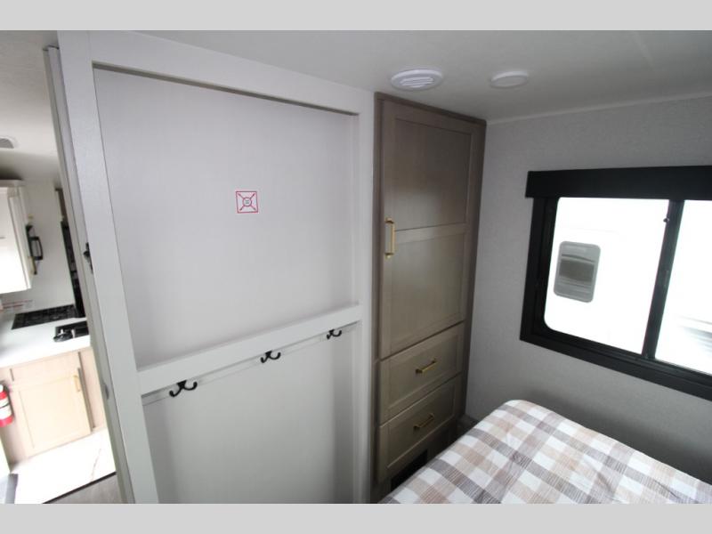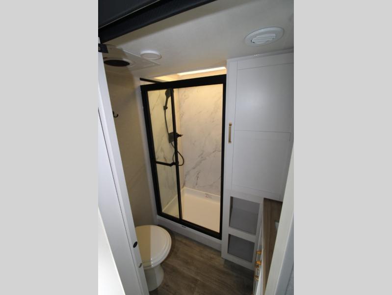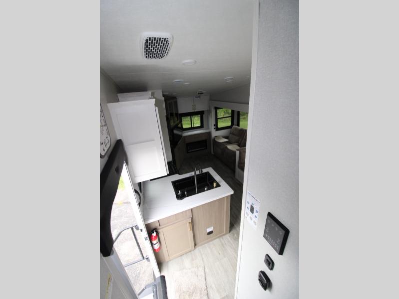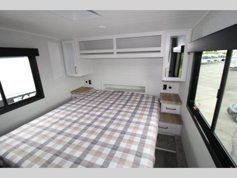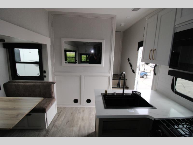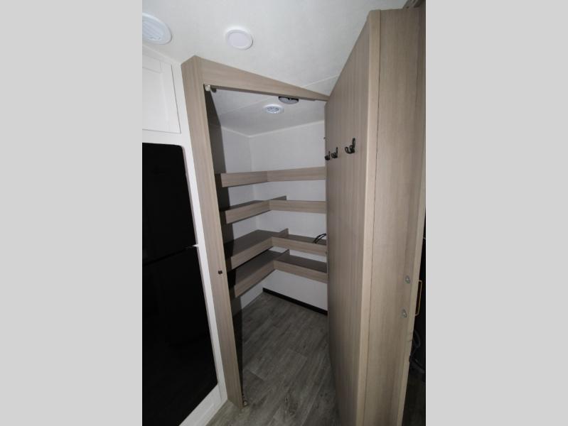 This is the perfect couple's fifth wheel since it features sleeping space for two up front! You can use the dual bedroom wardrobes to store your clothes in, and the full bath is close by so you can get ready each morning. After you've whipped up breakfast in the kitchen, you can dine at the table and chairs with bench seating, then relax with your coffee on the theater seat. There is an entertainment center across from the sofa for convenience, plus a hidden walk-in pantry behind the TV. You'll also love the fireplace, making it feel more like home!