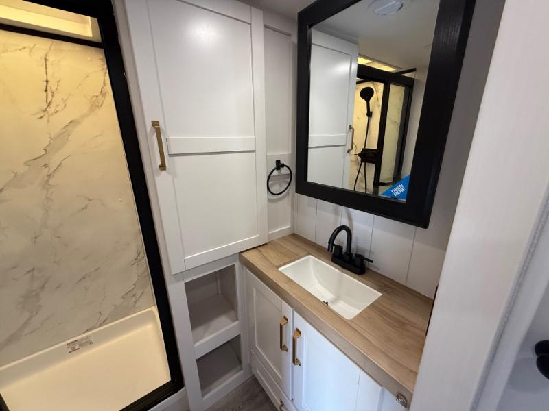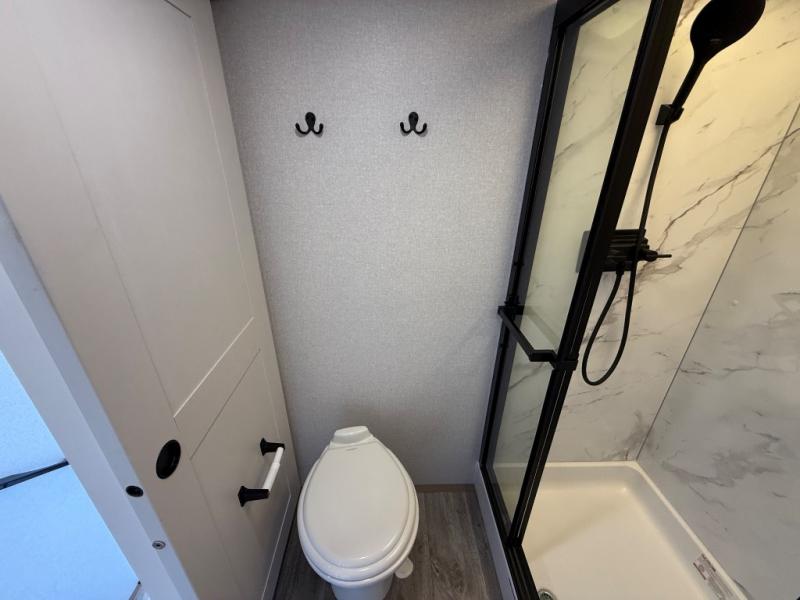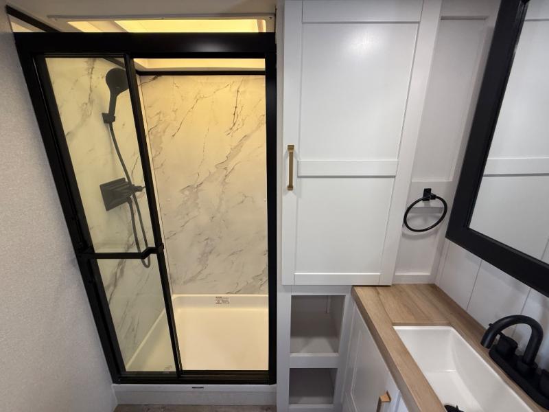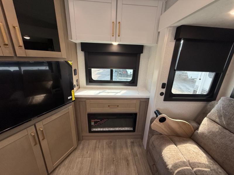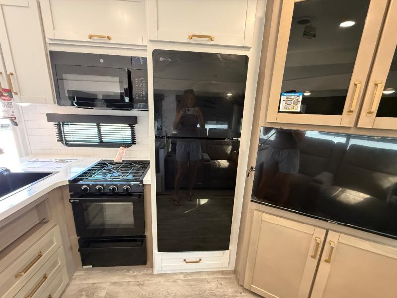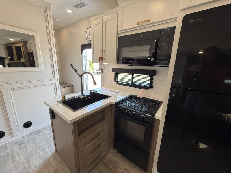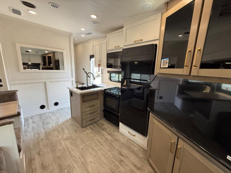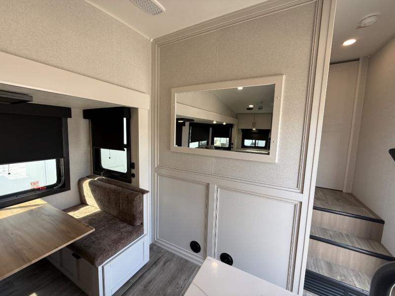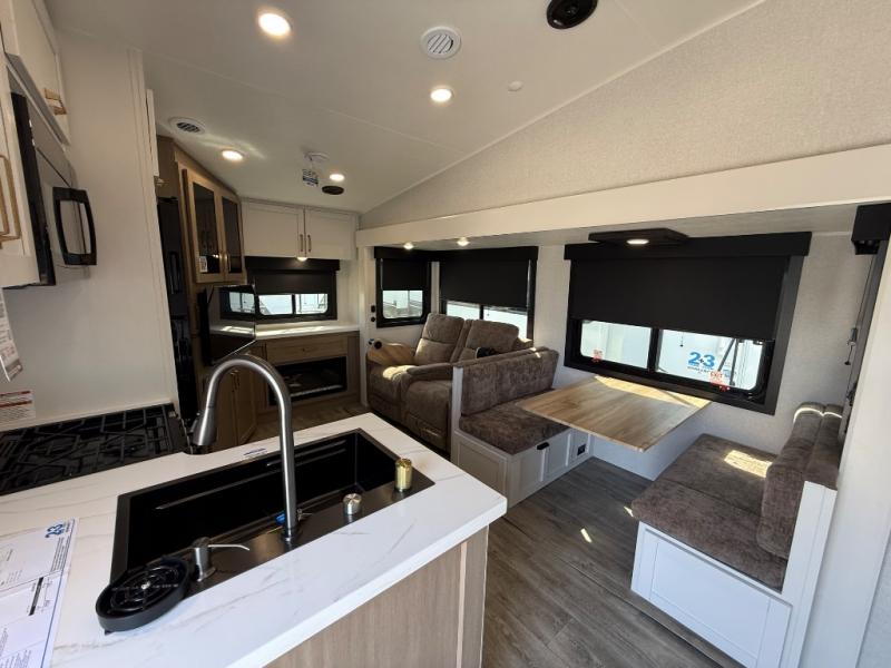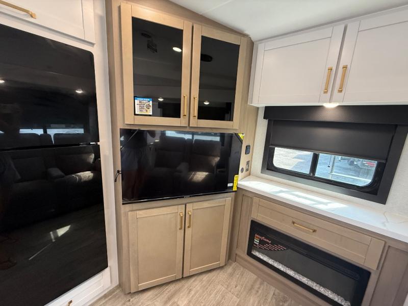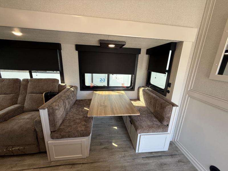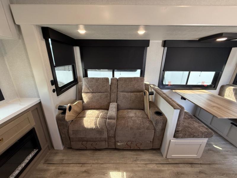 This is the perfect couple's fifth wheel since it features sleeping space for two up front! You can use the dual bedroom wardrobes to store your clothes in, and the full bath is close by so you can get ready each morning. After you've whipped up breakfast in the kitchen, you can dine at the table and chairs with bench seating, then relax with your coffee on the theater seat. There is an entertainment center across from the sofa for convenience, plus a hidden walk-in pantry behind the TV. You'll also love the fireplace, making it feel more like home!
