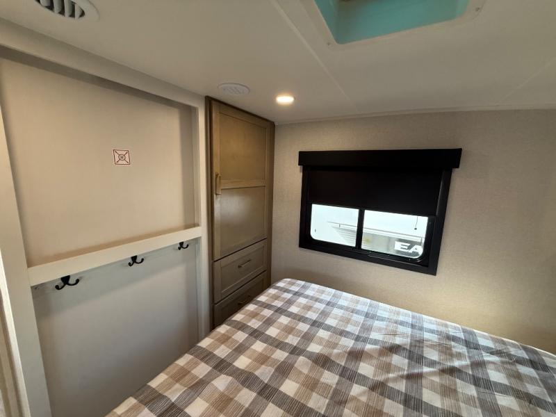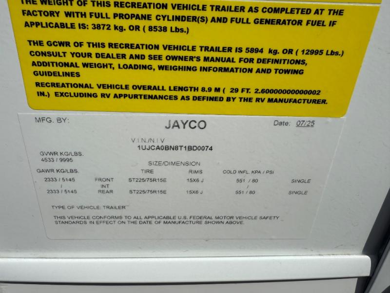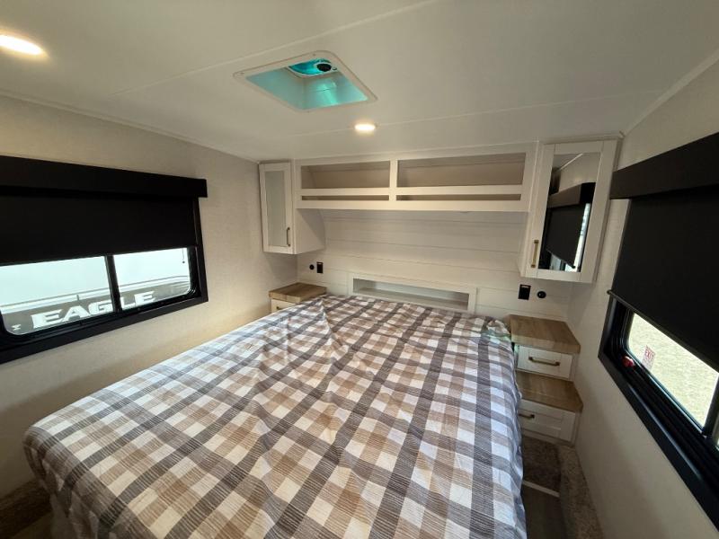 With any Eagle HT fifth wheel or travel trailer by Jayco you will enjoy a smooth drive thanks to the 4 Star Handling Package and MORryde CRE-3000 rubberized suspension. The Customer Value Package includes amenities that are sure to make camping easier than ever, like the 60K on-demand water heater, Keyed-Alike lock system, 15,000 BTU "Whisper Quiet" A/C, and more. Handcrafted door/drawer fronts will make your space feel more like home, along with residential vinyl flooring throughout, GE appliances, and blackout roller shades with reflective side throughout to keep the sun out when you want to sleep in. Each model also includes a NuVo H2O water treatment system with filters included, interior and exterior "Blue Sync" audio connect with MB Quart Sound for your TV and phone, and 100% no floor vents for added comfort and convenience!