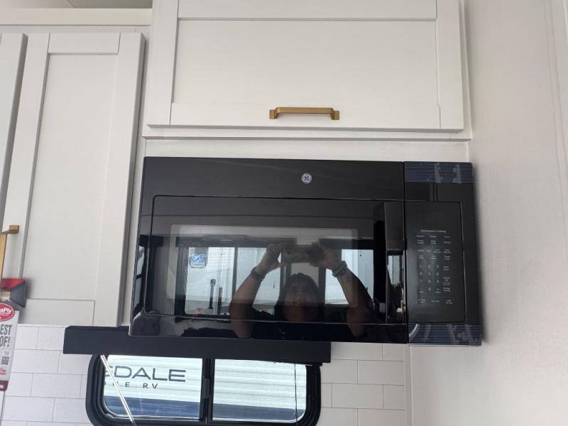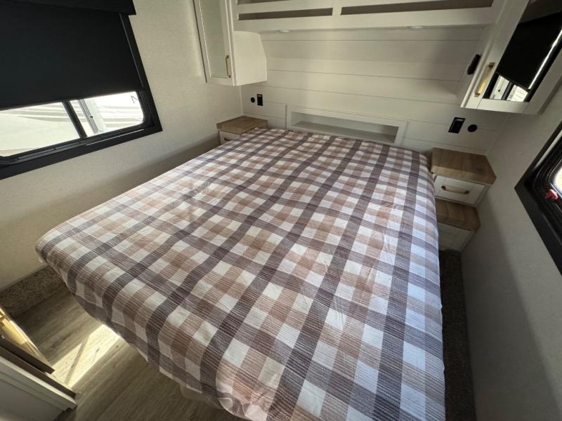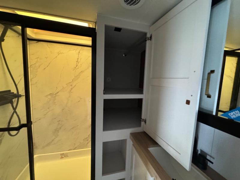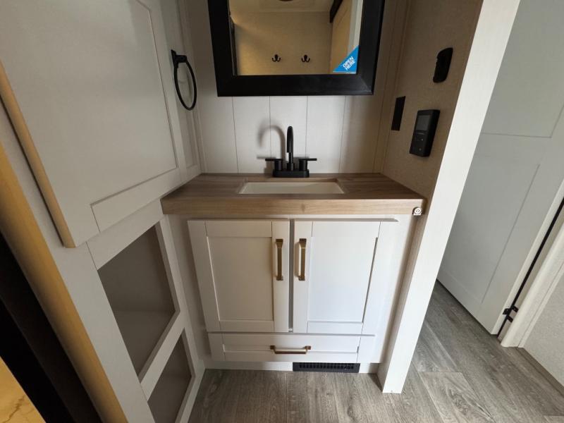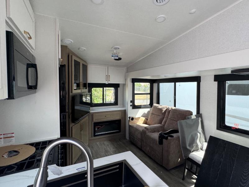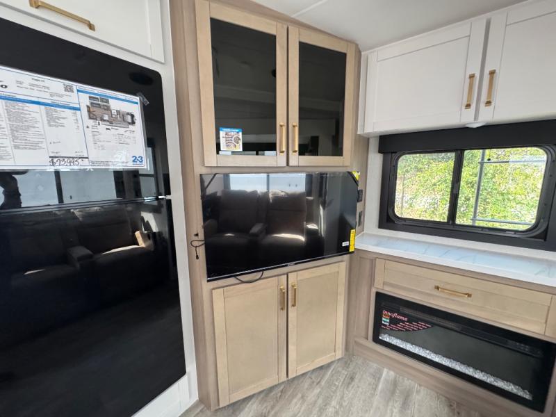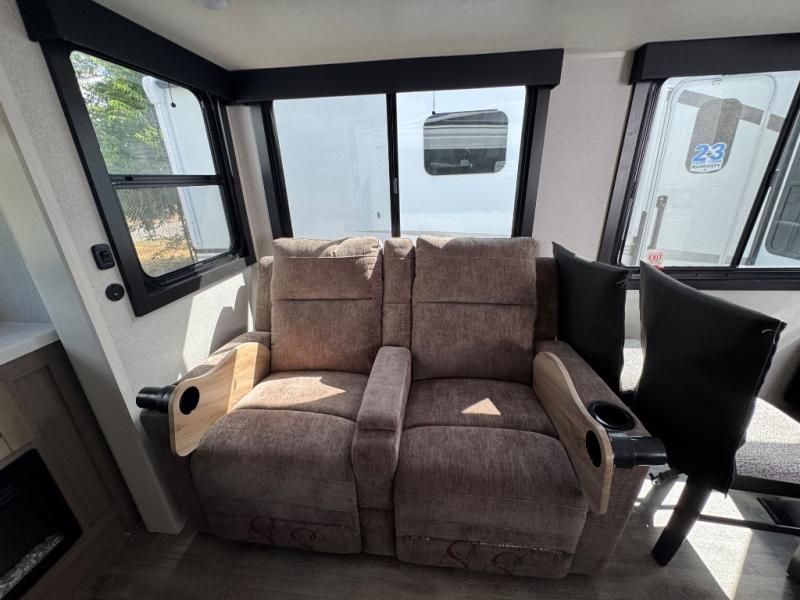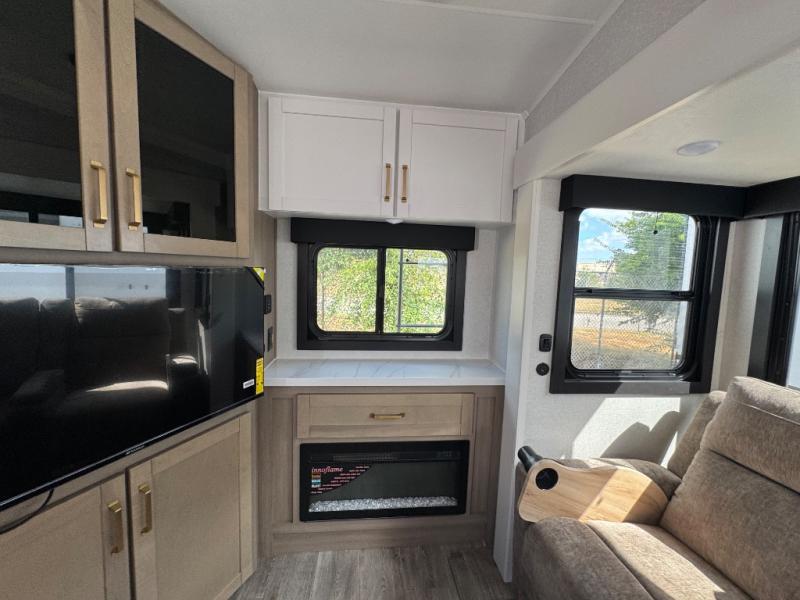 This is the perfect couple's fifth wheel since it features sleeping space for two up front! You can use the dual bedroom wardrobes to store your clothes in, and the full bath is close by so you can get ready each morning. After you've whipped up breakfast in the kitchen, you can dine at the table and chairs with bench seating, then relax with your coffee on the theater seat. There is an entertainment center across from the sofa for convenience, plus a hidden walk-in pantry behind the TV. You'll also love the fireplace, making it feel more like home!