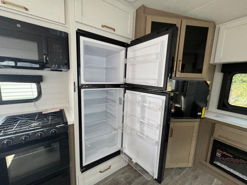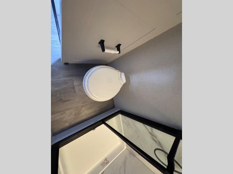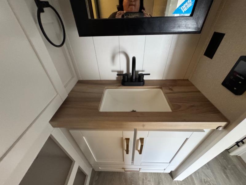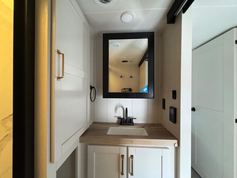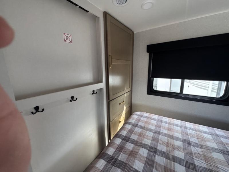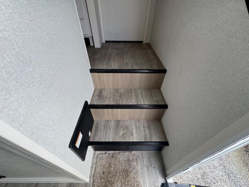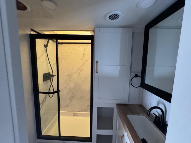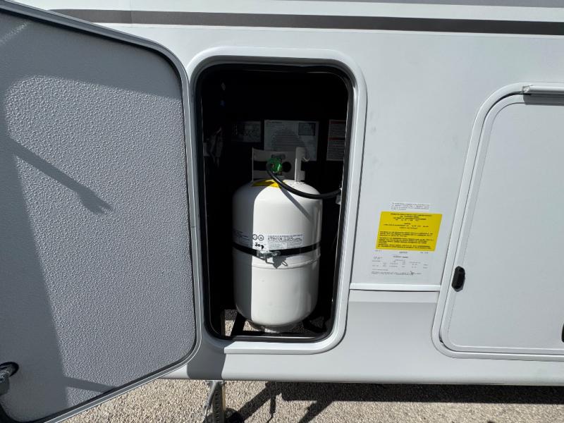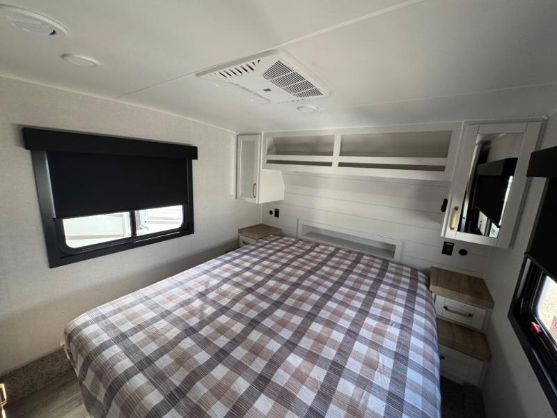 This is the perfect couple's fifth wheel since it features sleeping space for two up front! You can use the dual bedroom wardrobes to store your clothes in, and the full bath is close by so you can get ready each morning. After you've whipped up breakfast in the kitchen, you can dine at the table and chairs with bench seating, then relax with your coffee on the theater seat. There is an entertainment center across from the sofa for convenience, plus a hidden walk-in pantry behind the TV. You'll also love the fireplace, making it feel more like home!
