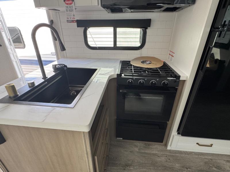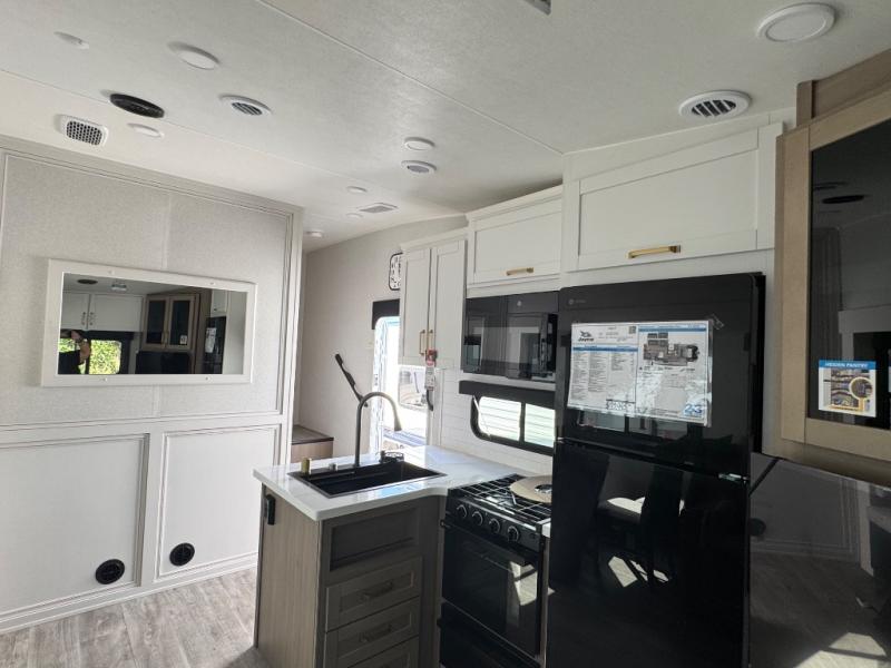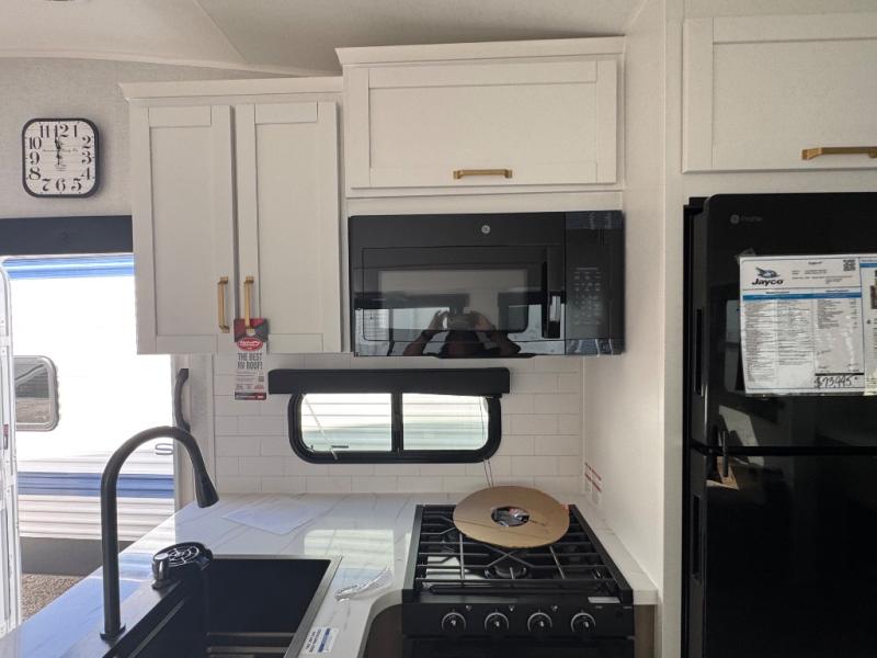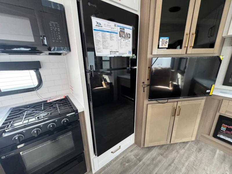 With any Eagle HT fifth wheel or travel trailer by Jayco you will enjoy a smooth drive thanks to the 4 Star Handling Package and MORryde CRE-3000 rubberized suspension. The Customer Value Package includes amenities that are sure to make camping easier than ever, like the 60K on-demand water heater, Keyed-Alike lock system, 15,000 BTU "Whisper Quiet" A/C, and more. Handcrafted door/drawer fronts will make your space feel more like home, along with residential vinyl flooring throughout, GE appliances, and blackout roller shades with reflective side throughout to keep the sun out when you want to sleep in. Each model also includes a NuVo H2O water treatment system with filters included, interior and exterior "Blue Sync" audio connect with MB Quart Sound for your TV and phone, and 100% no floor vents for added comfort and convenience!