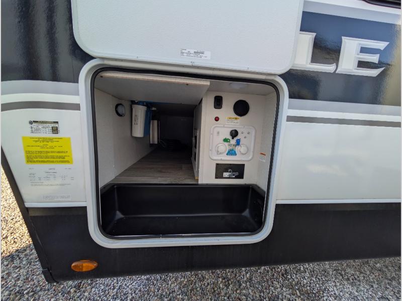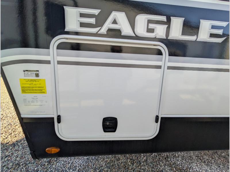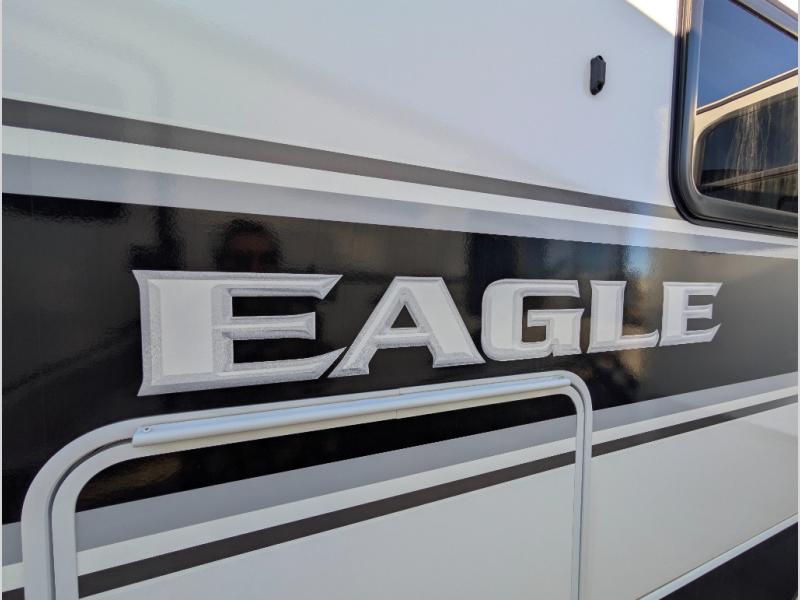 With any Eagle HT fifth wheel or travel trailer by Jayco you will enjoy a smooth drive thanks to the 4 Star Handling Package, Goodyear Endurance tires, and MORryde CRE-3000 rubberized suspension. The Customer Value Package includes amenities that are sure to make camping easier than ever, like the 60K on-demand water heater, Keyed-Alike lock system, 15,000 BTU "Whisper Quiet" A/C, and more. Handcrafted and glazed door/drawer fronts will make your space feel more like home, along with residential vinyl flooring throughout, GE appliances, and blackout roller shades with reflective side throughout to keep the sun out when you want to sleep in. Each model also includes a NuVo H2O water treatment system with filters included, interior and exterior "Blue Sync" audio connect with MB Quart Sound for your TV and phone, and 100% no floor vents for added comfort and convenience!