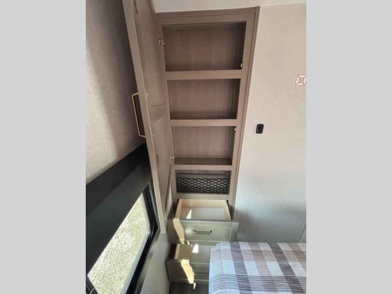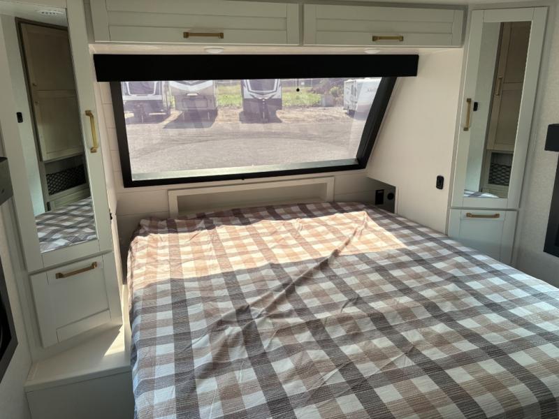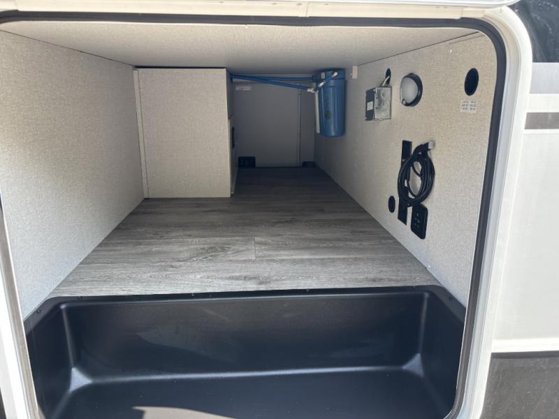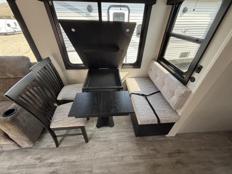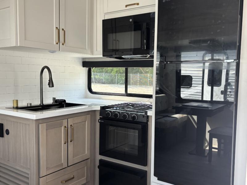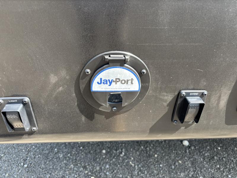There's a lot to love about this travel trailer, from the full rear bath to the front private bedroom with an Olympic queen-size bed! The tri-fold sofa with cup holders will provide a comfy place to relax, and there is a table with chairs and a bench to dine at, and both of these pieces of furniture are within a large slide out for more floor space. The fully-equipped kitchen comes with a GE microwave and 21 in. range plus a GE 10 cu. ft. 12V refrigerator and walk-in pantry for food storage. And an exterior Jayport with LP Quick Connect and hot/cold water makes it possible to hook up your own grill!