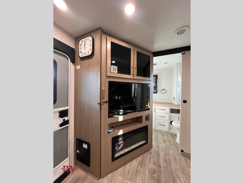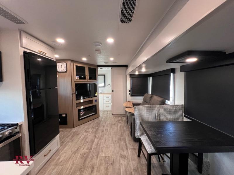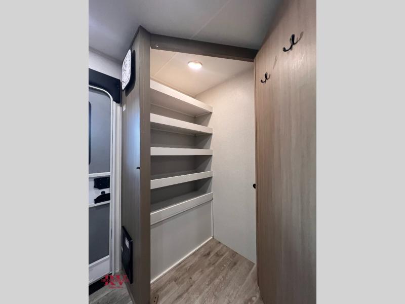 There's a lot to love about this travel trailer, from the full rear bath to the front private bedroom with an Olympic queen-size bed! The tri-fold sofa with cup holders will provide a comfy place to relax, and there is a table with chairs and a bench to dine at, and both of these pieces of furniture are within a large slide out for more floor space. The fully-equipped kitchen comes with a GE microwave and 21 in. range plus a GE 10 cu. ft. 12V refrigerator and walk-in pantry for food storage. And an exterior Jayport with LP Quick Connect and hot/cold water makes it possible to hook up your own grill!